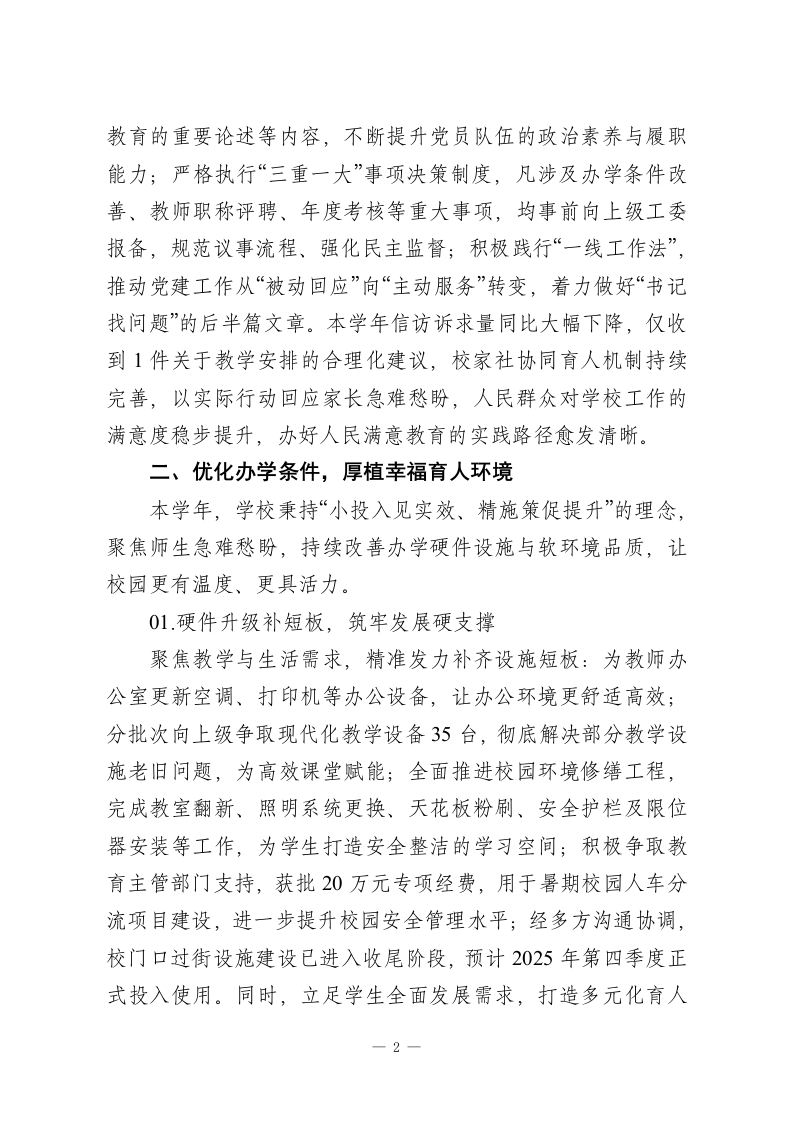 2025年度学校班子述职报告:风霜砥砺壮志未曾稍减,日积月累尽览盛景无边尊敬的各位领导、老师们:大家好!时序更替,华章日新,在深耕细作的忙碌中,2025年度已近尾声。教育的真谛,在于以初心浇灌成长,以笃行续写担当:学校的发展,离不开每一位教育者的同心筑梦、携手前行。与同志们并肩耕耘的时光里,大家的敬业坚守、务实奋进深深感染着我。回望这一年,每一步足迹都凝聚着汗水,每一项成果都闪耀着微光,在此,我谨代表学校班子,向辛勤付出的全体同仁致以最诚挚的感谢:大家辛苦了!下面,我就本学年学校工作情况向大会作详细汇报。本学年,在教育主管部门的正确领导下,学校班子始终秉持“为党育人,为国育才”的初心使命,团结带领全体师生凝心聚力、守正创新、锐意进取,各项工作稳中有进、提质增效,逐步构建起高质量发展的良好生态,学校可持续健康发展根基持续夯实。主要工作成效体现在以下四个方面:一、党建引领强根基,精准赋能促发展学校始终将党建工作置于统领地位,以习近平新时代中国特色社会主义思想为指导,持续深化师生思想政治教育。通过常态化开展党员大会、主题党日活动、专题党课等,扎实推进党纪学习教育,组织党员同志系统学习《中国共产党党员教育管理条例》《中国共产党纪律处分条例》及习近平总书记关于—1