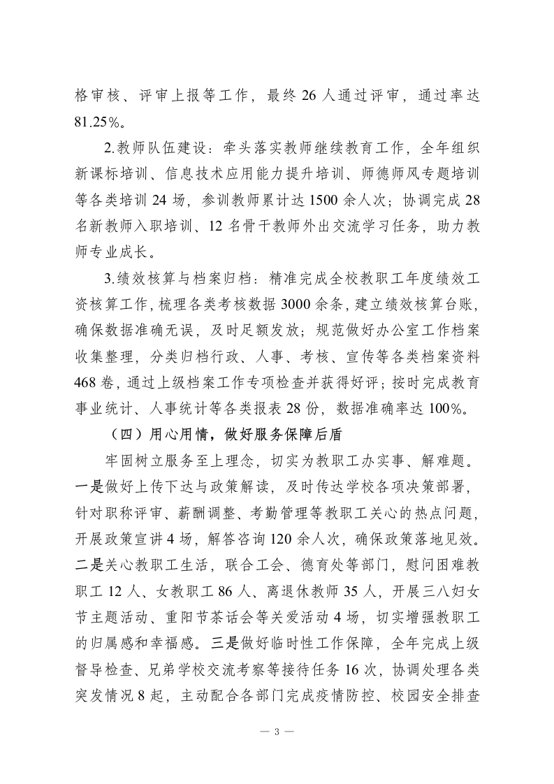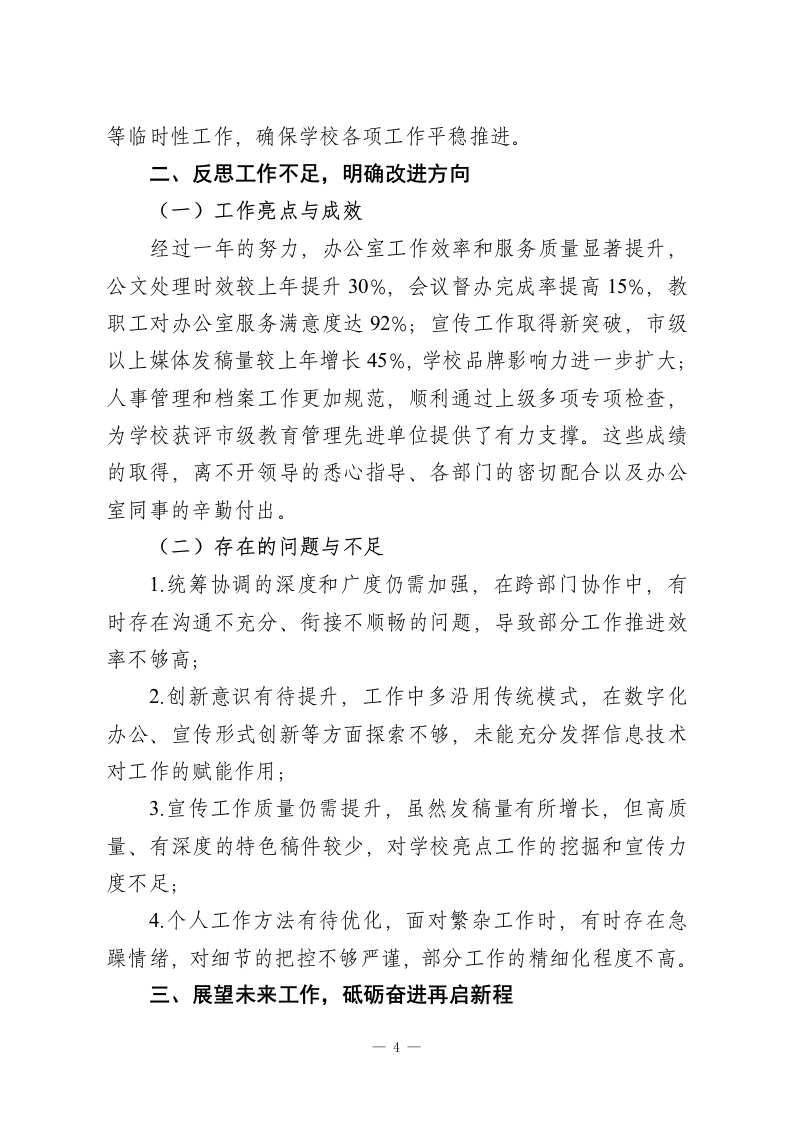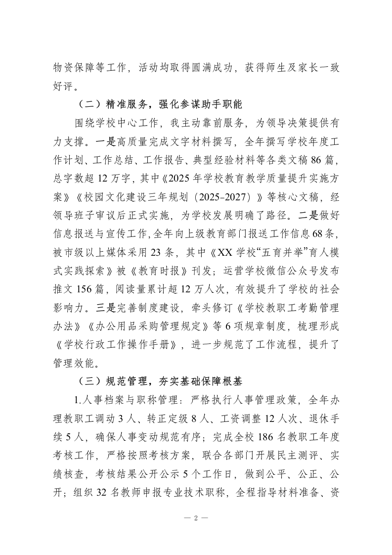 2025年度学校办公室主任述职报告:以服务为基,以实干为要2025年,在学校领导班子的正确引领下,在各处室、年级组及全体教职工的大力支持与密切配合下,我始终秉持服务大局、求真务实、精益求精的工作理念,紧扣学校立德树人、提质增效的年度核心目标,认真履行办公室统筹协调、参谋助手、服务保障的岗位职责,在繁杂琐碎的工作中锤炼能力,在攻坚克难的过程中提升效能,较好地完成了各项工作任务。现将本年度工作情况述职如下,请予评议。一、聚焦主责主业,扎实推进各项工作落地见效(一)统筹协调,筑牢行政运转中枢办公室作为学校行政工作的总开关,我始终坚持以高效运转为目标,精准做好统筹协调。一是规范会议管理,全年牵头组织各类会议42场,其中行政办公会18场、教职工大会6场、专题工作研讨会12场、对外协调会6场,严格落实会前议题审核、会中精准记录、会后清单督办机制,撰写会议纪要42份,梳理重点工作任务156项,跟踪督办完成率达98%,确保会议精神落地生根。二是优化公文处理,建立收文-登记-拟办-传阅-督办-归档全流程闭环管理,全年收发各类文件312份,其中上级来文186份、校内文件126份,做到当日签收、3日内流转、急件即办,确保政令畅通。三是做好重大活动保障,牵头筹备学校建校XX周年系列活动、秋季开学仪式、期未总结表彰大会等大型活动8场,协调各部门完成方案制定、人员调度、一1