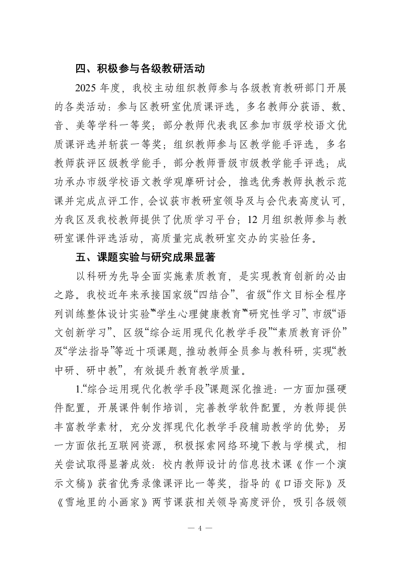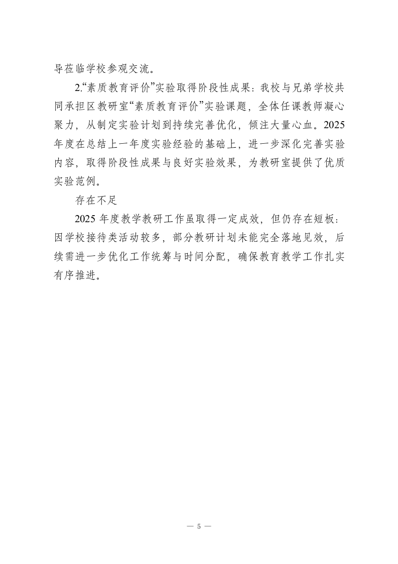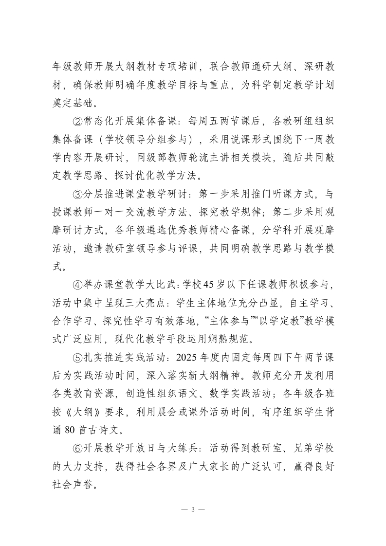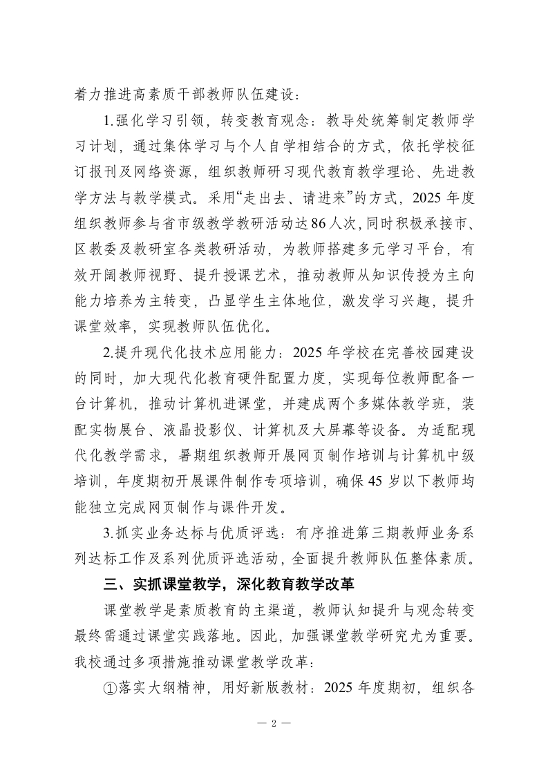2025年度学校教学教研工作总结:教研赋能课堂,实干护航成长2025年度,在教研室及学校领导的正确领导下,我校教学教研工作稳步提质、再上新阶。我们围绕“科研先导,德育为首,教学为主,育人为本,全面发展”的办学宗旨,深化“科研促教工程、名师带动工程和教育现代化工程”,完善“三维立体式”教学体系,依据国家九年义务教育教学内容,结合我校办学特色,以培养学生的创新精神和实践能力为重点,有力推动了素质教育的全面实施。一、教学常规管理加强常规管理是落实教育计划的根本保证。2025年度内,我们始终严格落实教委制定的《教学常规》各项规定,按要求规范组织教学工作。年初精准制定年度教学教研工作计划,持续坚持领导听课评课制度、周三业务学习制度、周五集体备课制度及期中期未检查制度,强化过程性管理,确保学校教育教学工作扎实高效推进。二、建设一支高素质的教师队伍提高教育教学质量,教师是核心关键。现代化教育呼唤高素质教师队伍,以培养学生创新精神和实践能力为核心的素质教育,要求教师从“经验型”转向“科研型”、从“知识型”转向“学者型”。教师需具备先进教育观念、较高理论水平、娴熟课堂驾驭艺术,同时掌握现代教育技术,能熟练使用和制作课件,运用网络引导学生开展探究性学习,以适配现代化教育需求。为此,我校1
