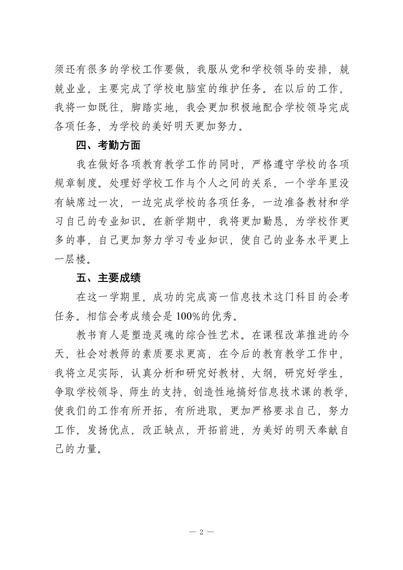 高中信息技术教师履职总结篇3一、思想认识我在思想上严于律己,热爱党的教育事业,全面贯彻党的教育方针,以党员的要求严格要求自己,鞭策自己,力争思想上和工作上在同事、学生的心目中都树立起榜样的作用,二、教学工作在教学工作方面,整学期的教学任务都非常重,独自一人担任高中8个班级的信息技术课,一周课时高达17节,但不管怎样,为了把自己的教学水平提高,我坚持经常看电脑报、信息技术奥赛书籍等,还经常网上找一些优秀的教案课件学习,还争取机会多出外听课,从中学习别人的长处,领悟其中的教学艺术。平时还虚心请教有经验的老师。在备课过程中认真分析教材,根据教材的特点及学生的实际情况设计教案。一学期来,认真备课、上课、听课、评课,及时批改作业、讲评作业,做好课后辅导工作,广泛涉猎各种知识,形成比较完整的知识结构,严格要求学生,尊重学生,发扬教学民主,使学生学有所得,不断提高,从而不断提高自己的教学水平和思想觉悟,并顺利完成教育教学任务。这学年我还一个人承担了高一信息技术选修课程《asp网页制作》和《数据库管理》课题。我查阅了很多的书籍和资料;三、学校工作我严格要求自己,工作实干,并能完成学校给予的各项任务。由于我们是信息技术教师,这个特殊的职业决定了我们必1