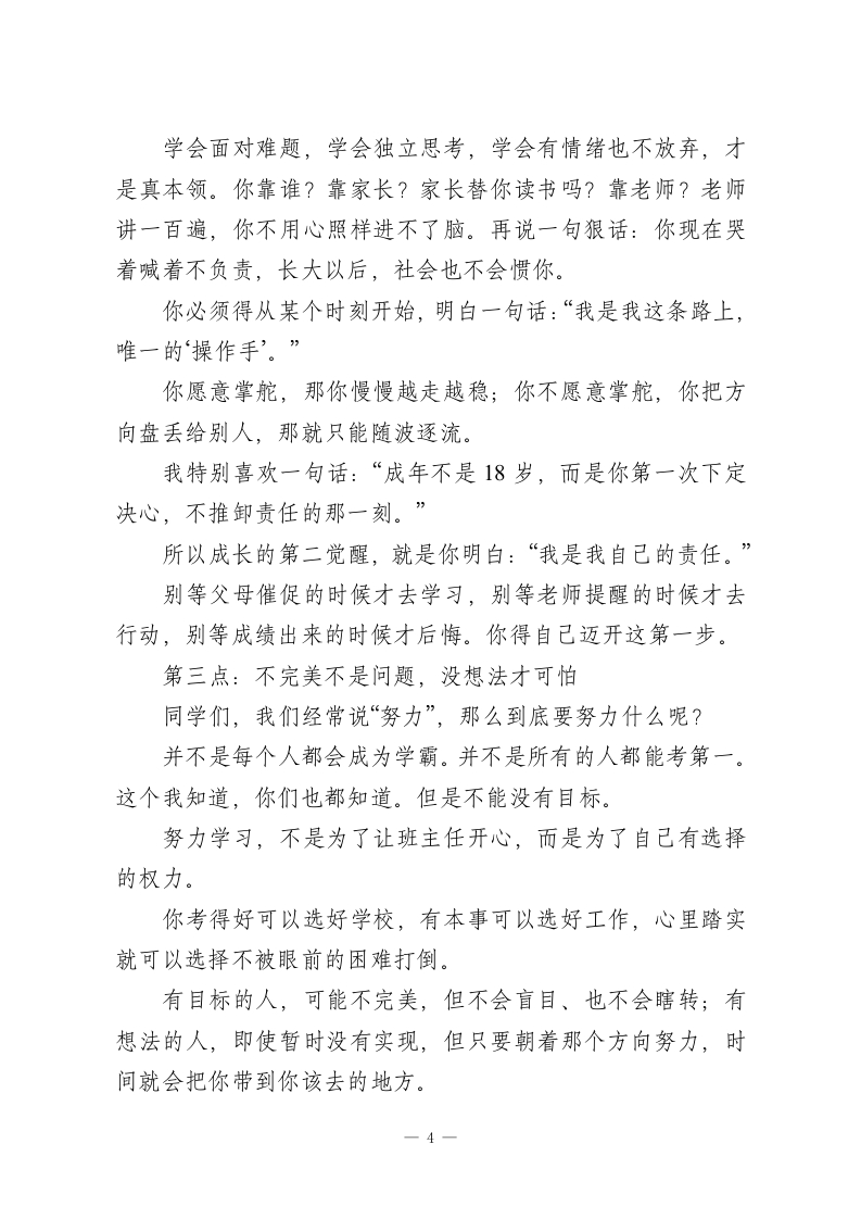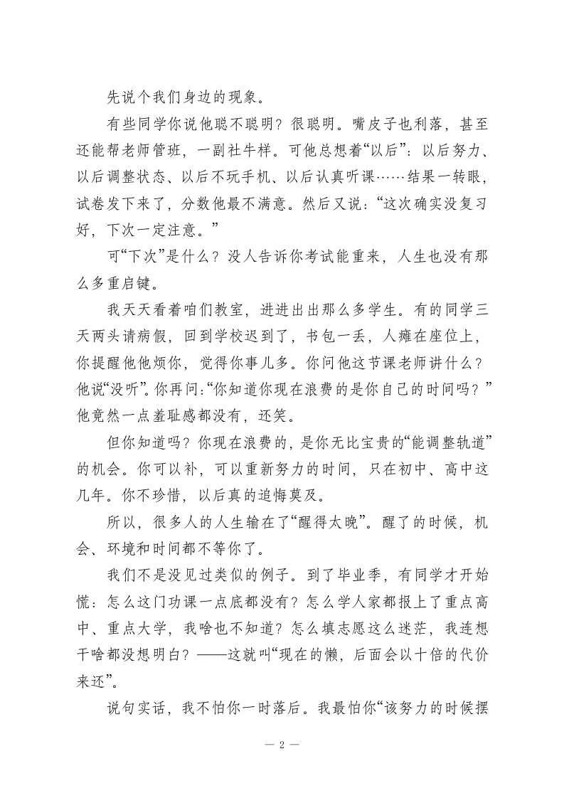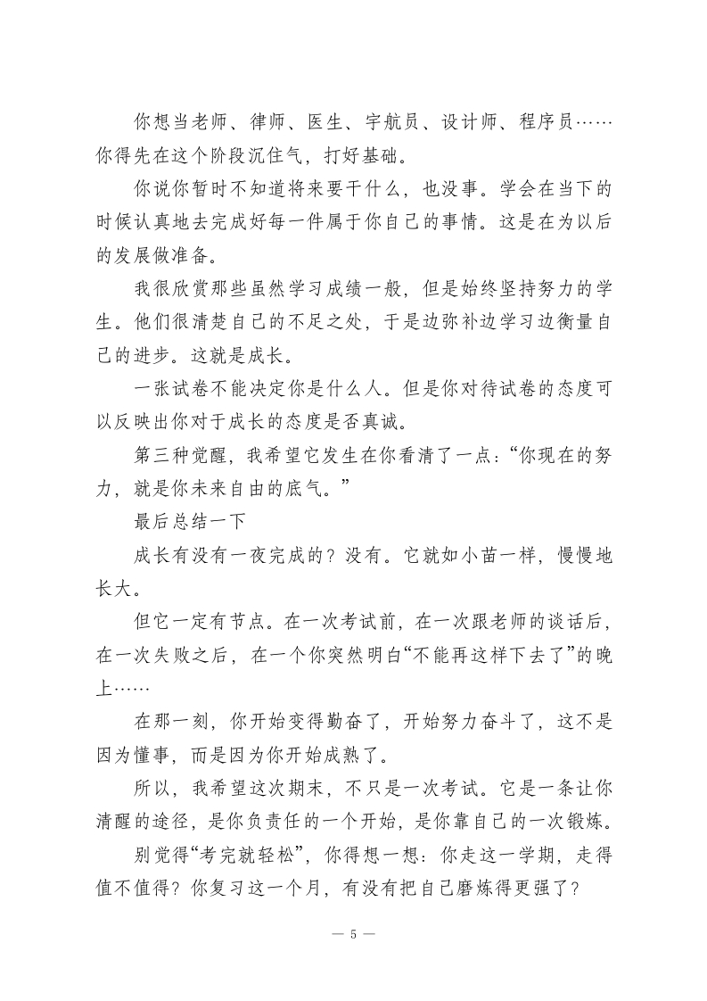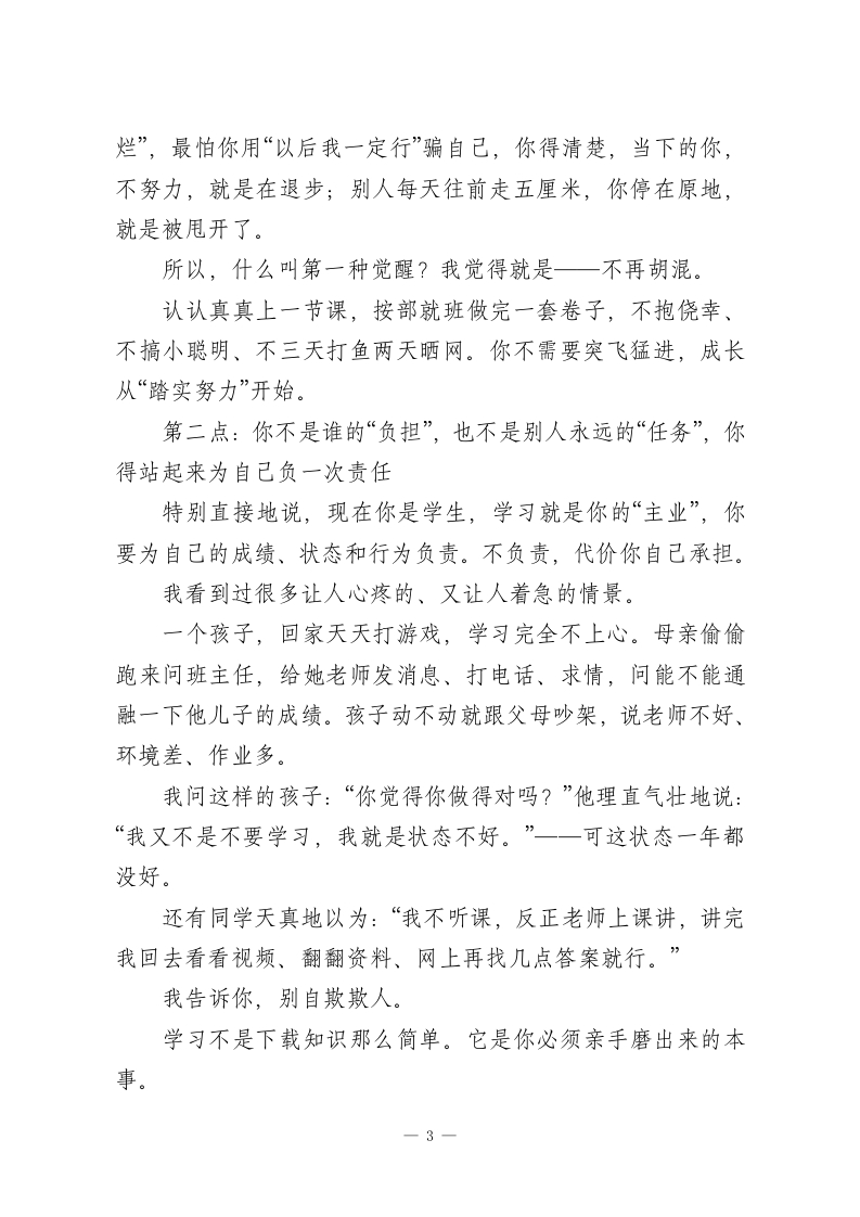 期末动员大会上,校长讲话:别再靠“以后我一定行”骗自己了一一这场讲话,句句说进中学生的心里!老师们、同学们:大家上午好!一个学期很快就要过去了,期末就在眼前。各年级、各学科的复习也都到了冲刺阶段,今天我们召开这个会议,并不是单纯为了考试,也不是让大家紧张一会儿就完了,更不是走个过场,而是想借着这个机会,跟大家谈谈更重要的事情:成长,到底是什么。刚才坐在台下,我脑子里一直在想一个问题:是什么让个人真正长大?是年龄到了吗?是成绩变好了?是升学了?是你长到一米七了吗?其实都不一定。我的理解很简单:人的成长,是从“开始为自己负责”那一刻开始的。知道自已想要什么、该做什么,有些事情不会再推给其他人,不推卸、不抱怨、不依靠别人,知道自己时间怎么安排,知道自己不努力就会失败,努力了也不见得能赢,但是仍然愿意去拼搏,这就是成长。围绕这个话题,今天我想讲三点。咱们不说空话,都是人话,都是你我都能理解、也该思考的。第一点:别总活在“以后”,现在就得醒一醒1