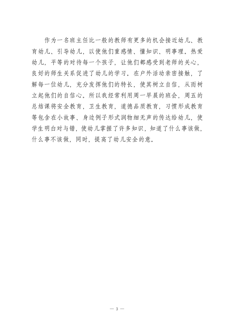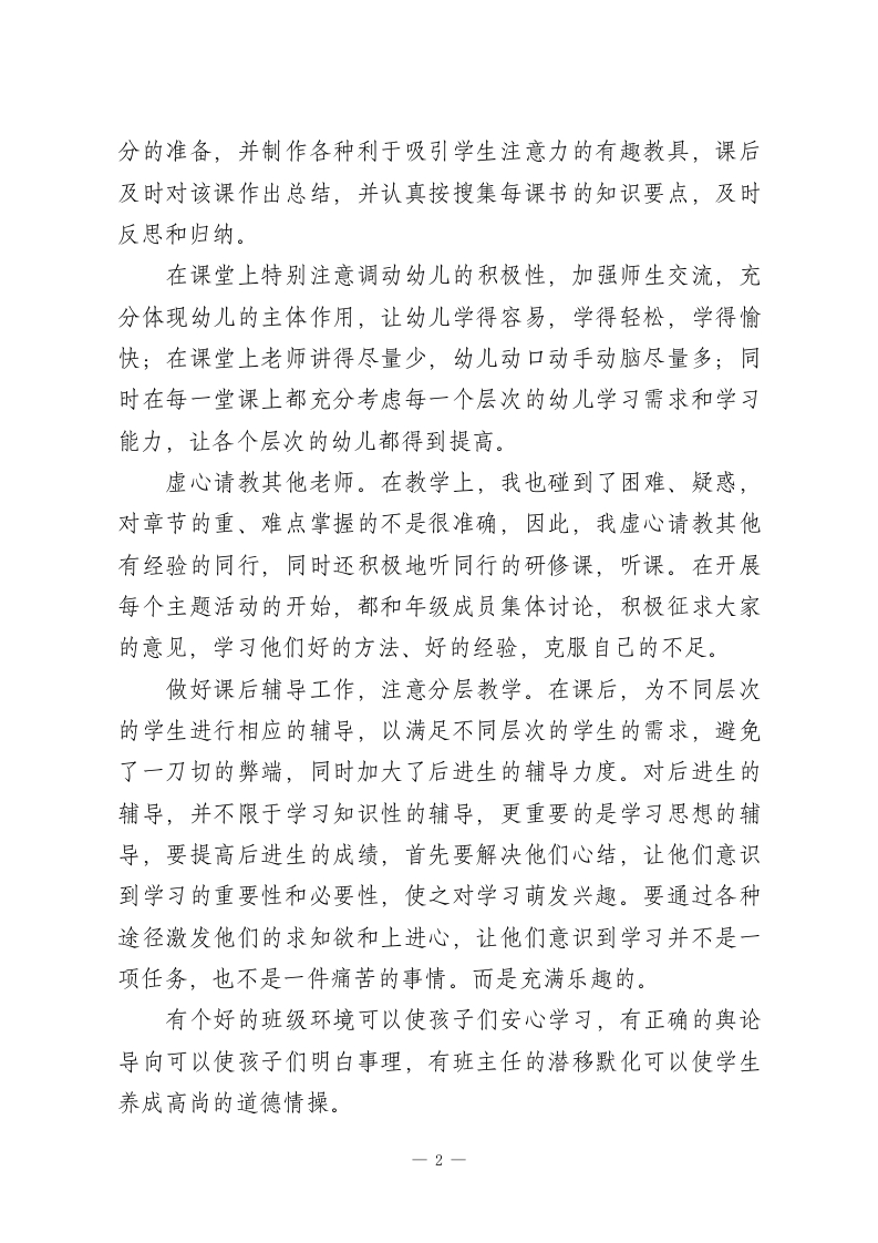 小学班主任秋季教育教学工作总结个人一个学期的工作又已结束,本学期我担任小一班语言、数学、自然、艺术等教学及班主任工作。平时教学中,我适应新教材教学工作的要求,从各方面严格要求自己,积极钻研教材,结合本园的实际条件和幼儿的实际情况,使教育教学工作有计划,有组织,有步骤地开展。立足现在,放眼将来,为使今后的工作取得更大的进步,现对本学期教学工作作出总结,希望能发扬优点,克服不足,总结经验教训,以促进教育工作更上一层楼。一学期来,本人热爱幼园工作。积极学习,不断提高自己的思想水平,认真履行一个普通人民教师的职责。热爱本职工作的同时认真执行幼儿园的各项规章制度。认真学习新的教育理论,及时更新教育理念。我们必须具有先进的教育观念,才能适应教育的发展。认真学习仔细体会新形势下怎样做一名好教师。本人积极学习课程理论,认真学习新的教育教学理论,广泛涉猎各种知识,形成比较完整的知识结构;严格要求幼儿,尊重幼儿,发扬教学民主,使孩子学有所得;本人也不断提高自己的教学水平和思想觉悟,在课堂上充分调动学生的积极性,采用探究合作式的学习,提高幼儿的学习兴趣。认真备课,不但备幼儿而且备教材备教法,根据教材的内容及幼儿的实际,设计课的类型,拟定采用的教学方法,认真写好教案。每一课都做到“有备而来”,每堂课都在课前做好充1