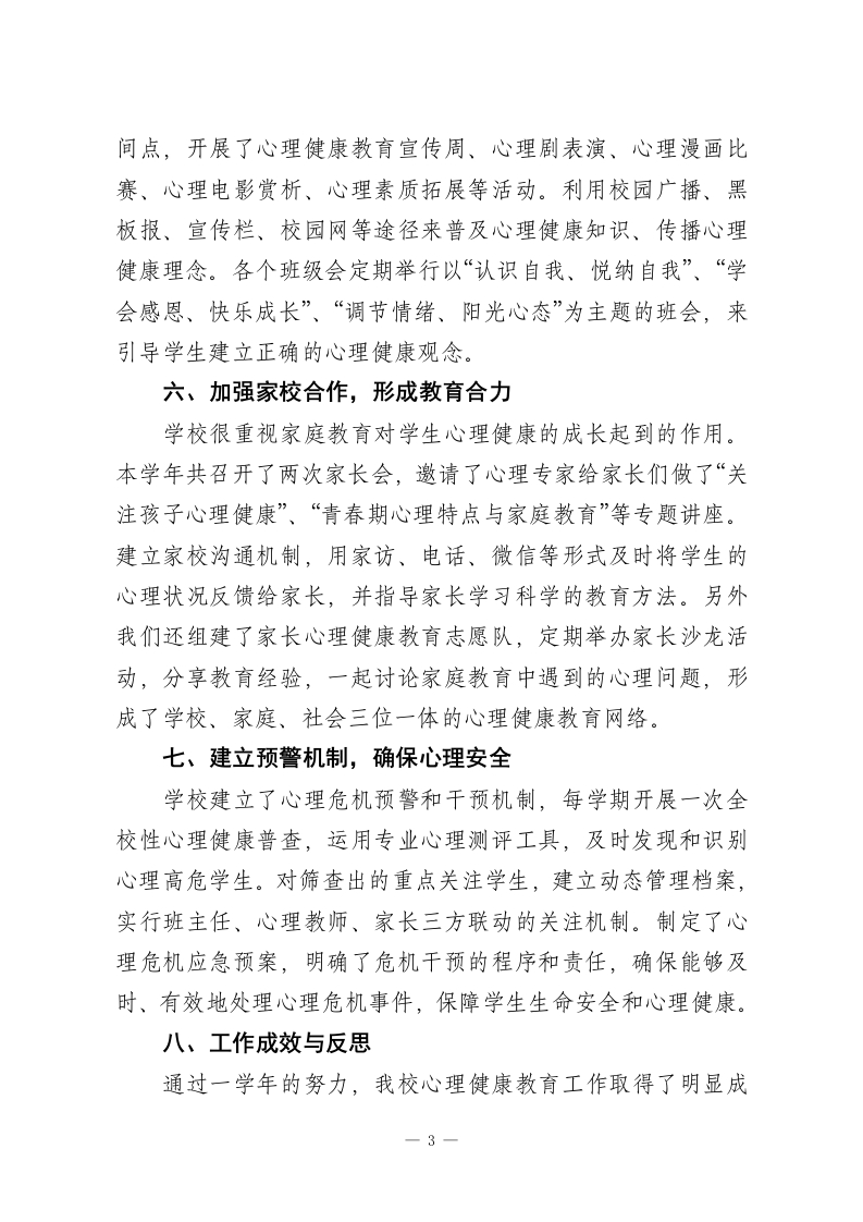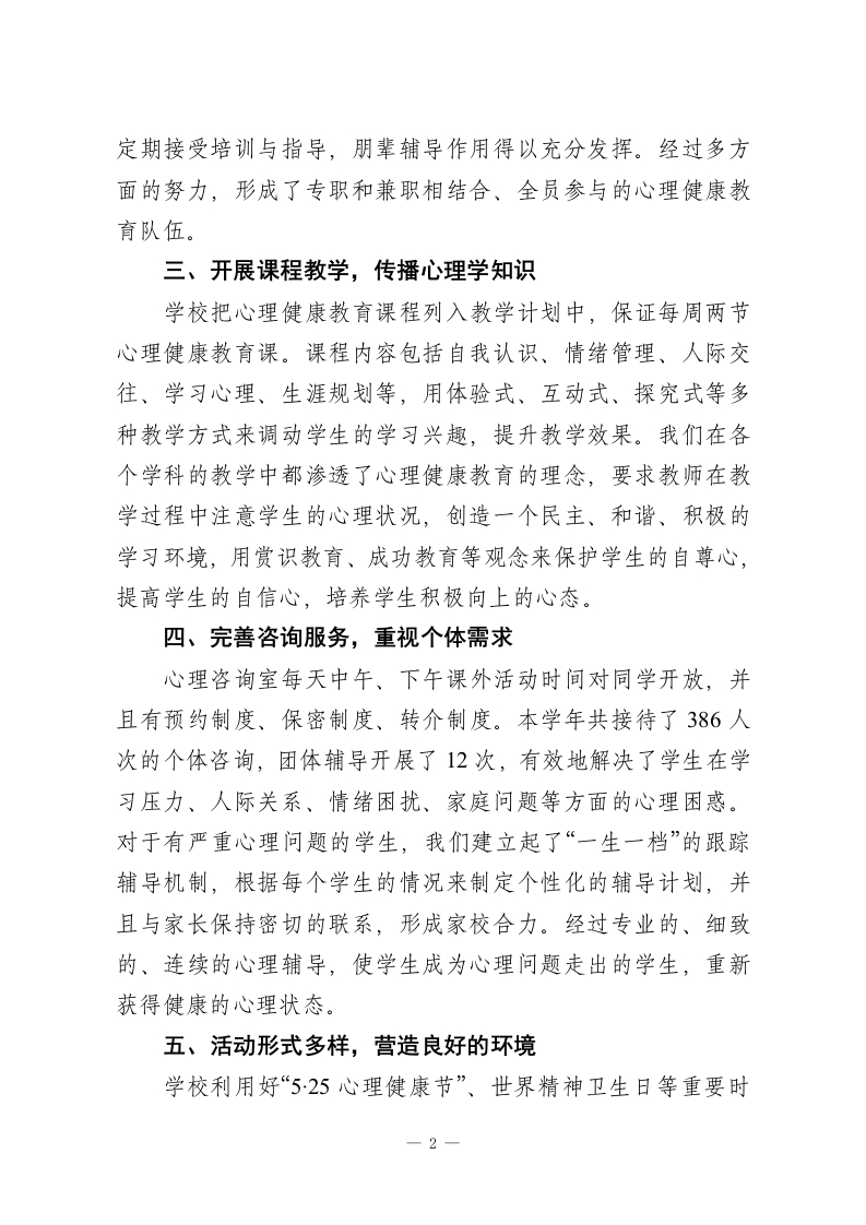 学校心理健康教育工作总结:效果很好,没有心理变态的!本学年,在校党委、行政领导的高度重视和大力支持下,在全校师生的共同努力下,我们以科学、规范、创新、务实的工作理念,把促进学生身心健康发展作为根本目标,把培养学生良好的心理素质作为主要任务,有计划、有步骤、有重点地开展了一系列心理健康教育活动,取得了较好的效果。本学年心理健康教育工作情况如下:完善组织机构、工作机制学校成立由校长担任组长、分管副校长担任副组长、政教处、教务处、团委负责人以及兼职心理教师组成的心理健康教育工作领导小组。建立起了心理健康教育工作的制度,确定了各部门的职责分工,形成了校长室统筹、政教处牵头、心理咨询室具体实施、班主任和任课教师全员参与的工作格局。我校遵循预防为主、发展为重、干预为辅的工作原则,把心理健康教育纳入学校整体教育教学计划中,保证心理健康教育工作的系统性、连续性、有效性。二、加强队伍建设,提高专业水平本学年,学校继续加强了心理健康教育教师队伍建设。方面,选派专职心理教师参加省市级的专业培训,提升他们的理论水平和实践能力;另一方面,组织全体班主任及骨干教师参加心理健康教育知识培训,使他们掌握基本的心理辅导技能。我校建立了班级心理委员制度,每个班级选出两名心理委员,1