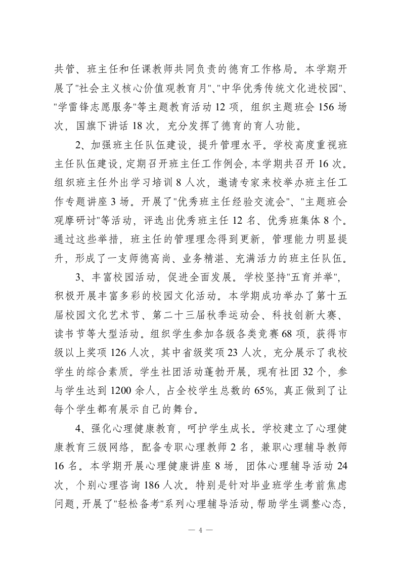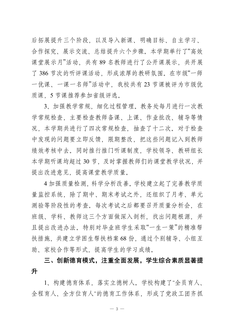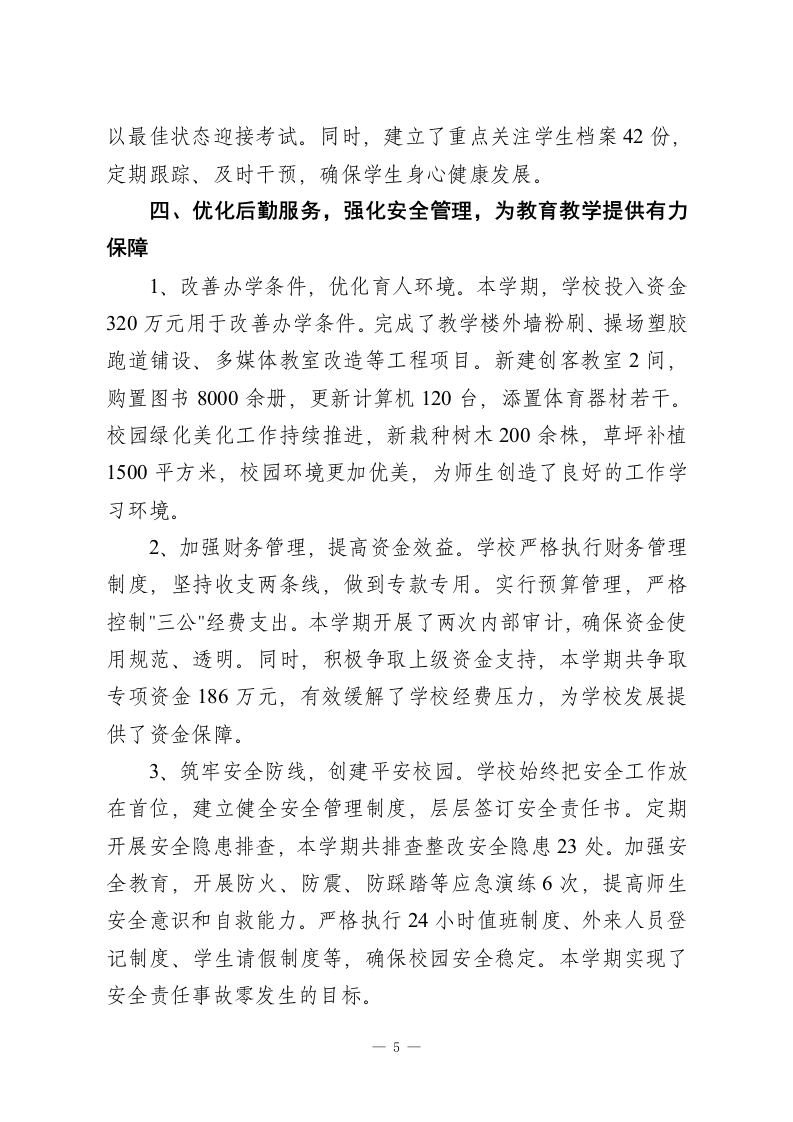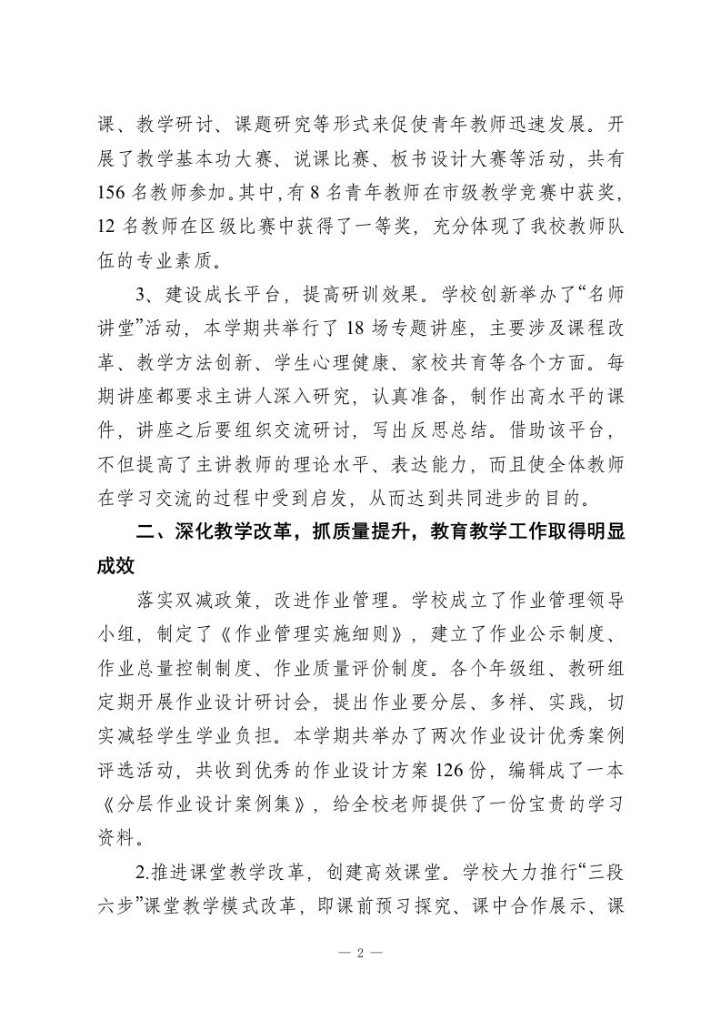 学校学期末工作总结:在班级、学科、教师这3个方面做深入剂析,找出问题根源,并且提出改进办法本学期,在上级教育主管部门的正确领导下,在习近平新时代中国特色社会主义思想的指导下,我们深入贯彻党的教育方针,坚持“立德树人、质量立校、特色发展、服务社会”的办学理念,按照年初制定的工作计划,以提质增效、内涵发展为工作主线,全体教职工团结协作、锐意进取,较好地完成了本学期各项工作任务,现将主要工作总结如下:提升党建工作,提升教师队伍的思想政治素质、业务水平1、加深理论学习,加强思想武装。本学期,学校党委要求全体党员教师深入学习党的二十大精神,认真研读《习近平谈治国理政》第四卷、《习近平总书记教育重要论述讲义》等必读书目,并要求每位党员撰写不少于8000字的学习心得,提交学习体会文章两篇。采用“三会一课”、主题党日、专题研讨等方式,共组织集中学习12次,专题党课6次。特别在师德师风建设月活动中,组织了三场优秀教师先进事迹报告会,进行了四次师德师风大讨论,签订了186份师德承诺书,形成了良好的育人氛围。2、实施青蓝工程,推进教师专业发展。学校制定了《青年教师培养三年行动计划》,建立起了“一对一”的师徒结对帮扶机制,本学期共有42对师徒结对帮扶。通过听课指导、集体备
