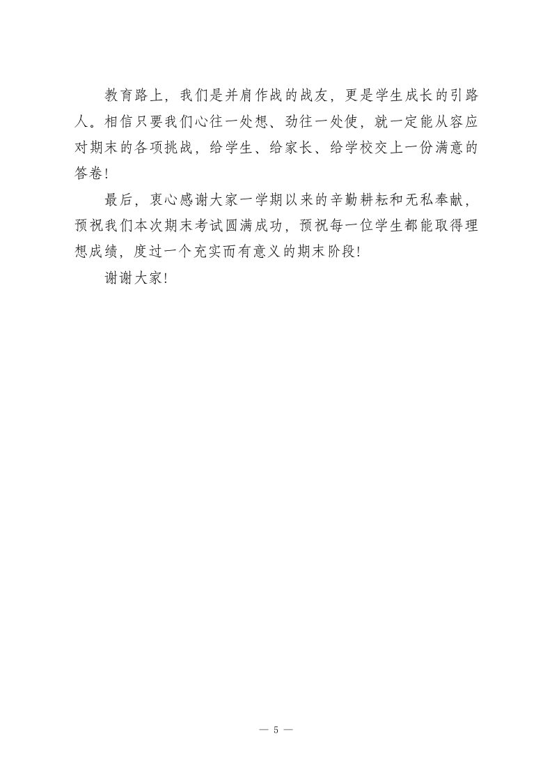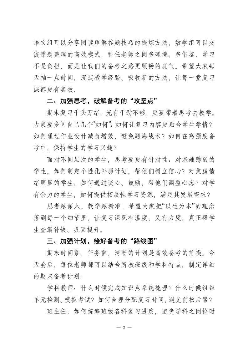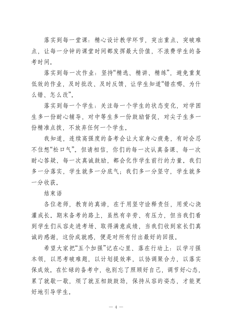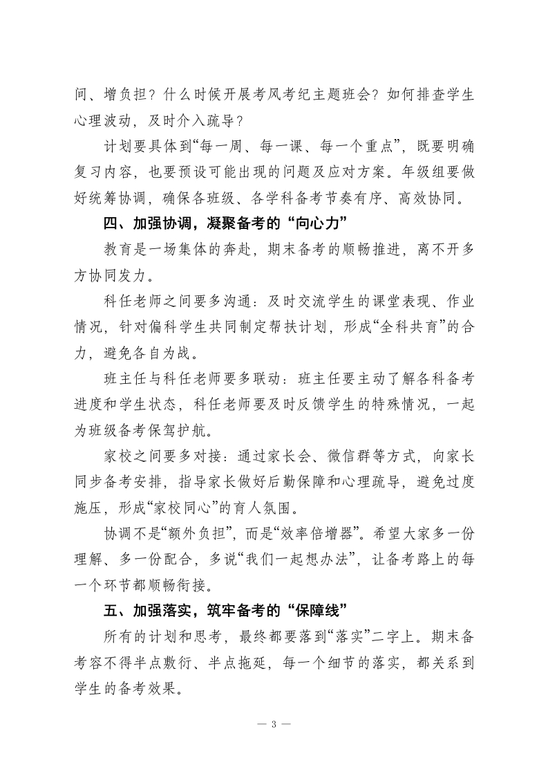 元旦返校,校长在全体教师会上讲话:“5个加强”扎实推进期末备考工作各位老师:大家上午好!元旦假期的余温还未散去,我们已迅速回归三尺讲台。眼下,期末备考的号角已然吹响一一这既是对全校师生一学期教学成果的集中检验,更是对每一位老师育人初心、教学智慧的全面考量。我深知,期末阶段的你们,肩上扛着沉甸甸的责任:课堂上要高效梳理知识点,课后要耐心答疑辅导,还要忙着批改试卷、关注学生心态,连轴转的节奏里满是辛劳。就像大家常说的,教育是一场“单向的奔赴”,很多时候,你们的付出未必能被完全看见,但正是这份默默坚守,才撑起了学生成长的阶梯。今天的会议,我想围绕“五个加强”,与大家共勉,也为期末工作凝心聚力:一、加强学习,找准备考的“发力点”“学然后知不足,教然后知困。”期末复习不同于日常教学,更需要精准施策的专业能力。各位老师既要主动钻研学科课标和考试要求,吃透考点、难点,也要学习先进的复习方法比如如何优化复习课结构,避免“炒冷饭”;如何运用分层教学,兼顾学困生补弱与尖子生拔高;如何做好学生考前心理疏导,缓解焦虑情绪。我们的每周教研活动,接下来可以聚焦“期末备考实务”:1