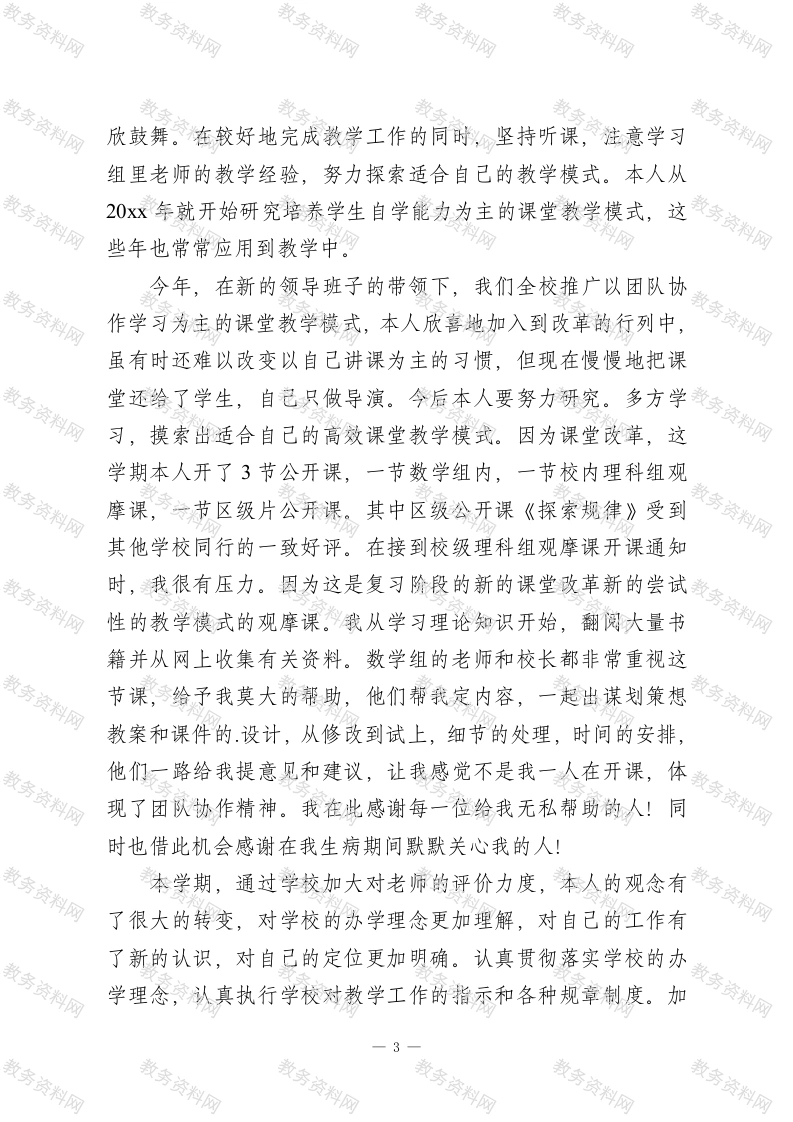 中小学教师2025秋季年度教学工作总结认真学习新的教育理论,及时更新教育理念。积极参加校本培训,并做了大量的政治笔记与理论笔记。新的教育形式不允许我们在课堂上重复讲书,我们必须具有先进的教育观念,才能适应教育的发展。所以我不但注重集体的政治理论学习,还注意从书本中汲取营养,认真学习仔细体会新形势下怎样做一名好教师。通过学习,勇于解剖自己,分析自己,正视自己,提高自身素质。首先,能认真把握教材。把课标、教参与课本有机结合,以提高学生分析问题和解决问题能力为目标,切实落实培养学生的创新思维和创造能力,并且能利用课堂时间不断地以新型热点材料为背景创设提问角度,帮助学生拓展思路,从而使学生们分析、解决问题的能力不断提高。第二,能把握学生的认知水平和能力。重视对已学知识的巩固和新、旧知识的联系,达到帮助学生学会求知、不断发展的目的。第三,尊重学生。重视与学生之间的情感交流和培养,在严格管理的同时能尊重学生的学习热情和认知能力,提出与学生自身水平相当的问题,鼓励他们大胆探索,共同提高。本人严格遵守学校的各项规章制度,不迟到、不早退、有事主动请假。在工作中,尊敬领导、团结同事,能正确处理好与领导同事之间的关系。平时,勤俭节约、任劳任怨、对人真诚、热爱学生、人际关系和谐融洽,从不闹无原则的纠纷,处1