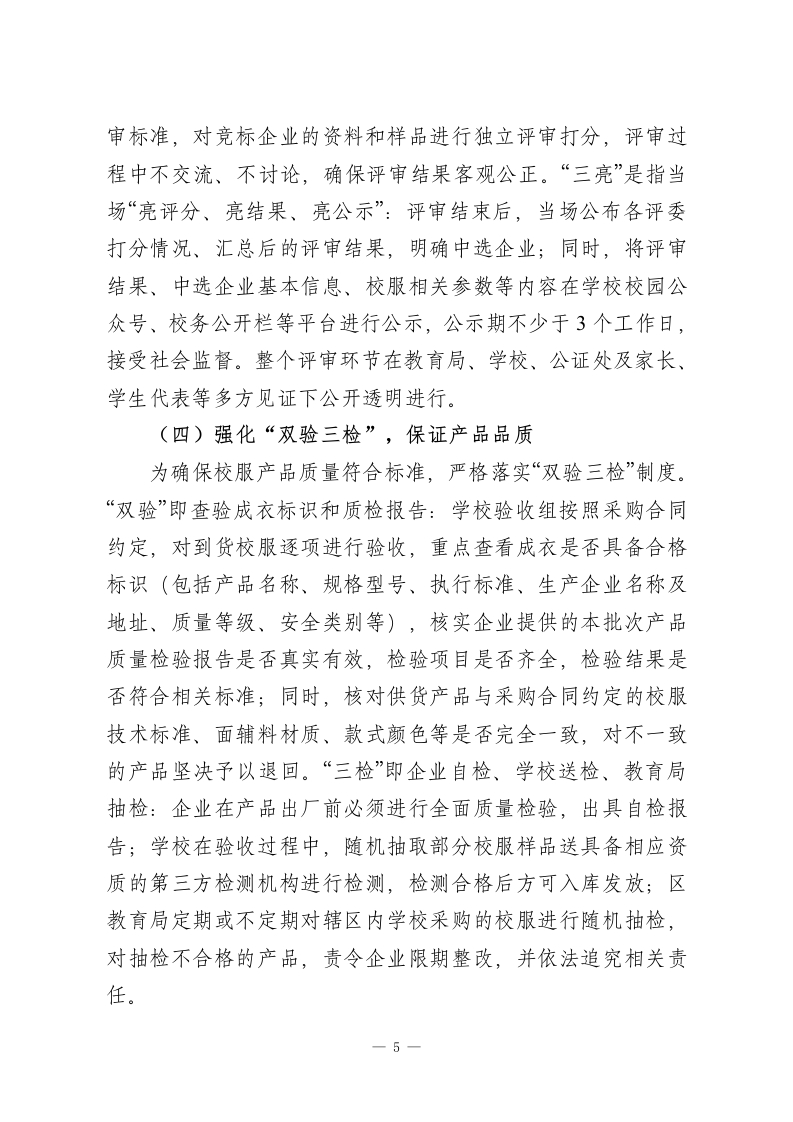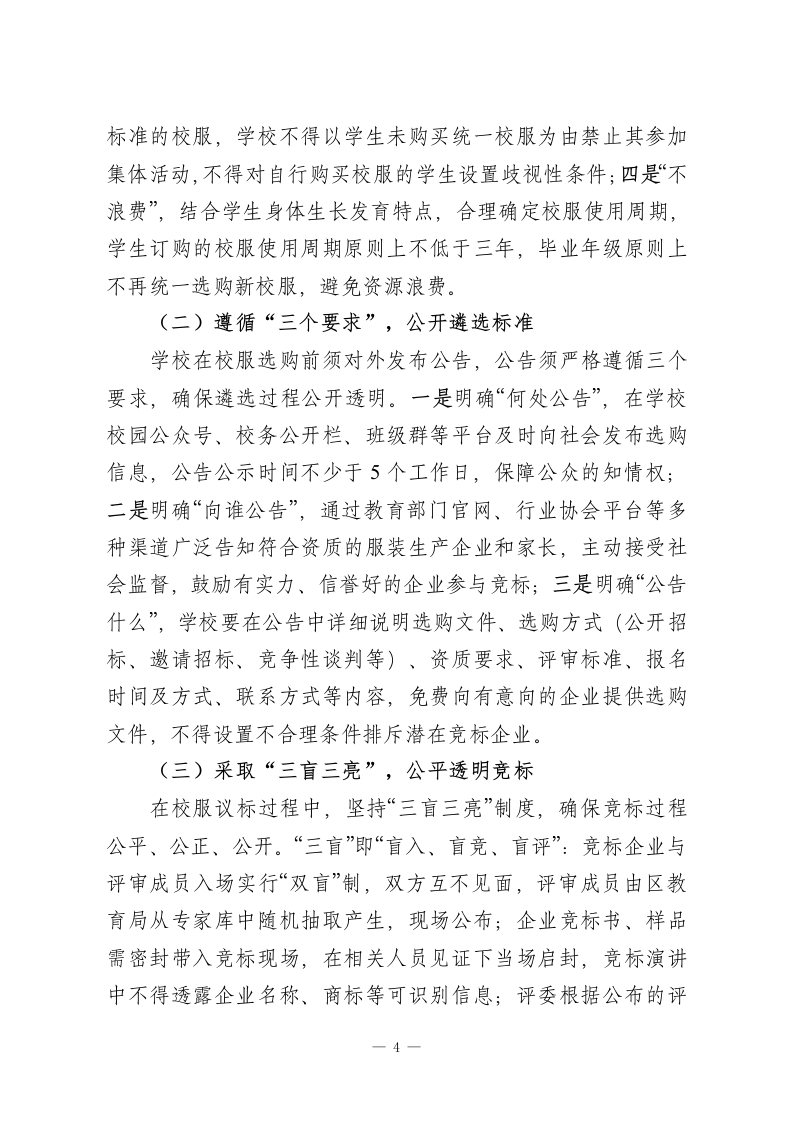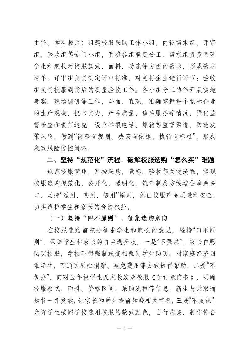 做好校服治理“大文章”,筑牢风险防控“防护墙”一一校服采购专项整治工作情况汇报校服事关学生的身心健康,校服选购历来受到家长关心、社会关切。近年来,*将校服选购作为开展教育领域群众身边“可视“有感”腐败问题专项治理的重点,坚持源头治理、系统治理,聚焦校服“谁来买“怎么买“怎么管”三个关键问题,创新实施“三化”策略,探索构建校服治理工作体系,有效筑牢校服选购领域廉政风险“防护墙”。一、坚持“民主化”决策,破解校服选购“谁来买”难题加强党对教育工作的全面领导,发挥学校党组织政治领导和监督作用,建立健全学校校服管理监管机制,严格落实“三重一大”制度,执行民主共商决策,将校服管理由自上而下的“单向行政管理”转为齐抓共管的“多元联动管理”。(一)强化党建引领,把好政治方向大力推进中小学校党组织领导的校长负责制改革,发挥党组织把方向、管大局的领导职责,坚持“公开公正、依法依规,严格规范程序,依法公开采购,认真组织评审,确保质优价宜”原则,积极推进学校党建与校服管理业务融合。一是用好“普规普纪”活教材。组织学校领导干部、负责校服采购相关工作人员专题学习《中国共产党廉洁自律准则》《*关于进一步加强中小学生校服管理的实施意见》等文件精神,通过案例剖析、廉政