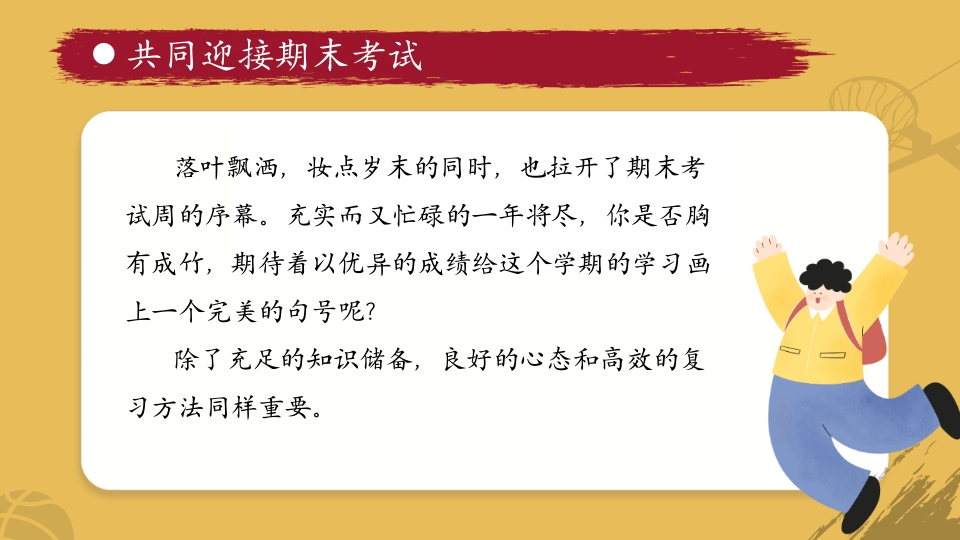 【高中】【期考复习】主题班会《期末复习总动员期末复习指导》tangqi883天前发布关注私信47.90MB40页02711 第1页 / 共40页 第2页 / 共40页 第3页 / 共40页 第4页 / 共40页 第5页 / 共40页 试读已结束,还剩35页,您可下载完整版后进行离线阅读 【高中】【期考复习】主题班会《期末复习总动员期末复习指导》此内容为付费资源,请付费后查看¥9.9¥19.9VIP会员免费立即购买您当前未登录!建议登陆后购买,可保存购买订单付费资源© 版权声明本站是一个信息分享及获取的平台,不确保部分用户上传资料的来源及知识产权归属,资料由老师投稿,公开渠道整理,网友上传,如果侵犯到您的权益,请联系客服删除THE ENDPPT课件 文本预览 Annual Examination年度收官战期末总动员 查看更多 收起部分 喜欢就支持一下吧点赞11 分享QQ空间微博QQ好友海报分享复制链接收藏