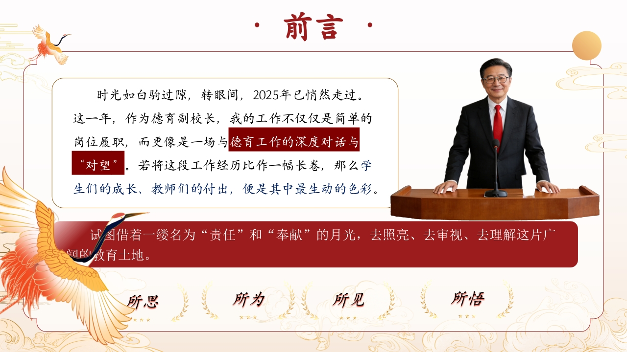 2025-2026第一学期德育副校长工作总结:就借着月光,和德育对望tangqi883天前发布关注私信32.22MB21页0287 第1页 / 共21页 第2页 / 共21页 第3页 / 共21页 第4页 / 共21页 第5页 / 共21页 试读已结束,还剩16页,您可下载完整版后进行离线阅读 2025-2026第一学期德育副校长工作总结:就借着月光,和德育对望此内容为付费资源,请付费后查看¥9.9¥19.9VIP会员免费立即购买您当前未登录!建议登陆后购买,可保存购买订单付费资源© 版权声明本站是一个信息分享及获取的平台,不确保部分用户上传资料的来源及知识产权归属,资料由老师投稿,公开渠道整理,网友上传,如果侵犯到您的权益,请联系客服删除THE ENDPPT课件 文本预览 2025年度德育副校长述职报告就借着月光与德育对望汇报人XX老师时间2026/1/3 查看更多 收起部分 喜欢就支持一下吧点赞7 分享QQ空间微博QQ好友海报分享复制链接收藏