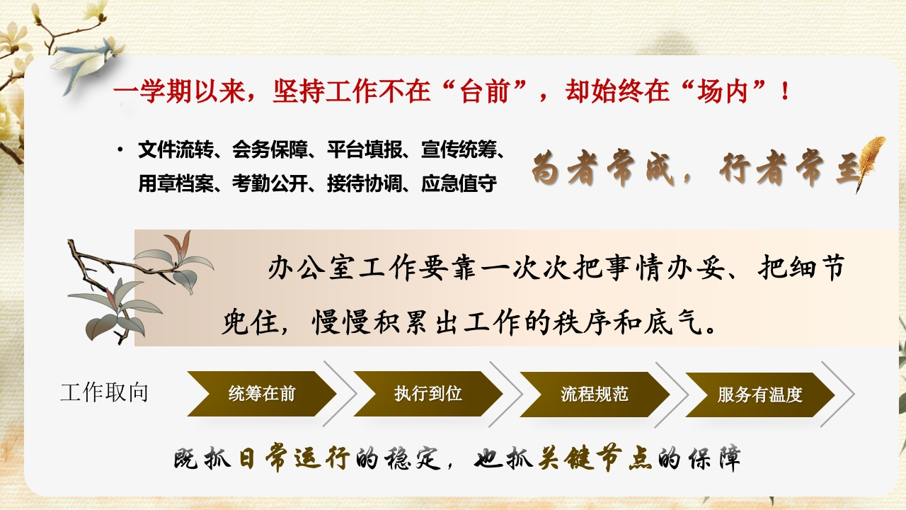 2025-2026年秋季第一学期学校办公室工作总结:把日常办成秩序,把关键托成底气tangqi883天前发布关注私信24.30MB32页0298 第1页 / 共32页 第2页 / 共32页 第3页 / 共32页 第4页 / 共32页 第5页 / 共32页 试读已结束,还剩27页,您可下载完整版后进行离线阅读 2025-2026年秋季第一学期学校办公室工作总结:把日常办成秩序,把关键托成底气此内容为付费资源,请付费后查看¥9.9¥19.9VIP会员免费立即购买您当前未登录!建议登陆后购买,可保存购买订单付费资源© 版权声明本站是一个信息分享及获取的平台,不确保部分用户上传资料的来源及知识产权归属,资料由老师投稿,公开渠道整理,网友上传,如果侵犯到您的权益,请联系客服删除THE ENDPPT课件 文本预览 把目常办成秩序把关健托成底气学校办公室工作总结2025-2026学年第一学期汇报人:XXX汇报时间:2026.01 查看更多 收起部分 喜欢就支持一下吧点赞8 分享QQ空间微博QQ好友海报分享复制链接收藏