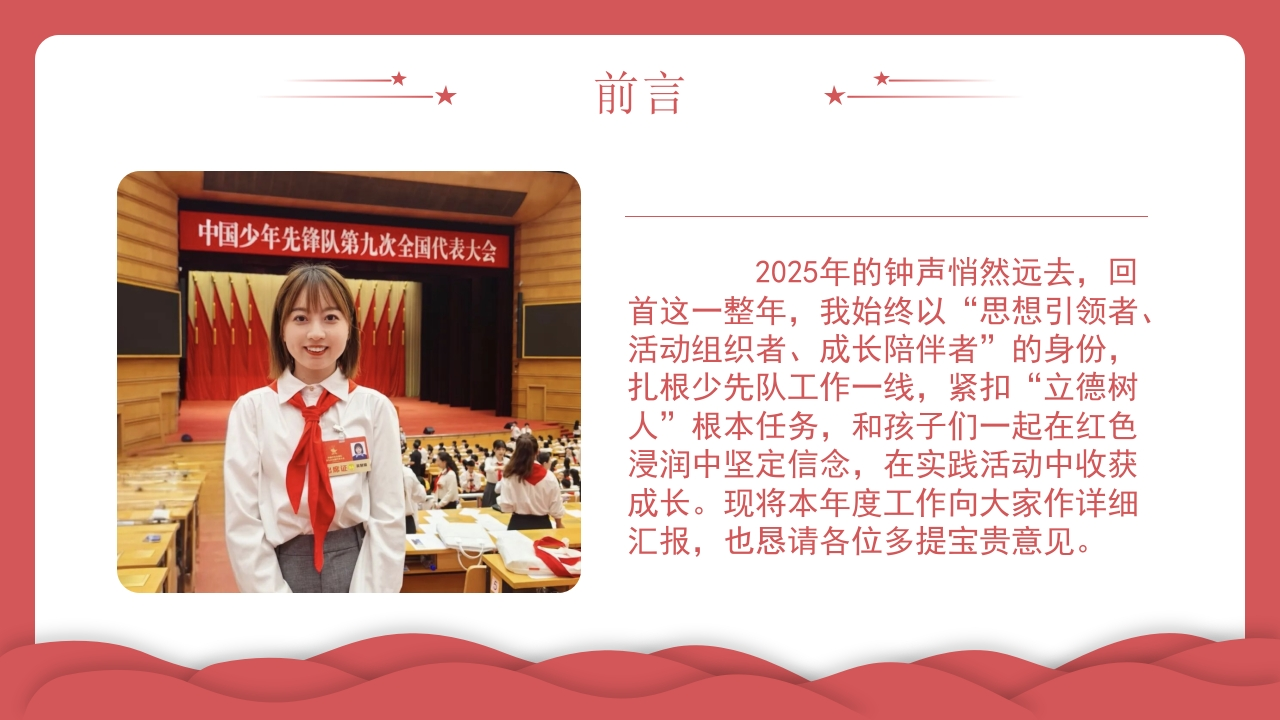 2025年度少先队工作述职报:红领巾引航,伴队员逐光成长tangqi883天前发布关注私信71.61MB25页03113 第1页 / 共25页 第2页 / 共25页 第3页 / 共25页 第4页 / 共25页 第5页 / 共25页 试读已结束,还剩20页,您可下载完整版后进行离线阅读 2025年度少先队工作述职报:红领巾引航,伴队员逐光成长此内容为付费资源,请付费后查看¥9.9¥19.9VIP会员免费立即购买您当前未登录!建议登陆后购买,可保存购买订单付费资源© 版权声明本站是一个信息分享及获取的平台,不确保部分用户上传资料的来源及知识产权归属,资料由老师投稿,公开渠道整理,网友上传,如果侵犯到您的权益,请联系客服删除THE ENDPPT课件 文本预览 学校L 查看更多 收起部分 喜欢就支持一下吧点赞13 分享QQ空间微博QQ好友海报分享复制链接收藏 tangqi88关注 74780127.2W+ 这家伙很懒,什么都没有写... 2025年第八次少代会资料汇编2025年第八次少代会资料汇编3个月前 170优秀教师经验分享《知不足而后进,望山远而力行》优秀教师经验分享《知不足而后进,望山远而力行》4个月前 98【六上】【双向奔赴共育未来】开学家长会发言稿【六上】【双向奔赴共育未来】开学家长会发言稿3个月前 842025年世界水日活动2025年世界水日活动4个月前 75【六上】【双向奔赴共育未来】开学家长会课件【六上】【双向奔赴共育未来】开学家长会课件3个月前 70评语(1)评语(1)4个月前 70 上一篇 2025-2026年秋季第一学期学校办公室工作总结:把日常办成秩序,把关键托成底气 下一篇 2026寒假期末评语 相关推荐 优秀教师经验分享《知不足而后进,望山远而力行》【六上】【双向奔赴共育未来】开学家长会发言稿评语(1)【六上】【双向奔赴共育未来】开学家长会课件跨山河赴秋约话成长——试后家长会发言稿【通用】2026元旦主题联欢晚会ppt让每一颗小小的种子——2025年秋季二年级期中家长会发言稿小学家长会PPT-03【初中】【通用】【秋季】新学期开学第一课:巴黎梦想启航,共筑青春辉煌【25年秋】【第6周】《自暖成光,心绽繁花》主题班会PPT以爱为舟,载梦远航期中家长会(1)中秋国庆双节安全教育1 评论 抢沙发 请登录后发表评论 登录 注册 社交账号登录 暂无评论内容