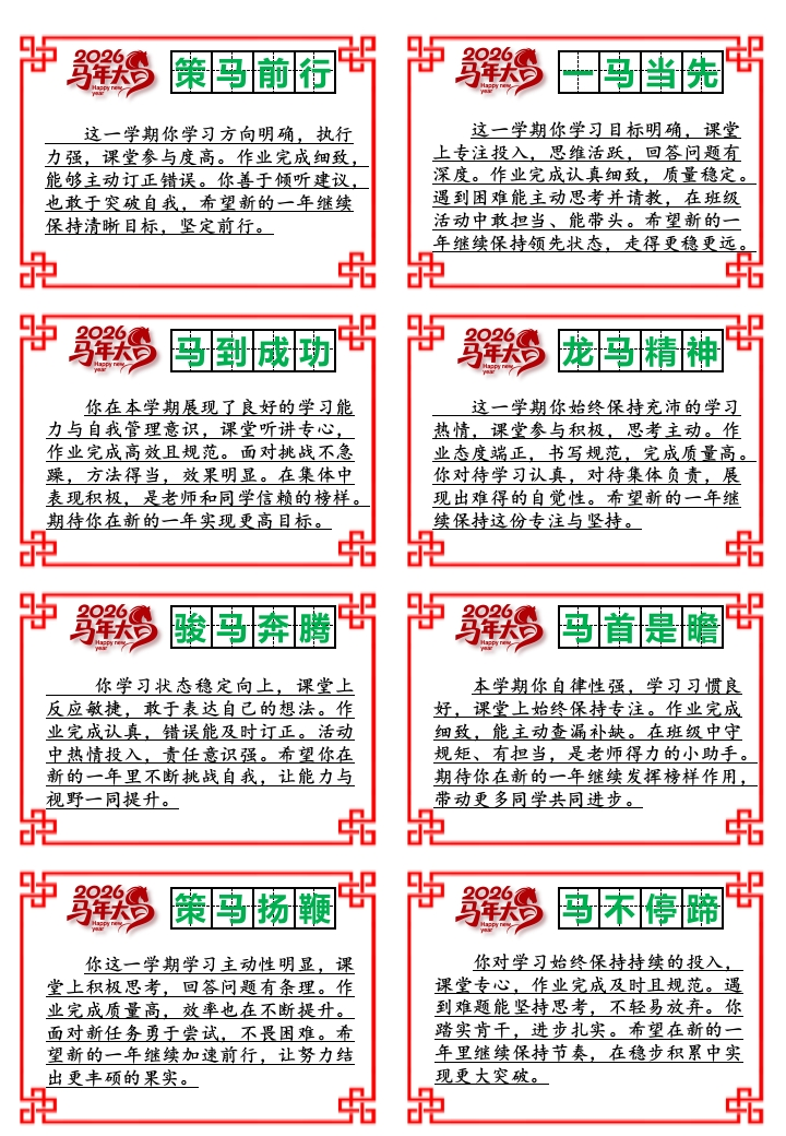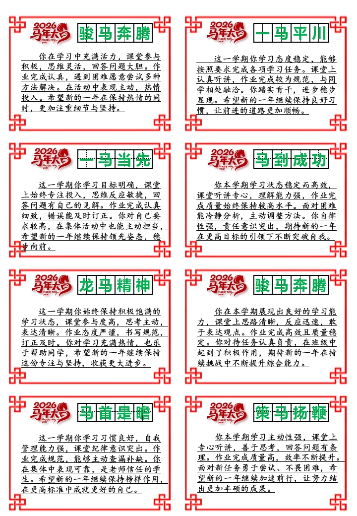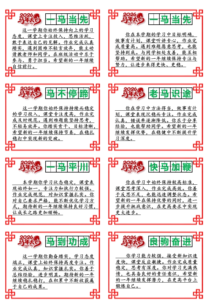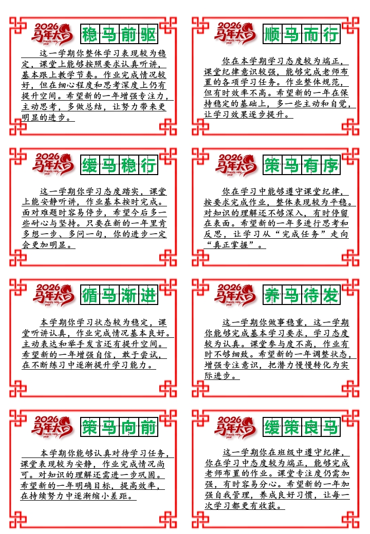 距紗一宵先到成砌这一学期你始终保持向上的学习态度,课堂上专注投入,思维活跃,你在本学期的学习中目标明确,敢于表达自己的见解。作业完成认真做事有计划,课堂听讲专心,作业完踏实,遇到困难不轻言放弃,能主动成质量高。遇到难题愿意思考,也能请教老师和同学。在班级活动中乐于坚持到底。与同学相处友善,能互相参与、勇于担当。希望新的一年继续帮助。希望新的一年继续保持专注与努力,让进步来得更快、更稳。品臣龙马精神距快马面鞭你这一学期精神饱满,学习积极本学期你学习态度端正,课堂上课堂上参与度高,回答问题声音响亮。能够认真听进,按要求完成学习任务。作业书写认真,完成及时,遇到困难作业质量较好,但有时还可以更加细不退缩。在集体活动中热情投入,展致。你愿意接受老师的建议,也在不现出良好的精神面貌。希望今后更加断改进自己。希望新的一年继续努力,自律,让这份活力转化为稳定进步加快前进的步伐,收获更多成长。电郡马1距马途你在学习中踏实肯干,能够坚持这一学期你做事稳重,学习上有完成每天的学习任务。课堂上专心听自己的方法,课堂听讲专注,作业完讲,作业态度认真,进步较为明显。成规范。遇到问题能够冷静思考,也遇到问题时愿意请教,不轻易放弃。愿意帮助同学。在班级中表现可靠,希望今后进一步提高效率,让每一次是老师放心的孩子。希望新的一年继努力都积累成更大的进步。续保持沉稳,带动自己不断向前。距玛扬鞭距是瞻你本学期学习状态较好,课堂上这一学期你在班级中遵守纪律,能积极参与,回答问题态度认真。作做事有责任感,能够按时完成学习任业完成较为扎实,对待学习任务不敷务。课堂上认真听讲,作业态度端正。衍。遇到不足时能虚心接受指导。希你尊重老师,团结同学,是集体中值望新的一年目标更明确,行动更坚定,得信赖的一员。希望新的一年更加自在努力中不断突破自己。信,勇敢展示自己的能力。