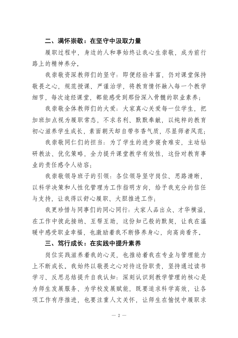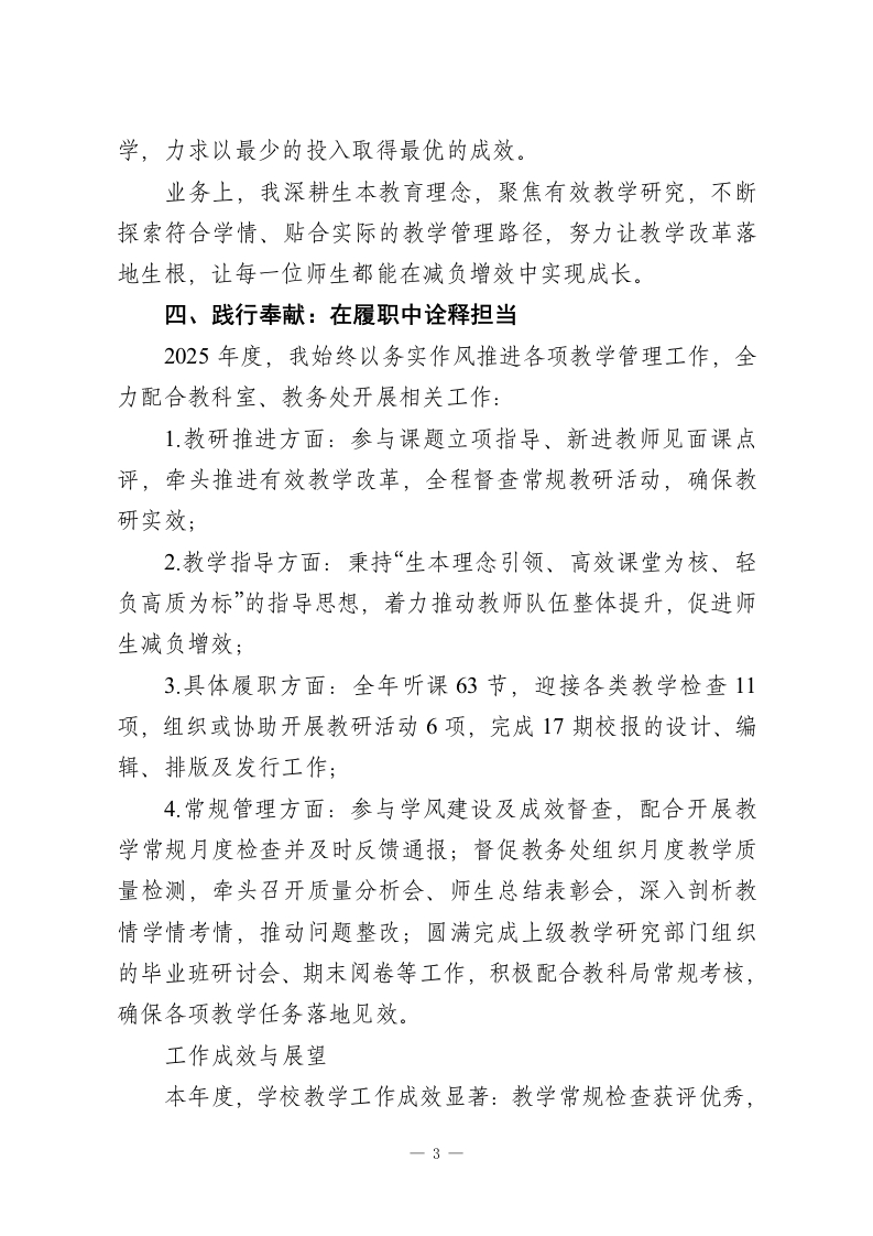 2025年度教学副校长述职报告:聚焦提质增效,聚力师生成长尊敬的各位领导、老师们:大家上午好!本人现任教学副校长,分管教育教学工作。2025年度的教育教学征程已近尾声,此刻,我怀着感恩与谦逊之心,向各位汇报全年工作情况。过去一年,各项教学工作的平稳有序推进,离不开校长的正确引领,离不开领导班子的协同发力,更离不开全体教职工的鼎力支持与真诚配合。正是大家的信任与帮助,让我得以顺利履职、积累经验,也清醒认识到工作中的不足。现将全年工作汇报如下,恳请各位批评指正。一、心怀亲近:在同行中凝聚初心履职以来,与近百名教职工并肩作战的时光,让我内心满溢温暖与归属感。身边的骨干教师与优秀教师们,以精湛的业务能力、高度的责任心诠释着教育者的担当:他们深耕课堂,精心备课授课,吸纳学科前沿成果,将理论与实践深度融合,以启发式教学点燃学生求知热情;他们俯身育人,深入了解学生需求,用耐心与爱心搭建起民主平等的师生桥梁,用言传身教践行着为人师表的准则。一年来,我深深感受到同事们给子的厚爱与关怀、支持与理解。这份跨越工作的情谊,让“亲近”成为我履职的内在指引一一凡事多为他人着想,多为师生需求考量,在彼此包容与扶持中凝聚起教育合力。一1