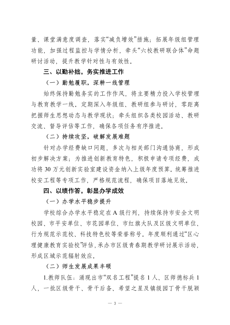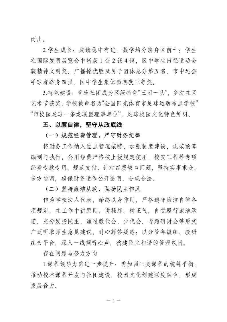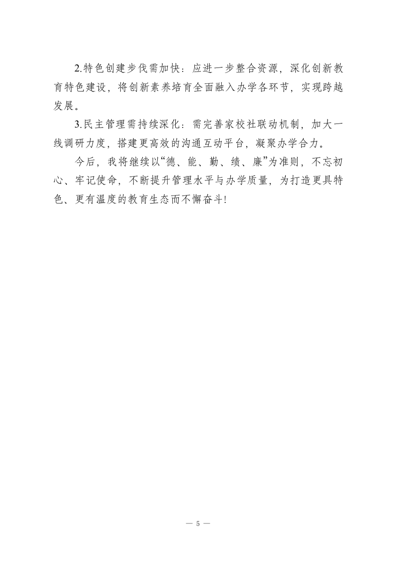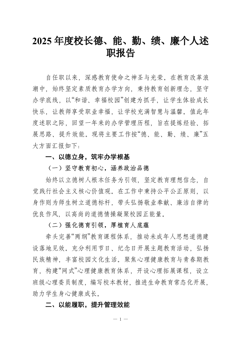 2025年度校长德、能、勤、绩、廉个人述职报告自任职以来,深感教育使命之神圣与光荣。在教育改革浪潮中,始终坚定素质教育办学方向,秉持教育创新理念,坚守办学底线,以“和谐、幸福校园”创建为抓手,让学生体验成长快乐,让教师享受职业幸福,让学校充满智慧与温馨。值此年度述职之际,回望一年来的办学管理历程,旨在提炼经验、拓展思路、提升效能。现将主要工作按“德、能、勤、绩、廉”五大方面汇报如下:一、以德立身,筑牢办学根基(一)坚守教育初心,涵养政治品德始终以立德树人根本任务为引领,坚定教育理想信念,自觉践行社会主义核心价值观。在工作中秉持公平公正原则,以身作则为师生树立道德标杆,带头弘扬敬业奉献、廉洁自律的优良作风,以高尚的道德情操凝聚校园正能量。(二)强化德育引领,厚植育人底蕴牵头完善“两纲”教育课程体系,推动未成年人思想道德建设落地见效。充分利用节日、纪念日开展主题教育活动,弘扬民族精神,丰富校园文化生活。聚焦心理健康教育与青春期教育,构建“网式”心理健康教育体系,开设心理拓展课程,设立班级心理委员制度,编写校本教材,推进生命教育常态化开展,助力学生身心健康成长。二、以能履职,提升管理效能1
