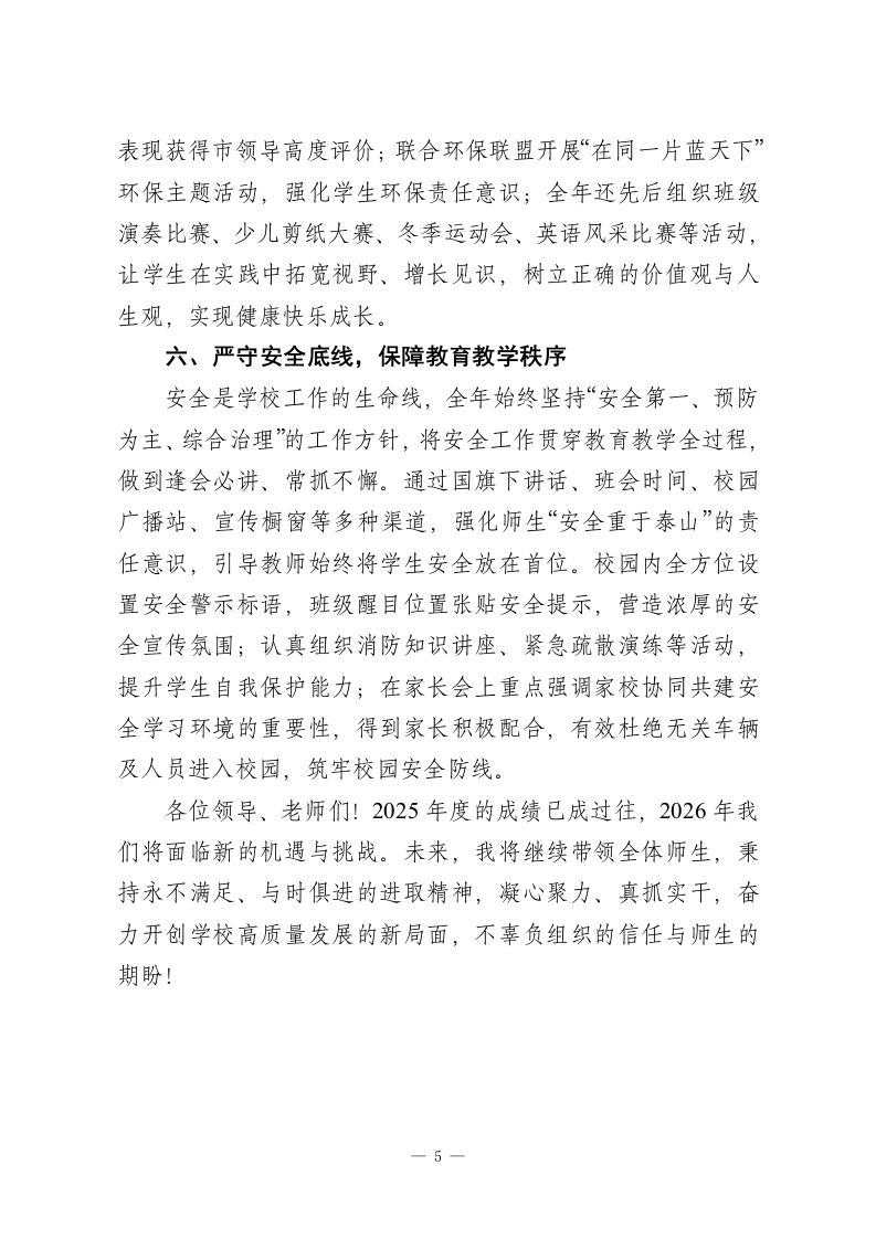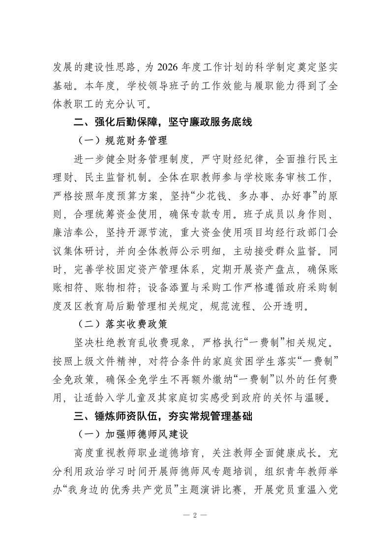 2025年度学校工作总结:凝心聚力促发展,履职尽责显担当2025年度,我肩负组织重托履职校长一职,始终秉持“务实办学、民主治校、勤政为民、开拓进取”的工作理念,深耕教育教学一线。任职之初便深知,本校拥有高素质的教师队伍、团结务实的行政班子,教育教学根基扎实,是师生共同成长的优质平台。面对这份信任与期待,我始终心怀敬畏、恪尽职守,以实践教育强区为核心目标,以“开放高效、以人为本、科研先导、彰显特色”为办学指导思想,借创建区“绿色学校”的契机,坚守“依法治校、质量立校、科研兴校、特色强校”的发展路径,全力争创人民满意的学校。在全体师生的共同努力下,2025年度学校圆满完成各项既定目标,取得了阶段性成效。现将全年工作情况汇报如下:一、筑牢班子根基,践行“创先争优”使命学校始终将行政领导班子建设置于重要位置,明确“勤政务实、依法治校、服务群众、开拓创新”的工作准则。班子成员分工清晰、协同发力,严格执行民主集中制决策制度。凡涉及人事分工、评优评先、重大活动部署、大型采购项目、年度工作方案等关键事项,均由行政班子、部门负责人及职代会成员集体研讨决定,决策结果通过教师大会或校务公示栏全程公示,广泛吸纳教职工的意见建议,主动接受监督。年未,我牵头开展与教师的面对面座谈交流,虚心倾听大家对学校工作的改进建议,积极为有困难的教师排忧解难,同步收集梳理推动学校1