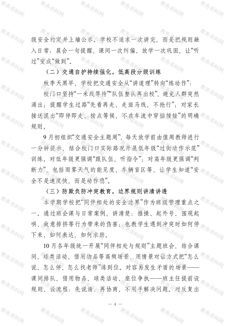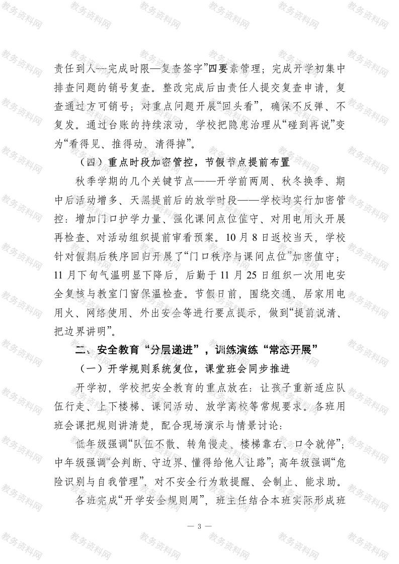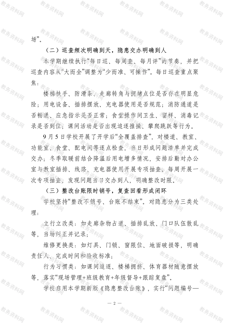 2025年秋季学校安全工作总结校园安全答卷每一步都算数我们一直强调把安全抓在“时间点”和“现场里”,让校园的安全不是靠运气,而是靠日复一日的落实。以岗位责任为骨架,以巡查整改为闭环,以规则训练为抓手,以场景管控为重点,以卫生健康为保障。更重视“天天可执行、处处有人管、问题能清零”。回看一个学期,许多看似平常的动作一门口一米线的坚持、课间转角的站位、食堂留样是否到点、演练后是否复盘,这些共同构成了校园稳定的底盘。一、责任体系“压实到岗”,运行机制“闭环到位”(一)岗位清单逐项落地,带班值守不断档位学校坚持“事到人、岗到点、时到段”的原则,把安全工作从“谁都管一点”变为“每个点位都有人必须管”。本学期进一步细化了校级带班、值周教师、年级组值守、班主任跟班、科任教师课堂管理、后勤与食堂岗位规范、门卫保安操作流程等职责,形成可对照、可检查的岗位清单。9月1日开学前,学校对原有安全管理制度与岗位职责进行了集中修订,并组织全体教职工进行要点学习与落实。日常管理中,学校重点盯住“容易出问题的三段”:早晨入校、课间走廊楼梯、放学离校。带班人员每天按固定路线巡查,发现问题现场提醒、现场纠偏;能当场解决的立即处理,不能当场解决的进入台账。对学生密集的时段,坚持“有人在场、有人开口、有人负责”,让安全管理不是“写在纸上”,而是“站在现1