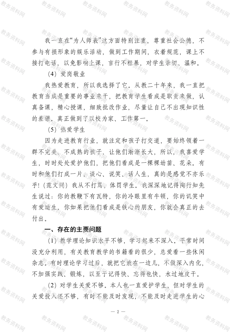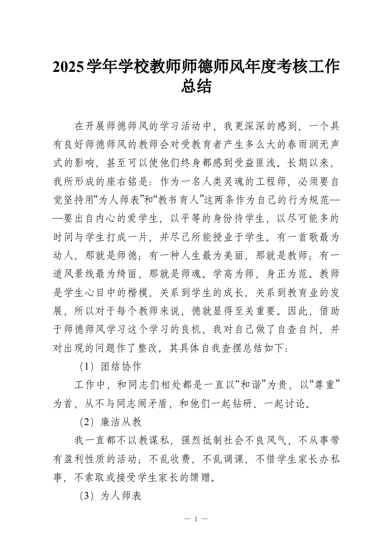 2025学年学校教师师德师风年度考核工作总结在开展师德师风的学习活动中,我更深深的感到,一个具有良好师德师风的教师会对受教育者产生多么大的春雨润无声式的影响,甚至可以使他们终身都感到受益匪浅。长期以来,我所形成的座右铭是:作为一名人类灵魂的工程师,必须要自觉坚持用“为人师表”和“教书育人”这两条作为自己的行为规范一要出自内心的爱学生,以平等的身份待学生,以尽可能多的时间与学生打成一片,并尽己所能授业于学生。有一首歌最为动人,那就是师德;有一种人生最为美丽,那就是教师;有一道风景线最为绮丽,那就是师魂。学高为师,身正为范。教师是学生心目中的楷模,关系到学生的成长,关系到教育业的发展,所以对于每个教师来说,德就显得至关重要。因此,借助于师德师风学习这个学习的良机,我对自己做了自查自纠,并对出现的问题作了整改。其具体自我查摆总结如下:(1)团结协作工作中,和同志们相处都是一直以“和谐”为贵,以“尊重”为首,从不与同志闹矛盾,和他们一起钻研、一起讨论。(2)廉洁从教我一直都不以教谋私,强烈抵制社会不良风气,不从事带有盈利性质的活动;不乱收费、不乱调课,不借学生家长办私事,不索取或接受学生家长的馈赠。(3)为人师表一1