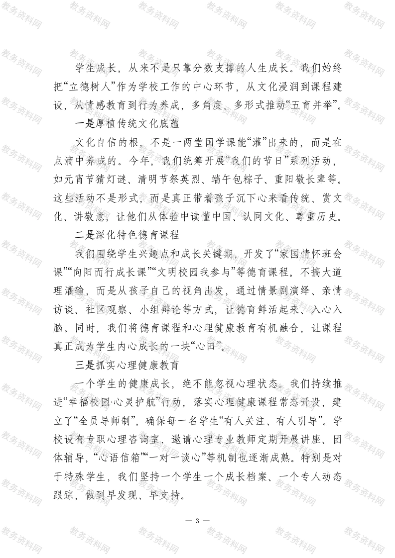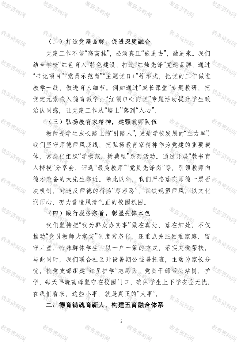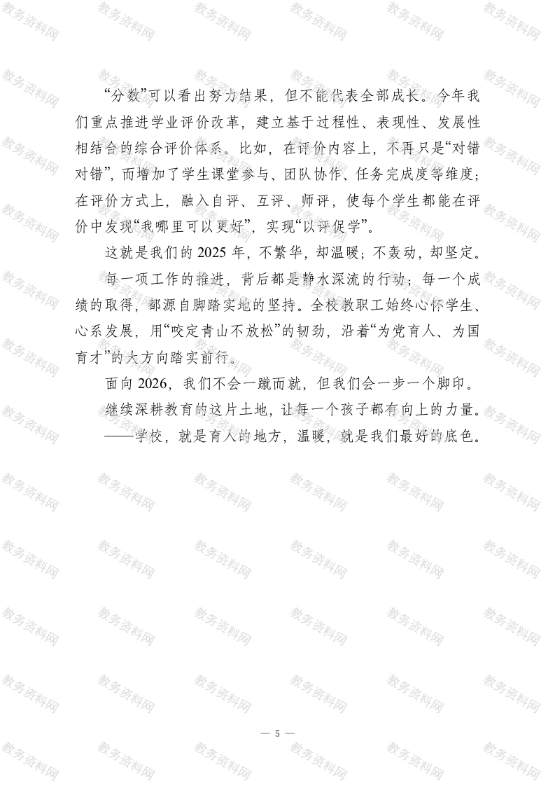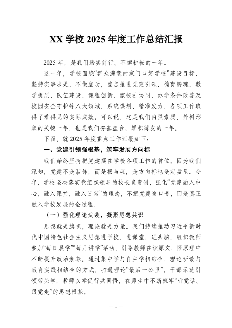 XX学校2025年度工作总结汇报2025年,是我们踏实前行、不懈耕耘的一年。这一年,学校围绕“群众满意的家门口好学校”建设目标,坚持实事求是、不做虚功,重点推进党建引领、德育铸魂、教学提质、队伍建设、课程创新、家校社协同、办学条件改善及校园安全守护等八大领域,系统谋划、精准发力,各项工作取得了看得见的实际成效。可以说,这是我们内强素质、外树形象的关键一年,也是我们夯基垒台、厚积薄发的一年。下面,就2025年度重点工作汇报如下:一、党建引领强根基,筑牢发展方向标我们始终坚持把党建摆在学校各项工作的首位。因为我们深知,党建不是装饰,而是根与魂,是方向标也是定盘星。今年,学校坚决落实党组织领导的校长负责制,强化“党建融入中心、融入课堂、融入日常”的理念,不把党建当口号,而是真正融入学校发展的全过程。(一)强化理论武装,凝聚思想共识思想就是旗帜,理论就是力量。我们持续推动习近平新时代中国特色社会主义思想进学校、进课堂、进头脑,组织教师参加“每日晨学“每月讲学”活动,引导教师在读原文、悟原理中不断提升政治素养。通过集中学与自主学相结合、理论研读与教育实践相结合的方式,打通理论“最后一公里”。干部示范引领带头学,教师以学促行共同悟,在师生中不断筑牢“听党话、跟党走”的思想根基。一1