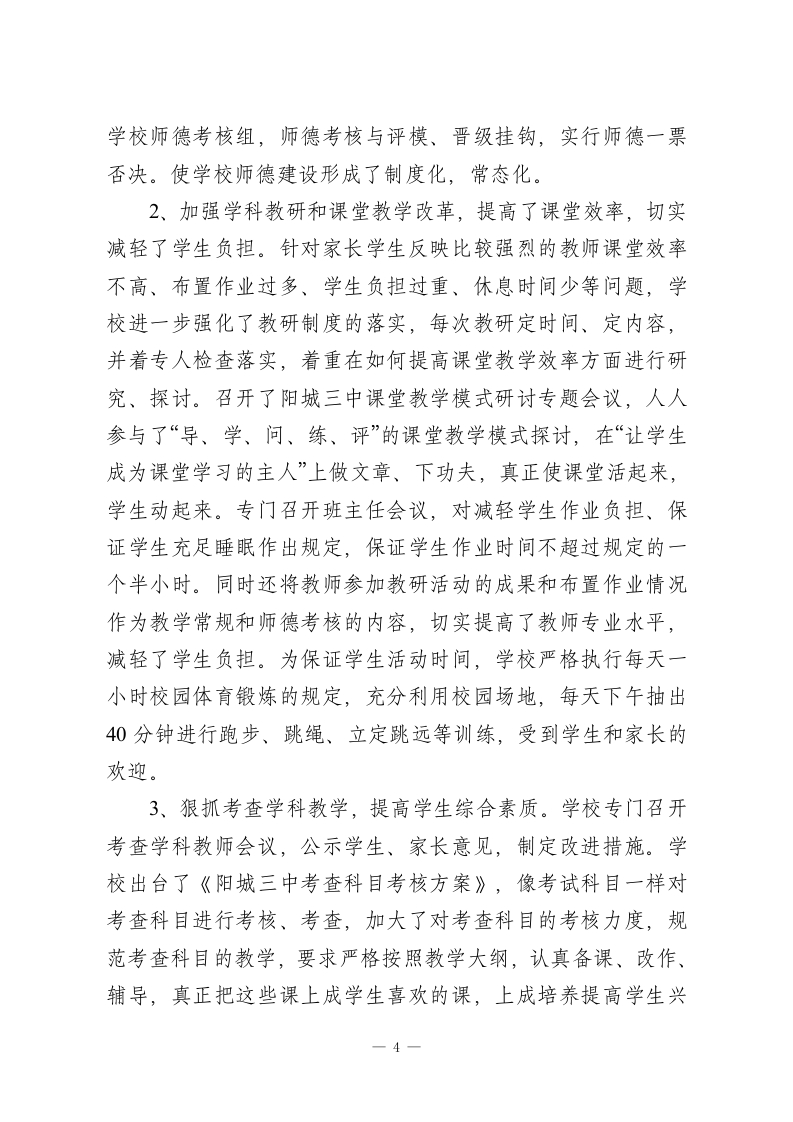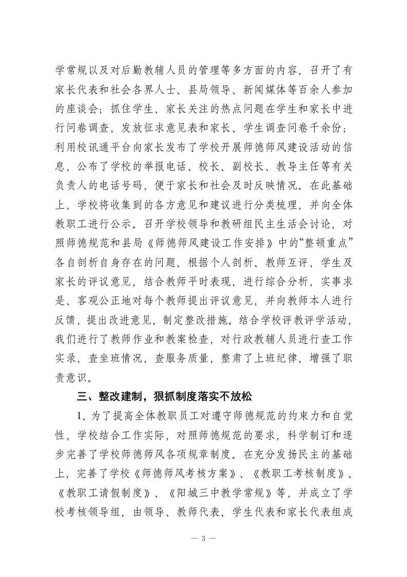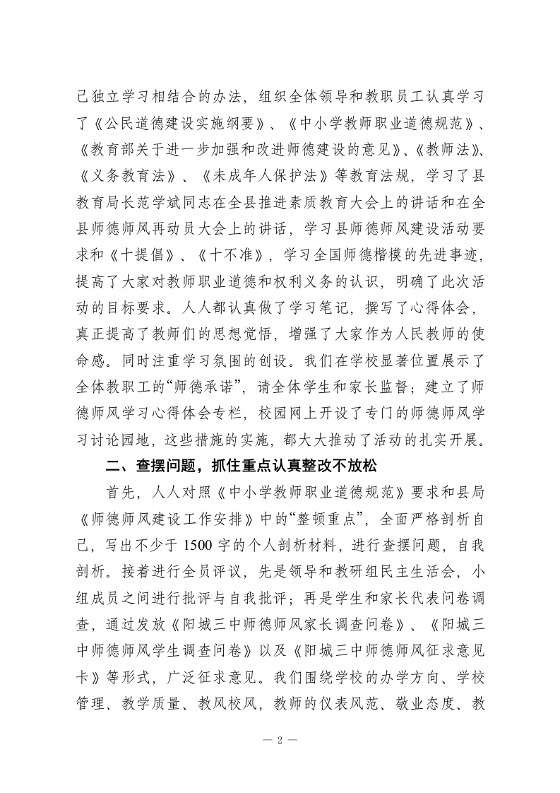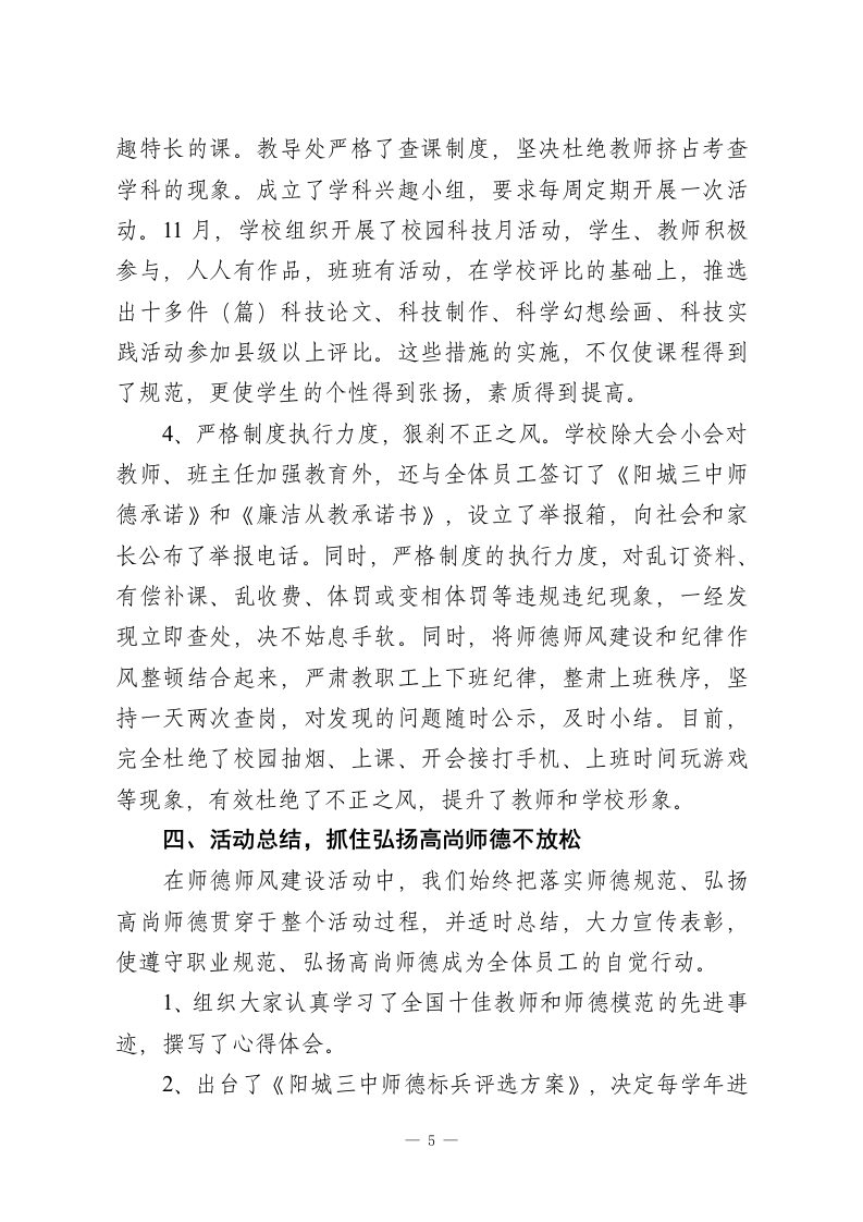 初高中教师师德师风2025年度考核工作总结为了切实搞好学校师德师风建设,根据省教育厅和市县的安排部署,依据《阳城县师德师风建设实施方案》,结合我校的实际情况,自20xx年10月下旬日至12月底,我校认真开展了“师德师风”建设活动,通过学习教育、查摆问题、分析梳理、整改建制和认真总结,全体教职工思想认识进一步提高,职业道德进一步规范,教师良好形象有了新的提升,现从以下几方面对我校的师德师风建设工作情况作出总结:一、领导重视,抓住思想教育不放松为切实加强对师德师风建设活动的领导,学校专门建立了“师德师风建设活动领导小组”,由学校校长成海军任组长,副校长常周元和王凌毅任副组长,各中层领导任成员,成立了专门的办公室,明确了各自的具体任务,切实加强对师德师风集中教育活动的领导。10月28日,召开了学校师德师风建设再动员大会,成海军校长作了动员报告,向全体教职工提出了“家长满意、学生喜欢、同行佩服的老师”的要求,副校长常周元和王凌毅作了具体安排,班主任和科任教师代表进行了表态发言,把此项活动列入学校教育教学工作中的一个重要组成部分,放在重要位置来抓。根据县教育局的要求,结合我校实际,半个月多时间,我们采取领导集中学习、全体教职工大会集体学习、班主任例会主题学习、教研组专题学习和教职工校园网上指导性学习和自1