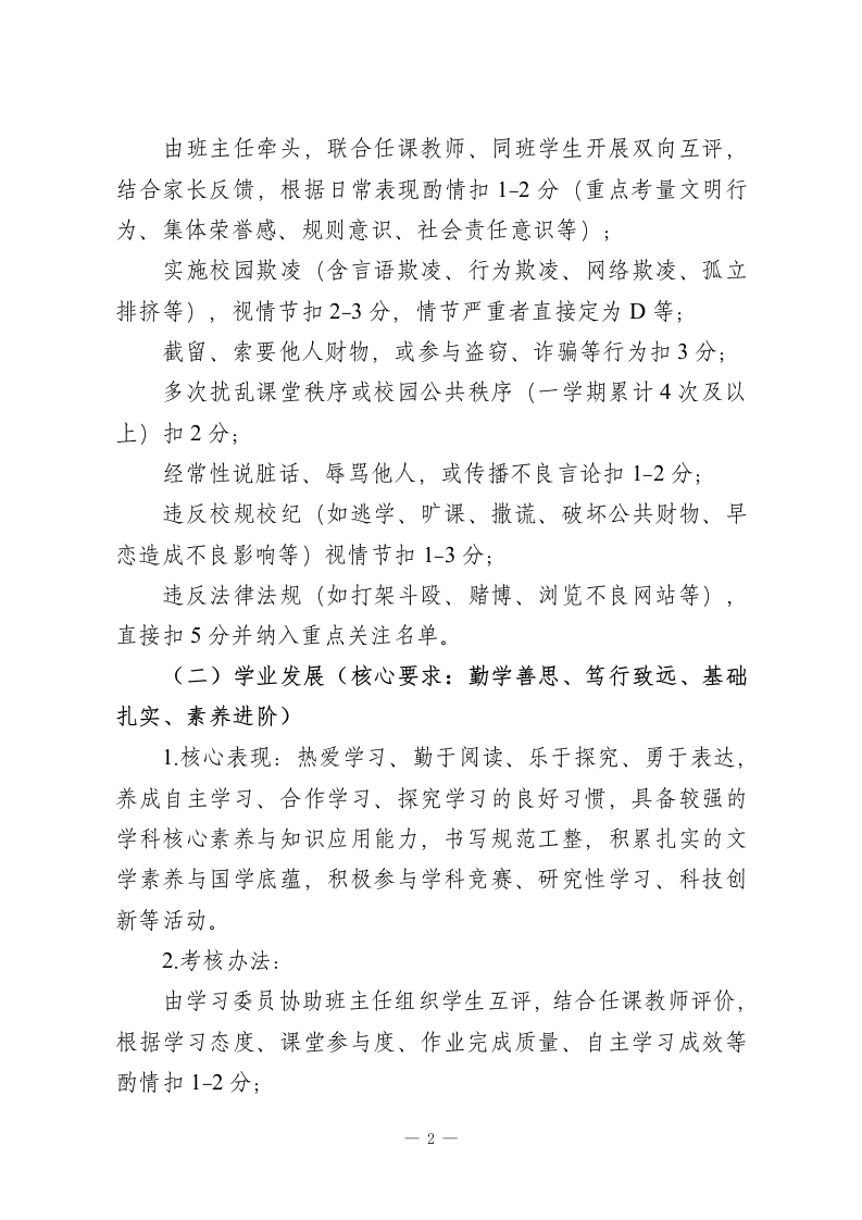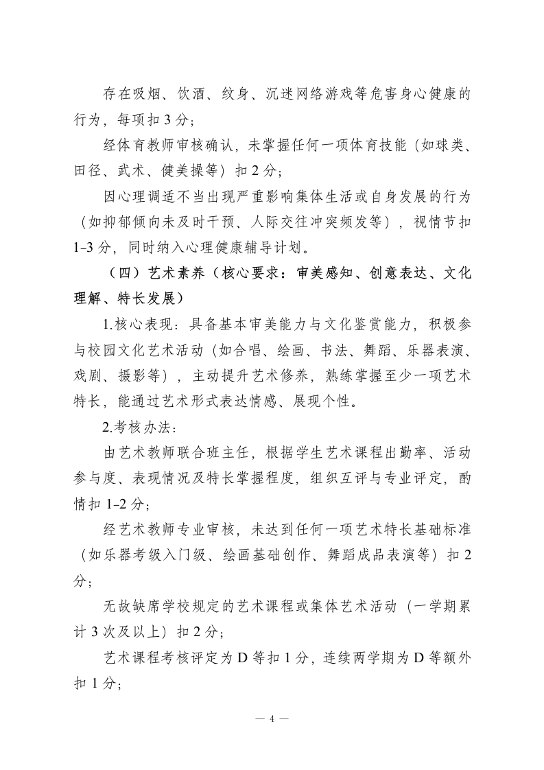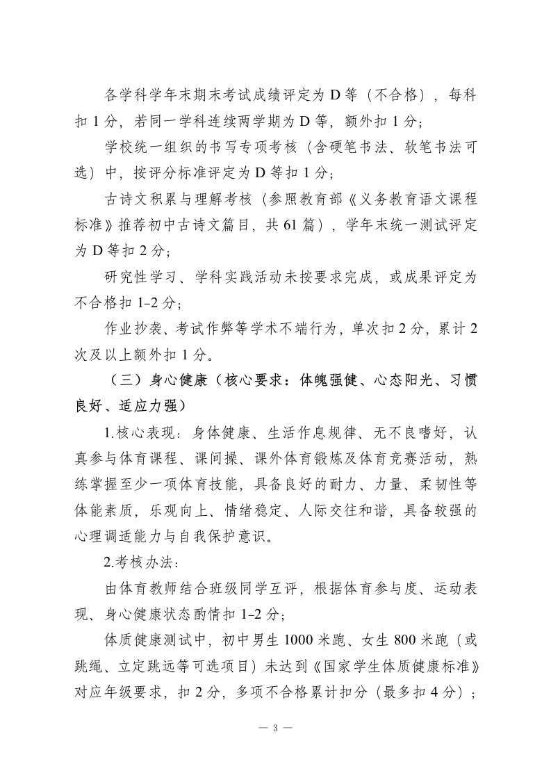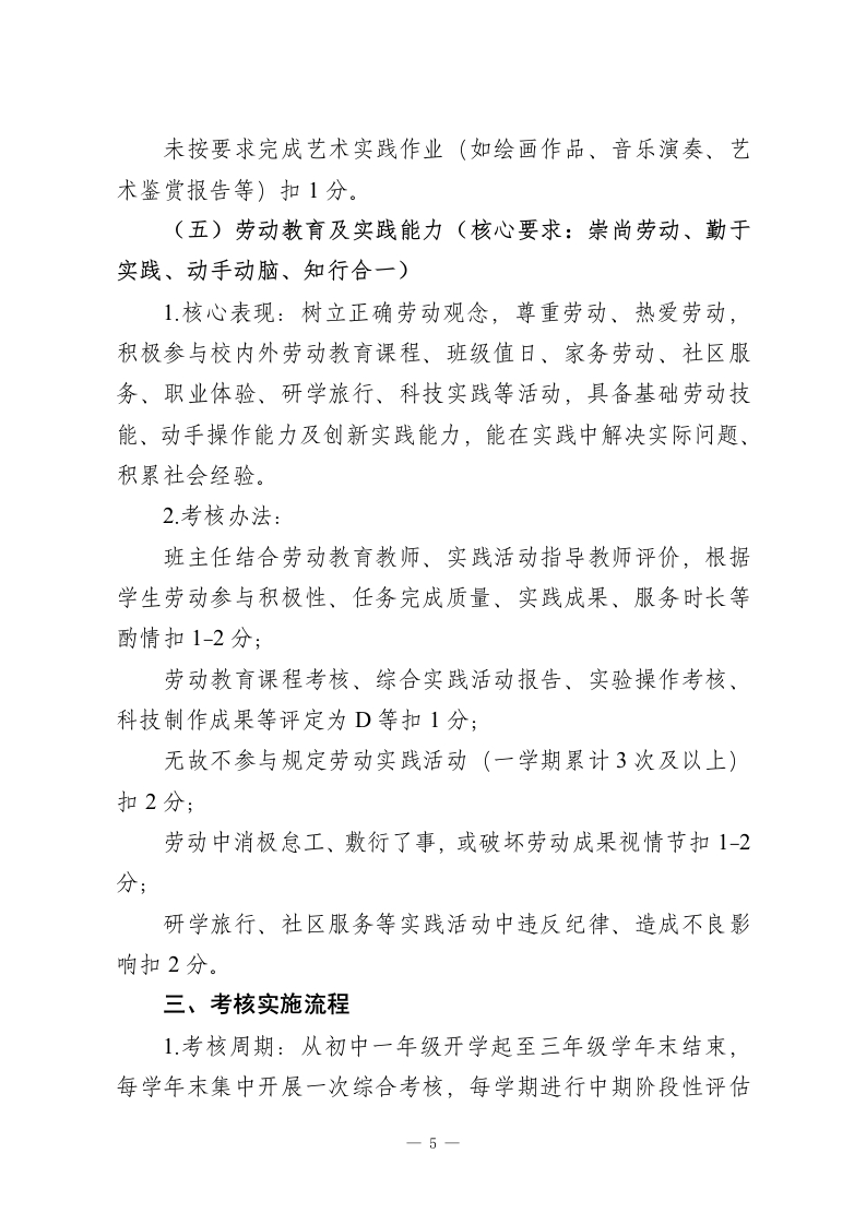 初中学生综合素质量化评价考核实施方案(2026版)一、考核宗旨以“五育并举”为核心,立足初中学生青春期成长规律与核心素养培育目标,通过系统化、量化式评价,全面记录学生学业发展、品德修养、身心健康、艺术素养及实践能力的成长轨迹,发挥评价的导向、激励与诊断功能,促进学生自主发展、全面发展、个性发展,为中考衔接及高中阶段教育选拔提供客观依据,适配辽宁省新高考改革对初中阶段综合素质培养的前置要求。二、考核内容及实施办法考核围绕品德发展、学业发展、身心健康、艺术素养、劳动教育及实践能力五大维度展开,采用“基础表现+专项考核+自主发展”相结合的评价方式,基础分为100分,实行扣分制(正向突出表现纳入荣誉评选及综合素质档案,作为中考参考依据,不直接加分)。(一)品德发展(核心要求:崇德修身、明礼守信、责任担当、遵纪守法)1核心表现:待人和善、言行文明、诚实守信、知恩感恩、关爱集体、遵守校规校纪及法律法规,积极参与志愿服务、公益活动及校园文明建设,理性使用网络,无校园欺凌、违纪违法等不良行为记录,具备基本社会责任感。2.考核办法: