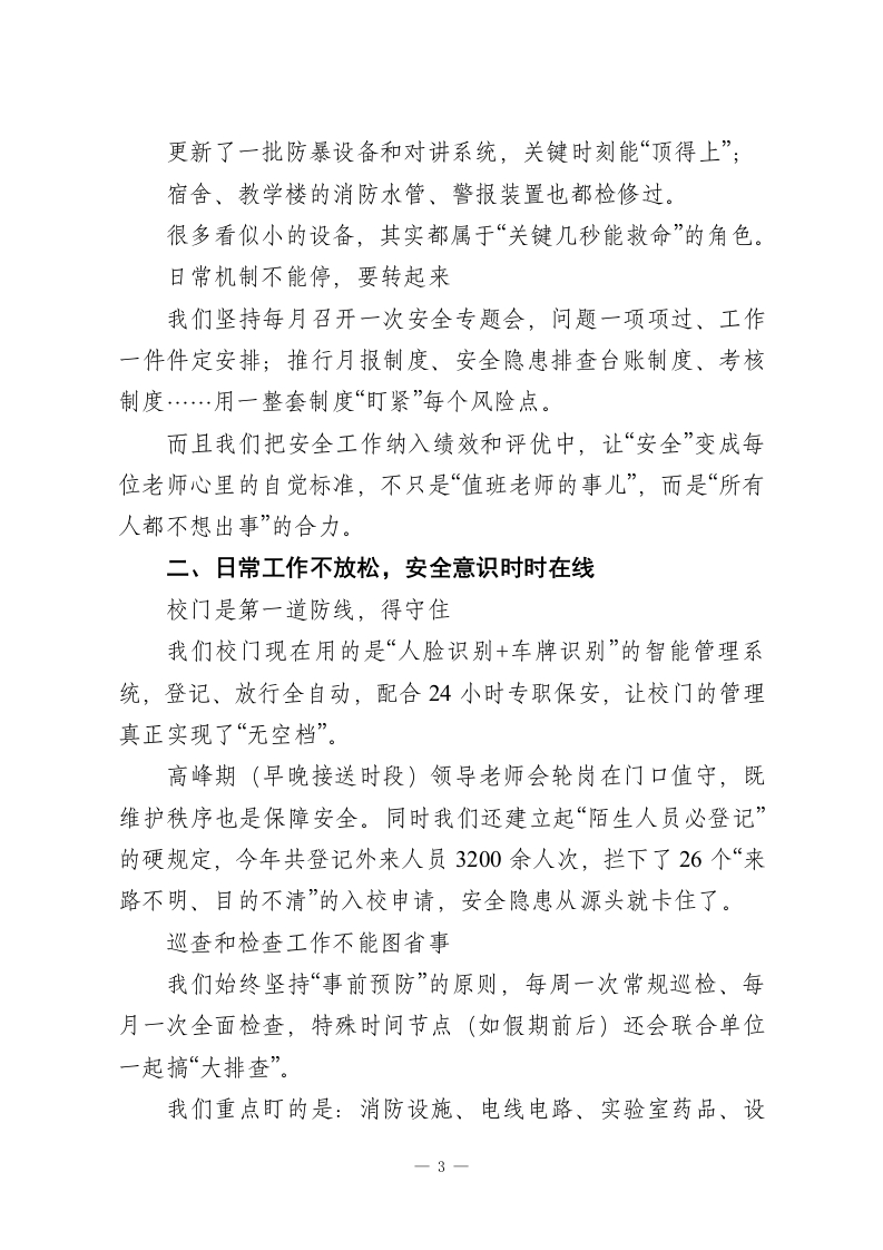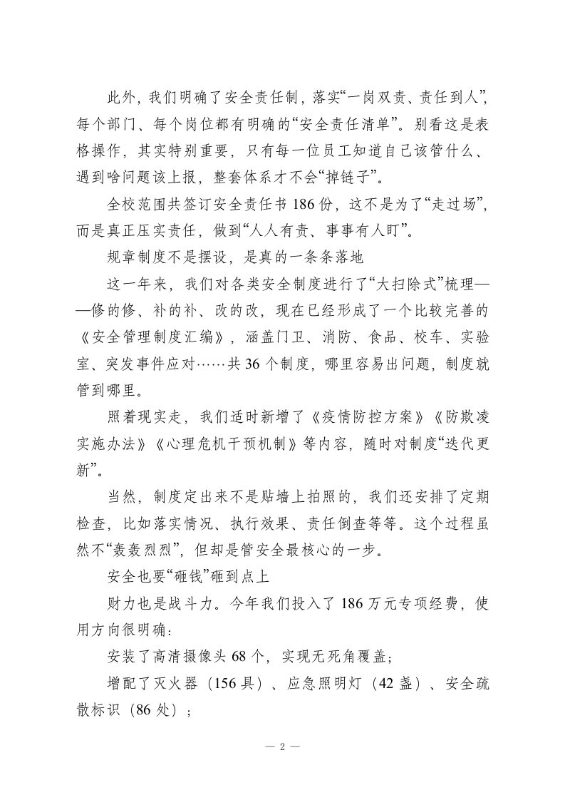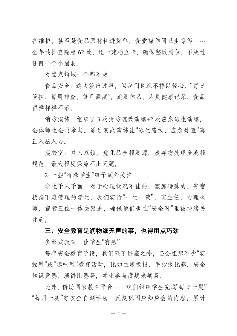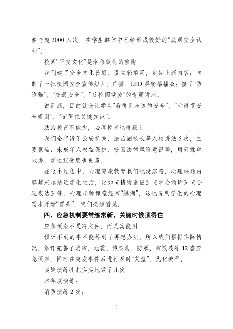分管安全副校长工作总结:安全责任落实到每一个部门、每一个岗位、每一个人员,真正做到安全工作事事有人管、人人有责任说到学校安全,只有八个字:“重中之重、不能有失”。这是关乎几千名学生、上百位教职工生命财产的大事,更直接影响着校园的稳定运行,背后甚至牵扯万千家庭的幸福感、安全感。作为分管安全的副校长,我很清楚,这份工作不仅仅是责任重大,更多的时候是要有一颗时时紧绷的“安全弦”。这一年,我们在学校党委的指导下,在全体教职员工配合下,始终把安全放在第一位,说实话,许多日常工作“看起来没事”,其实正是这“看起来安全”,背后是无数细节的严管和执行。我们的思路很清晰:以建设“平安校园”为核心目标,把责任抓实、管理做细、机制打牢、教育跟上、人防物防技防同步提升。一年来,没有发生一起重大安全事故,我们既欣慰,更清醒。下面具体回顾一下。一、把基础打牢,制度机制先走在前面安全管理先从组织架构抓起我们首先调整和完善了学校的安全管理组织架构。校长亲自担任领导小组组长,我作为分管领导牵头,下设安全办,安排了3名专职安全员,各职能部门全程参与。