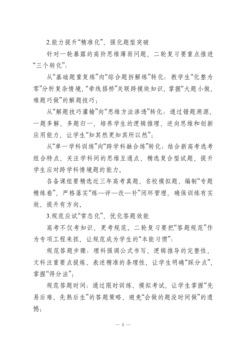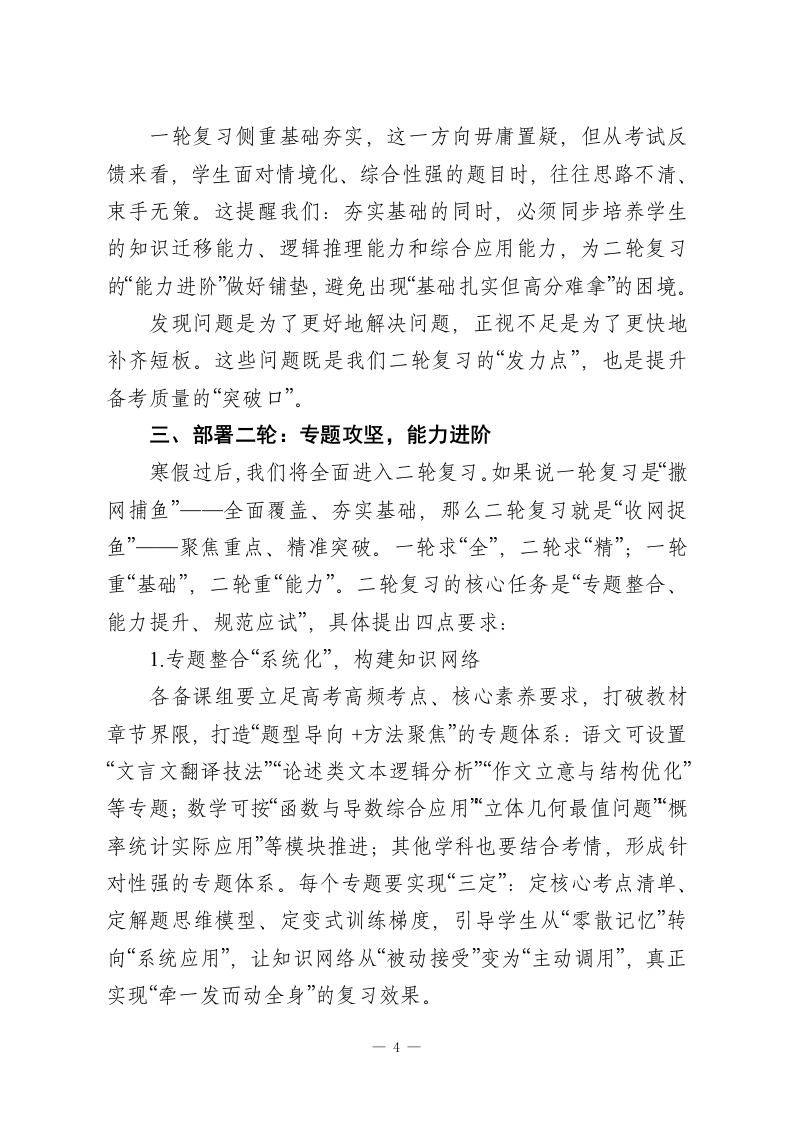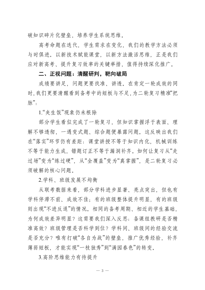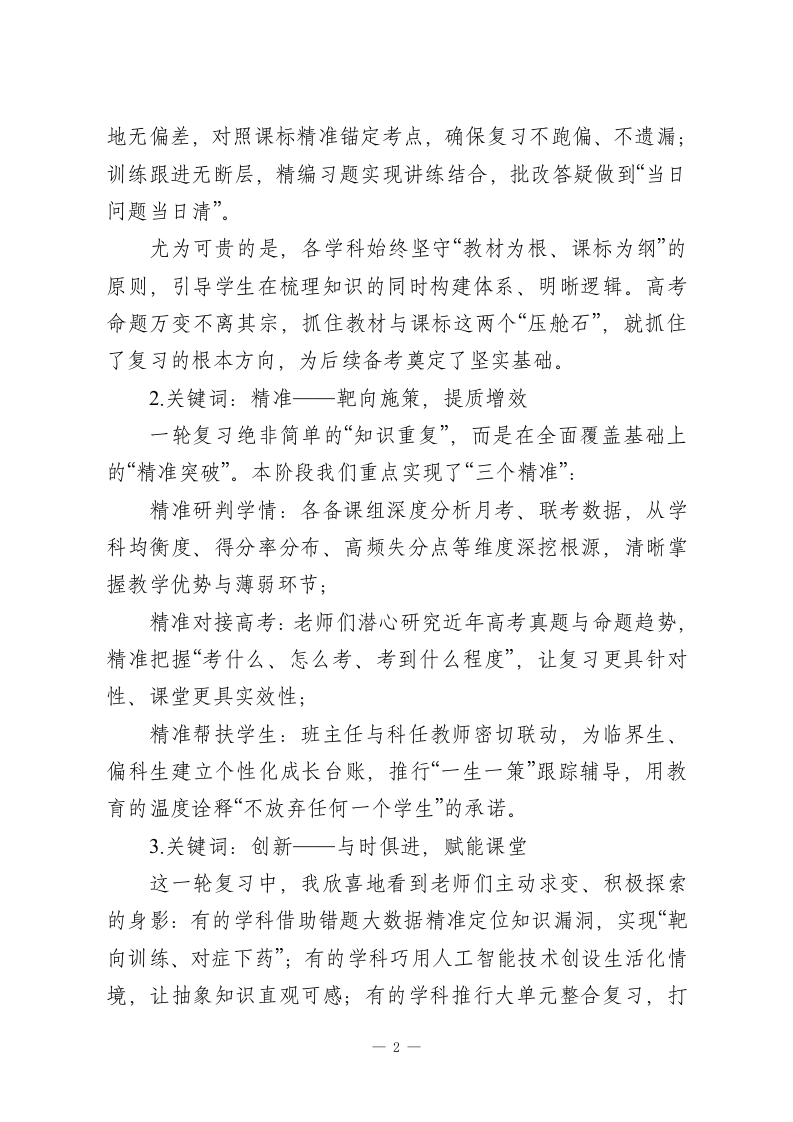 高三一轮复习总结会,校长讲话:一轮沉淀筑底气,二轮攻坚创佳绩各位奋战在高三一线的老师们:大家好!时序流转,攻坚正酣。今天我们齐聚一堂,召开高三年级一轮复习总结会,既是对过去四个多月备考工作的系统复盘、成果梳理,更是对二轮复习的精准谋划、靶向发力。首先,我代表学校,向每一位坚守岗位、深耕课堂的高三教师致以最诚挚的敬意与感谢一一感谢你们以披星戴月的坚守诠释教育担当,以精益求精的付出浇灌学生成长,以不离不弃的托举温暖每一个追梦心灵!一轮复习是高考备考的“奠基工程”,如同建筑施工中的地基浇筑,根基扎得深、打得实,后续的能力提升、冲刺拔高才能稳步推进。今天,我将围绕“回顾一轮成效、正视现存问题、部署二轮重点、共勉奋进初心”四个方面,与大家深入交流。一、回顾一轮:三维发力,成效扎实可感从9月开学至今,四个多月的一轮复习已圆满收官。整体来看,全年级复习推进有序、落实有力、亮点纷呈,我用三个关键词概括这一阶段的工作成效:1关键词:扎实一根基筑牢,靶向落地一轮复习的核心是“回归教材、夯实基础、全面覆盖”。各备课组紧扣这一核心,实现了“三个无死角”:知识梳理无死角,通过集体备课逐章逐节拆解教材,构建完整知识体系;考点落一1