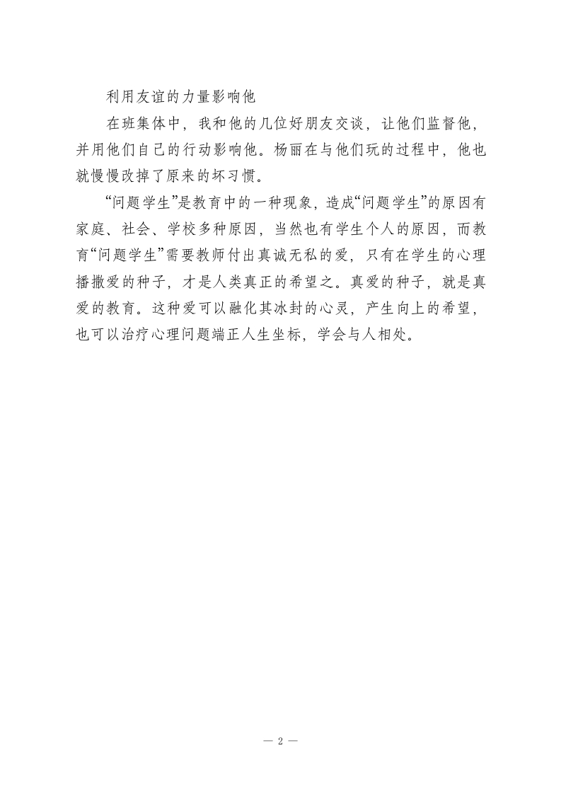 教师师德师风2025年度对于留守儿童工作考核总结“x,上课为什么睡着了?”他站起来,满脸通红,一语不发。低着头。经过课下询问,他是由于在家里玩游戏没有睡好。怎样帮助他,使他合理安排学习与玩乐的时间呢?每个学生都有着不同的性格、习惯,而形成他的性格又有多方面的因素,有来自家庭的教育方法,有来自社会的影响等方方面面。袁小奎,父母离异,跟着爷爷奶奶生活,没有人真正关心他的学习和心理健康。正是由于在这样的环境下生活,才使他养成了这样一个坏毛病。这与他得不到真正的爱和关心有着非常重要的关系。改变这些不能急于一时,要慢慢感化他,我们必须坚持不懈去努力,全方位入手,有针对性的对他进行“矫治”。从点滴之处去关心他,爱他,感化他父母离异,对学生的打击是很大的,对于一个高中生来说,缺少了父母的爱就如同失去了半个天空,生活中少了许多快乐。抓住点滴进步,大力表扬现在流行着这样一句话:好学生是夸出来的。我赞同这句话。经过我的关注,他的坏习惯有所改善。在每周一次的班会上,我就拿这一个方面为例,表扬他一段时间的表现。同学们也为了让他进步,从小的事例中表扬他。使他的小小优点得到放大,让自己深知他的进步大家看在眼里,提高了他在老师与学生心中的地位。