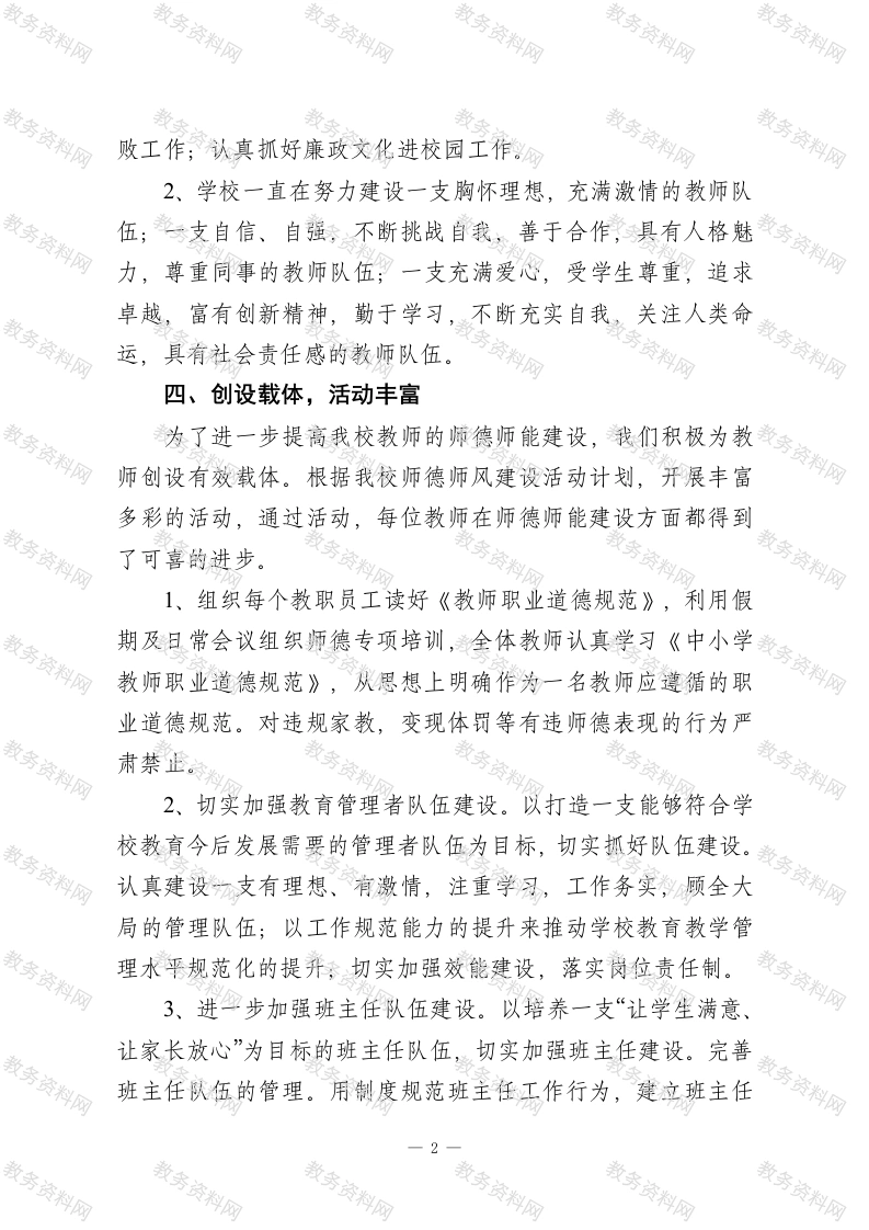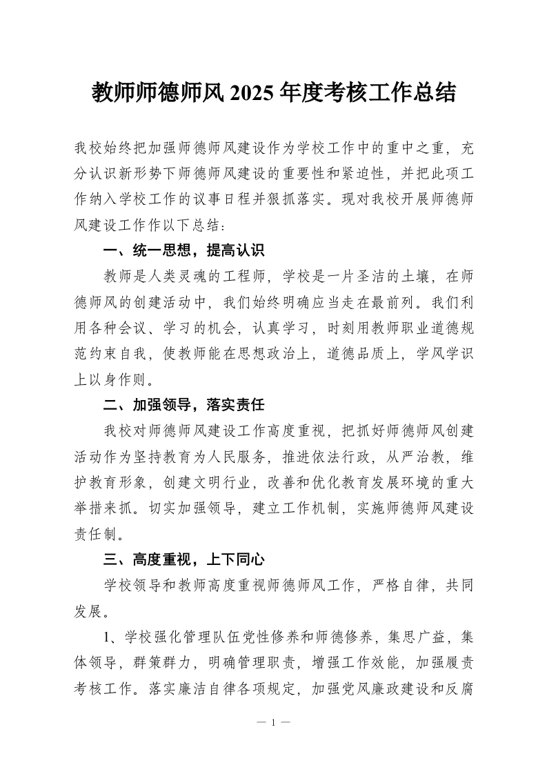 教师师德师风2025年度考核工作总结我校始终把加强师德师风建设作为学校工作中的重中之重,充分认识新形势下师德师风建设的重要性和紧迫性,并把此项工作纳入学校工作的议事日程并狠抓落实。现对我校开展师德师风建设工作作以下总结:一、统一思想,提高认识教师是人类灵魂的工程师,学校是一片圣洁的土壤,在师德师风的创建活动中,我们始终明确应当走在最前列。我们利用各种会议、学习的机会,认真学习,时刻用教师职业道德规范约束自我,使教师能在思想政治上,道德品质上,学风学识上以身作则。二、加强领导,落实责任我校对师德师风建设工作高度重视,把抓好师德师风创建活动作为坚持教育为人民服务,推进依法行政,从严治教,维护教育形象,创建文明行业,改善和优化教育发展环境的重大举措来抓。切实加强领导,建立工作机制,实施师德师风建设责任制。三、高度重视,上下同心学校领导和教师高度重视师德师风工作,严格自律,共同发展。1、学校强化管理队伍党性修养和师德修养,集思广益,集体领导,群策群力,明确管理职责,增强工作效能,加强履责考核工作。落实廉洁自律各项规定,加强党风廉政建设和反腐1