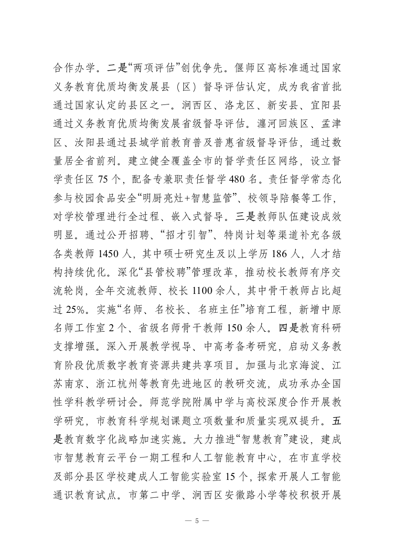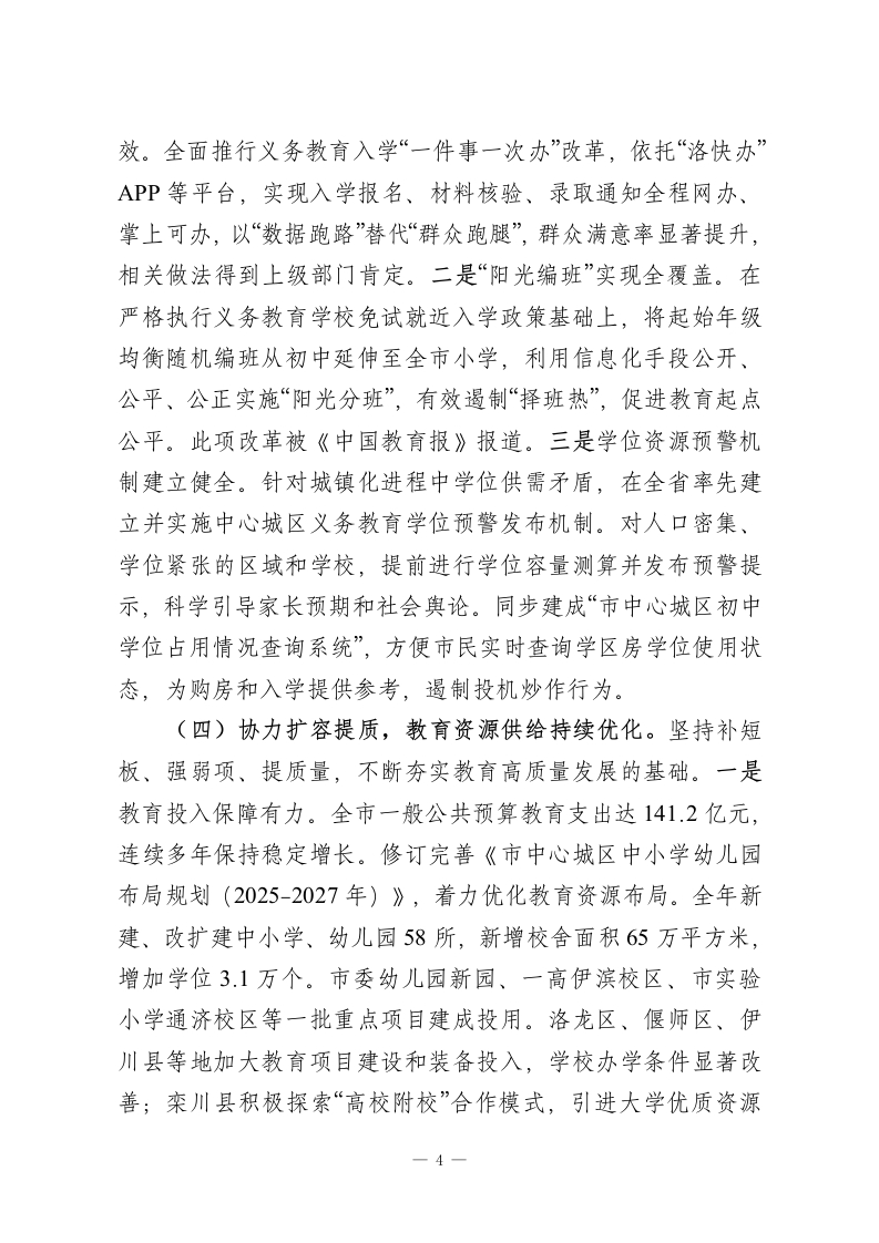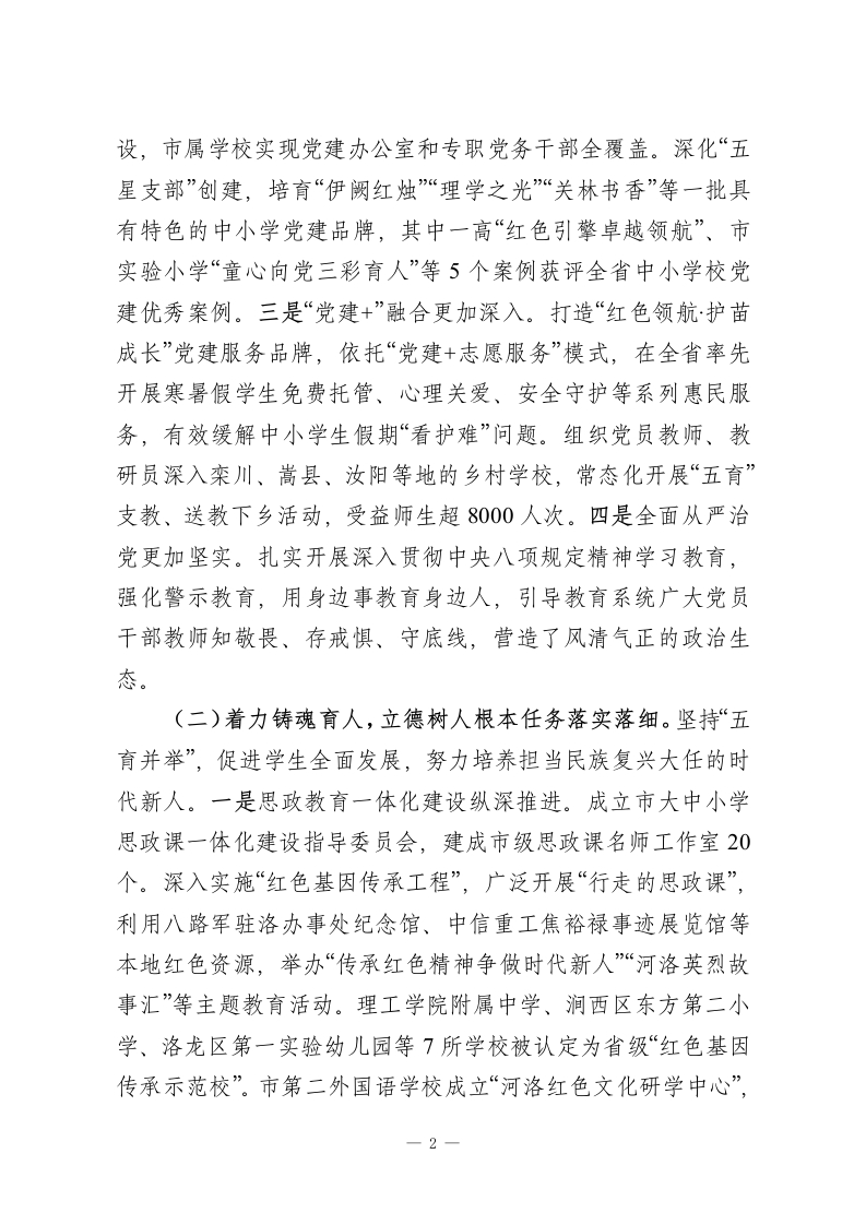 市教育局党组2025年述职述廉述党建工作总结2025年,在市委、市政府的坚强领导下,市教育局党组坚持以习近平新时代中国特色社会主义思想为指导,全面贯彻党的二十大和二十届三中、四中全会精神,深入落实习近平总书记关于教育的重要论述,特别是视察及时的重要讲话重要指示精神,紧紧围绕全国、全省、全市教育大会部署要求,以“公平、优质、全面、融合”为发展导向,锚定“建强副中心、形成增长极、重振辉煌”目标,勇担使命、攻坚克难,推动教育事业高质量发展取得显著成效。一、2025年教育工作情况(一)聚力把舵领航,党对教育工作的领导全面加强。市委、市政府始终坚持教育优先发展战略,高位谋划、强力推动,为教育发展注入强劲动能。一是领导机制更加健全。市委常委会、市政府常务会全年专题研究教育工作18次,市委、市政府主要领导及分管领导就教育工作作出批示指示156次,深入学校调研、慰问教师、现场办公90余次。高规格召开全市教育高质量发展大会、庆祝第41个教师节暨表彰大会等重要会议,出台《关于加快推进教育现代化建设教育强市的实施意见》等关键文件,教育发展的顶层设计更加完善,支持力度空前加大。二是党建引领更加有力。全市中小学党组织领导的校长负责制全面建立并规范运行,实现应建尽建、应配尽配。创新实施“河洛教苑·党建强基”工程,扎实推进中小学校党务工作规范化建1