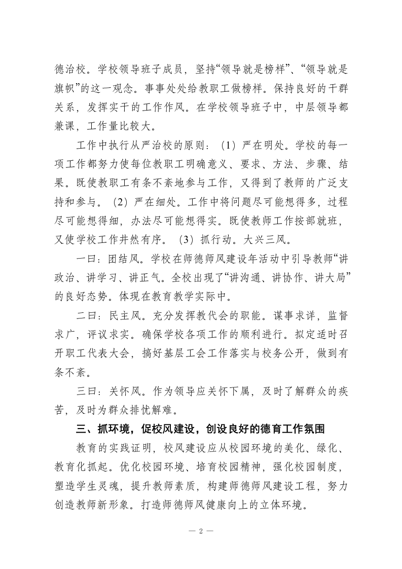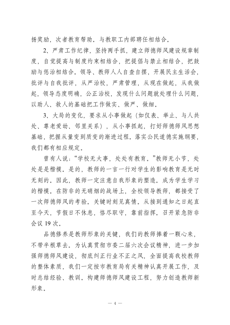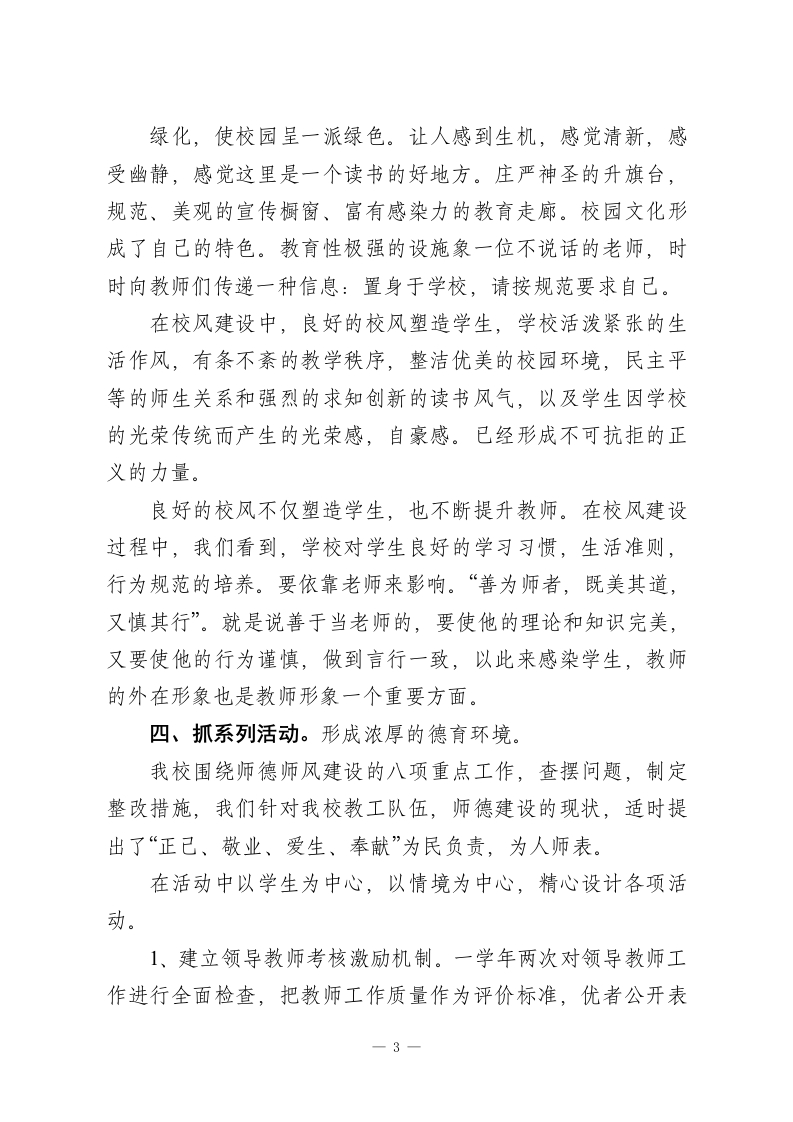 小学教师师德师风年度2025考核工作总结为强化师德、铸造师魂。我校教师进行了认真的讨论,大家清楚而又深刻地认识到:师德师风建设是关系到教育工作成败的大事,是德育工作顺利进行的可靠保证。建设一支师德高尚、素质精良的教师队伍,是提高教育教学质量的关键。在师德师风建设年活动中我们着重抓了以下几项工作。一、抓认识。以制度建设为把手,努力构建师德教育新机制师德是教师职业道德的灵魂,是教育艺术的基础和前提。在充分讨论大家取得共识的基础上,我校要求每一位教师时刻做好表率,在学生面前树立“严师慈母”的形象,在家长面前树立“最可信赖的人”形象,在社会上树立“最文明群体形象”,展示坦诚向上、整洁的精神风貌。在提高认识的基础上,我们制定了《五里小学师德师风建设实施方案》,制定师德师风检查方案,该方案对教师从正面提出了要求。又从反面划出了禁区。始终使教师以“传道、授业、奉献”为己任,视“正己、爱生、敬业”为天职。我们还采取多种形式,主动出击,争取学生家长和社会各界的监督和支持。对学生采取问卷调查,随机调查二、抓领导。以班子建设为核心,努力开创以德治校新路子成立了师德师风活动领导小组,校长负责,做到三落实:组织机构落实。制度落实。活动经费落实。全体教师参与,以-1-