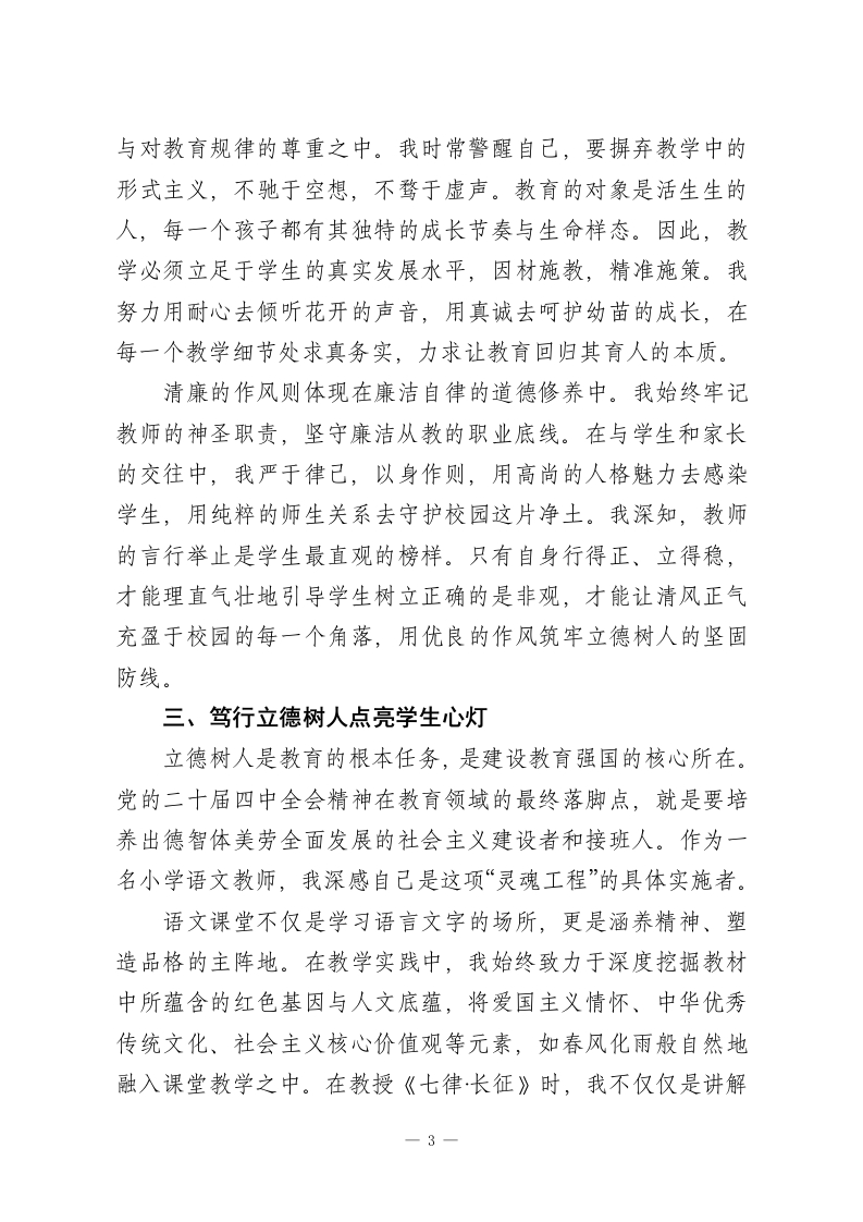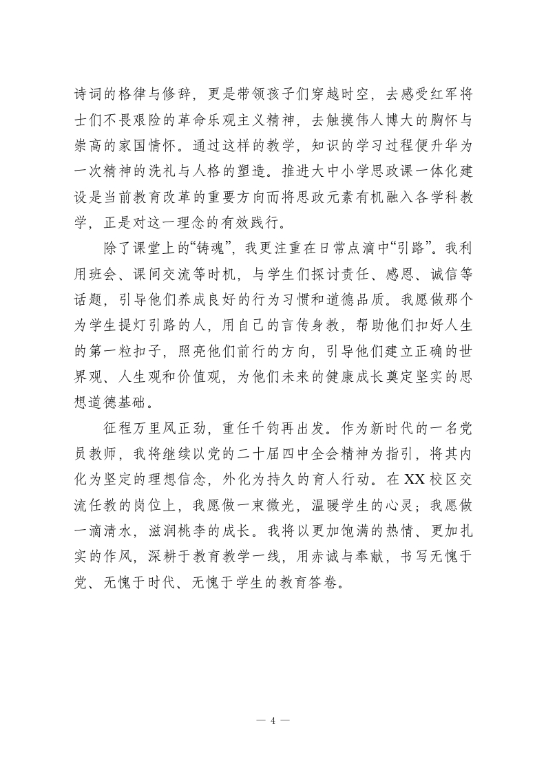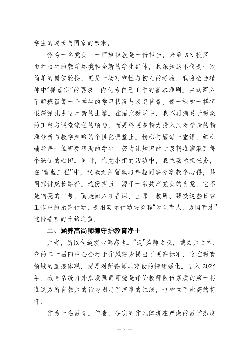 学习贯彻党的二十届四中全会精神心得体会(普通党员教师)时序进入2025年岁末,党的二十届四中全会精神如同冬日里的暖阳,照亮了前行的道路,温暖了每一位教育工作者的心房。作为一名普通的党员教师,能够参与到全国范围内学习贯彻全会精神的热潮中,我倍感荣幸与振奋。据统计,截至2025年12月,仅思政课教师群体就有超过80万人通过网络平台参与学习,线上学习人次更是超过1300万这宏大的数字背后,是千千万万像我一样的教育同仁对国家发展蓝图的深切关注和对育人使命的坚定承诺。今年,我从XX小学交流到XX校区任教,环境的变换带来了新的挑战,身份的叠加更赋子了沉甸甸的责任。在三尺讲台之上,我不仅是一名知识的传授者,更是一名党性的践行者。通过对全会精神的反复研读和深入思考,我更加清晰地认识到,全会擘画的“十五五”时期发展宏图不仅是国家层面的顶层设计,更是指导我个人在基层教育岗位上履职尽责的行动指南。结合自身的教学实践,我愿从一名党员教师的视角,分享几点真切而朴素的体会。一、深耕责任之田践行党员初心党的二十届四中全会强调了健全责任体系与落实机制的重要性,要求将宏伟蓝图转化为扎实行动。这一精神内核,对于教育工作而言,有着极为深刻的现实意义。教育是面向未来的事业,容不得半点虚浮与懈怠,每一份责任的落实,都关系到1