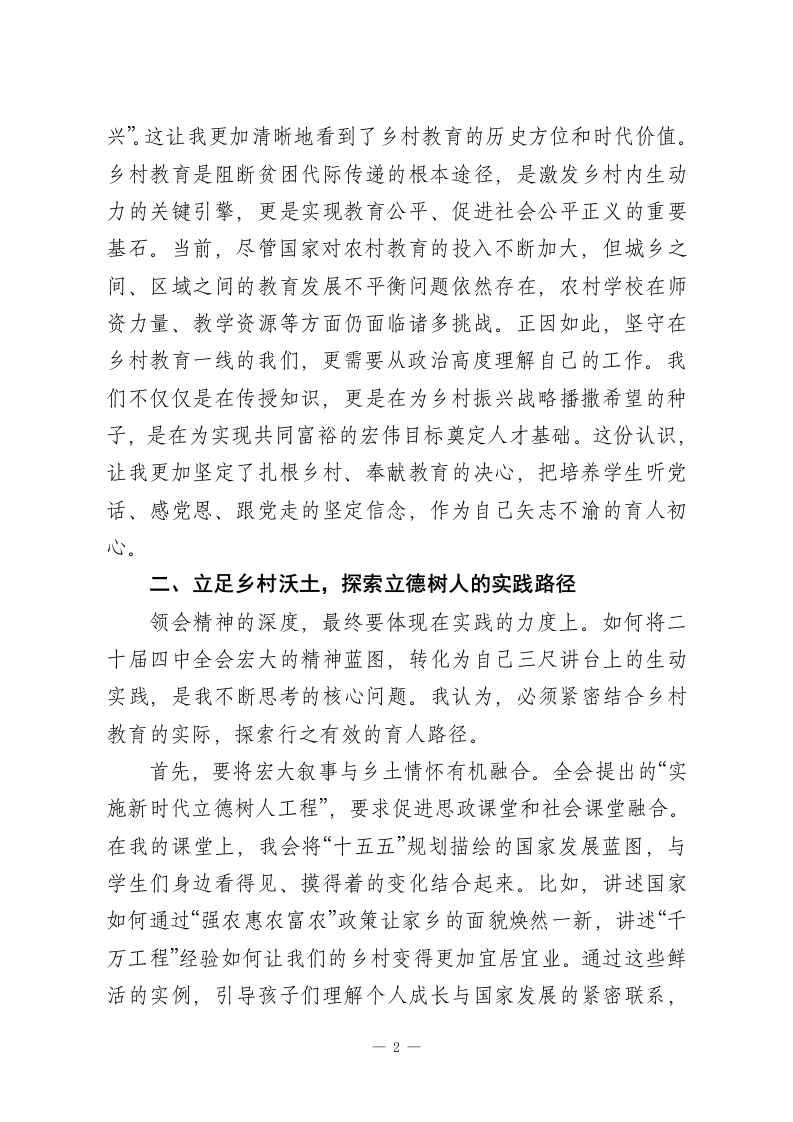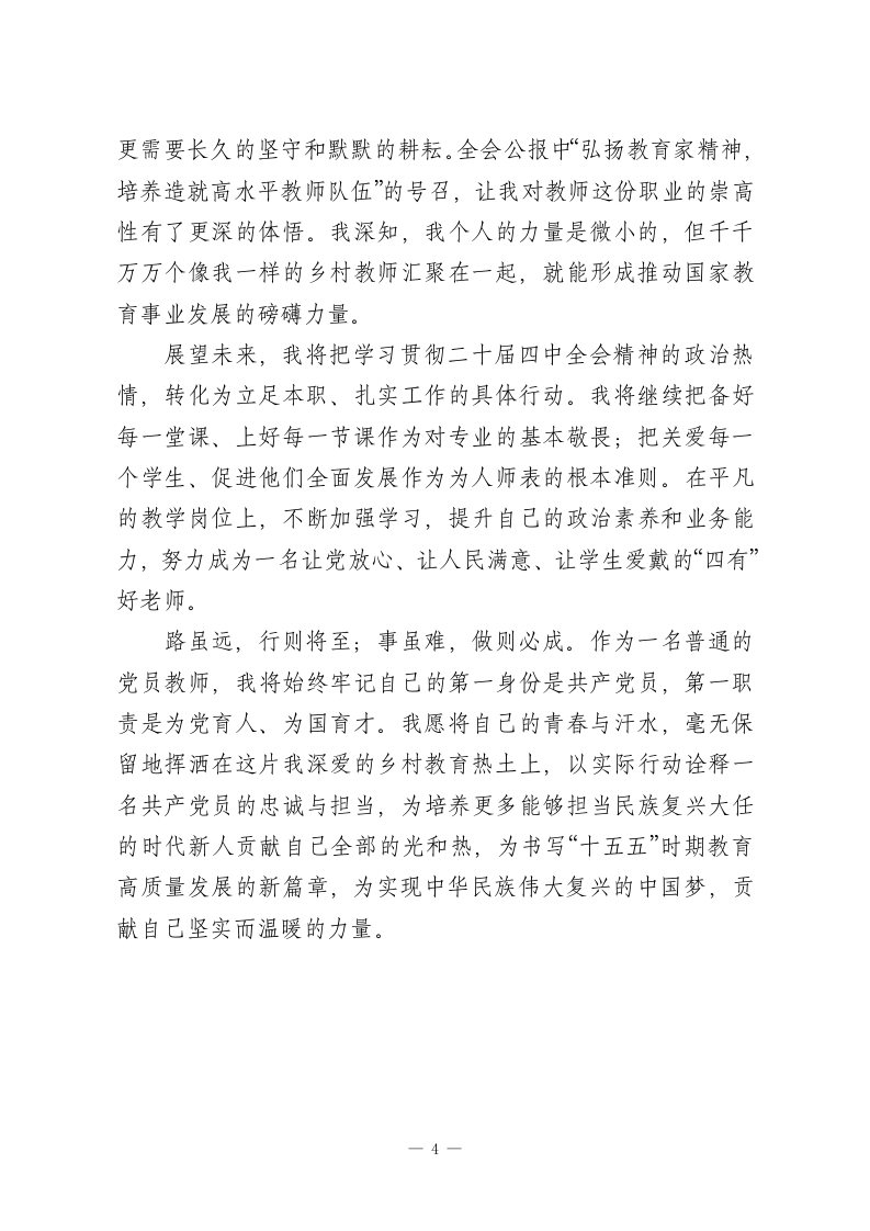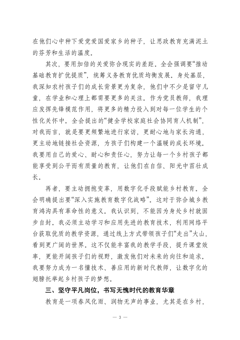 学习贯彻党的二十届四中全会精神心得体会(小学党员教师)作为一名在XX县XX小学任教的党员教师,我有幸参加了近期学校党委组织的党的二十届四中全会精神专题学习会。2025年10月在北京胜利召开的二十届四中全会,审议通过了《中共中央关于制定国民经济和社会发展第十五个五年规划的建议》,为我国未来五年的发展擘画了宏伟蓝图。通过系统学习和深入研讨,我深受鼓舞,倍感振奋,特别是全会公报中关于教育事业发展的新部署、新要求,让我对自已肩负的“为党育人、为国育才”使命有了更为深刻的认识和更为坚定的信念。身处乡村教育一线,我深知这不仅是一份职业,更是一份沉甸甸的责任。现结合个人思想与岗位实际,谈三点粗浅的体会。一、深化思想认识,筑牢为党育人的信念根基党的二十届四中全会,将“办好人民满意的教育”置于“十五五”规划的重要位置,强调要“实施新时代立德树人工程”,这充分体现了党中央对教育事业一以贯之的高度重视。学习全会精神,首先要解决的是思想认识问题,是“为何教、为谁教”的根本问题。作为一名党员教师,我深刻地认识到,我的讲台虽小,却紧密连接着国家的未来和民族的希望。我所面对的每一个乡村孩子,都是未来社会主义事业的建设者和接班人。因此,我的教育工作,必须旗帜鲜明地坚持党的全面领导,必须毫不动摇地贯彻党的教育方针。全会强调要“加快农业农村现代化,扎实推进乡村全面振-1-