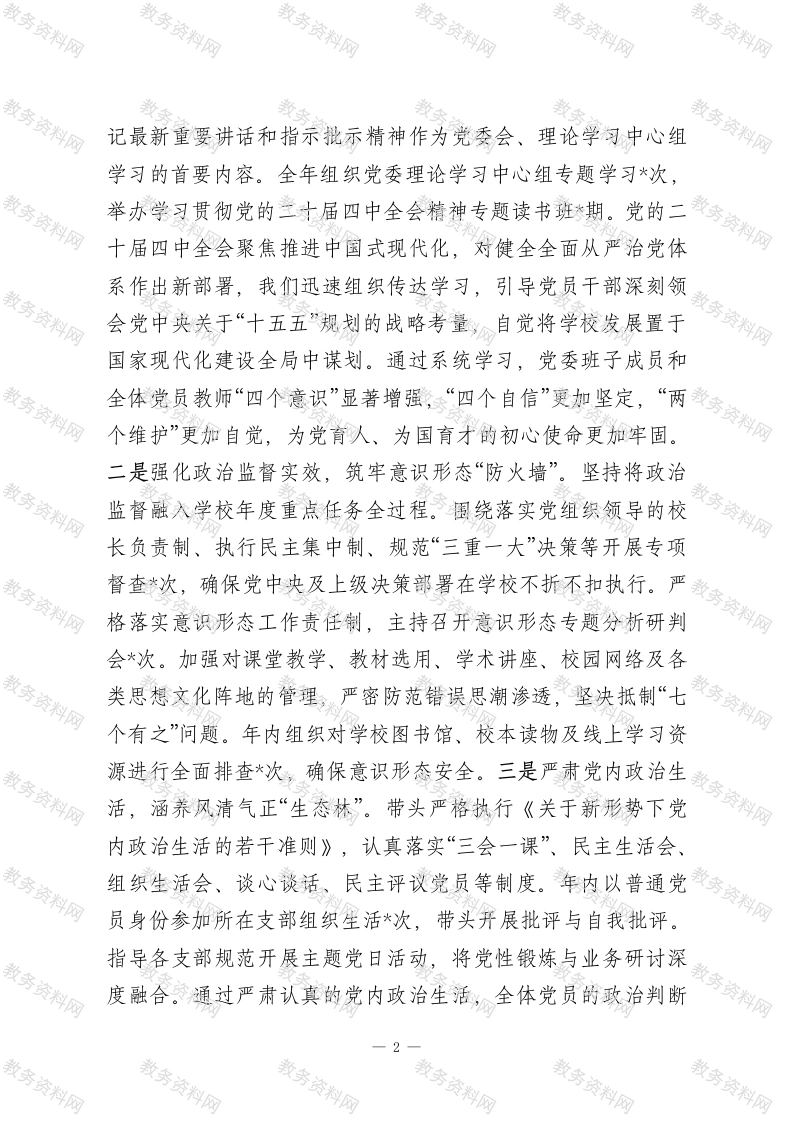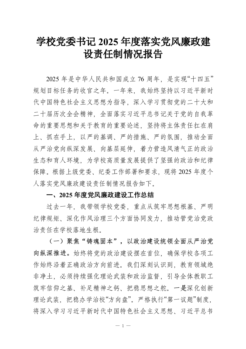 学校党委书记2025年度落实党风廉政建设责任制情况报告2025年是中华人民共和国成立76周年,是实现“十四五”规划目标任务的收官之年。一年来,我始终坚持以习近平新时代中国特色社会主义思想为指导,深入学习贯彻党的二十大和二十届历次全会精神,全面落实习近平总书记关于党的自我革命的重要思想和关于教育的重要论述,坚持将主体责任扛在肩上、抓在手上,以严的基调、严的措施、严的氛围,推动全面从严治党向纵深发展、向基层延伸,着力营造风清气正的政治生态和育人环境,为学校高质量发展提供了坚强的政治和纪律保障。根据上级党委、纪委工作部署和要求,现将2025年度个人落实党风廉政建设责任制情况报告如下。一、2025年度党风廉政建设工作总结过去一年,我带领学校党委,重点从筑牢思想根基、严明纪律规矩、深化作风治理三个方面协同发力,推动管党治党政治责任在学校落地生根。(一)聚焦“铸魂固本”,以政治建设统领全面从严治党向纵深推进。始终将党的政治建设摆在首位,确保学校各项工作始终沿着正确政治方向前进。我们深刻认识到,教育领域绝非净土,必须持续强化理论武装和政治监督,引导全体教职工筑牢信仰之基、补足精神之钙、把稳思想之舵。一是深化创新理论武装,把稳办学治校“方向盘”。严格执行“第一议题”制度,将深入学习习近平新时代中国特色社会主义思想、习近平总书1