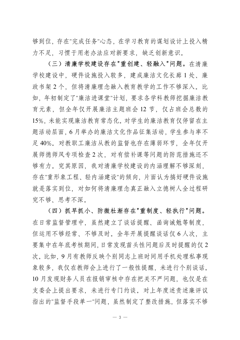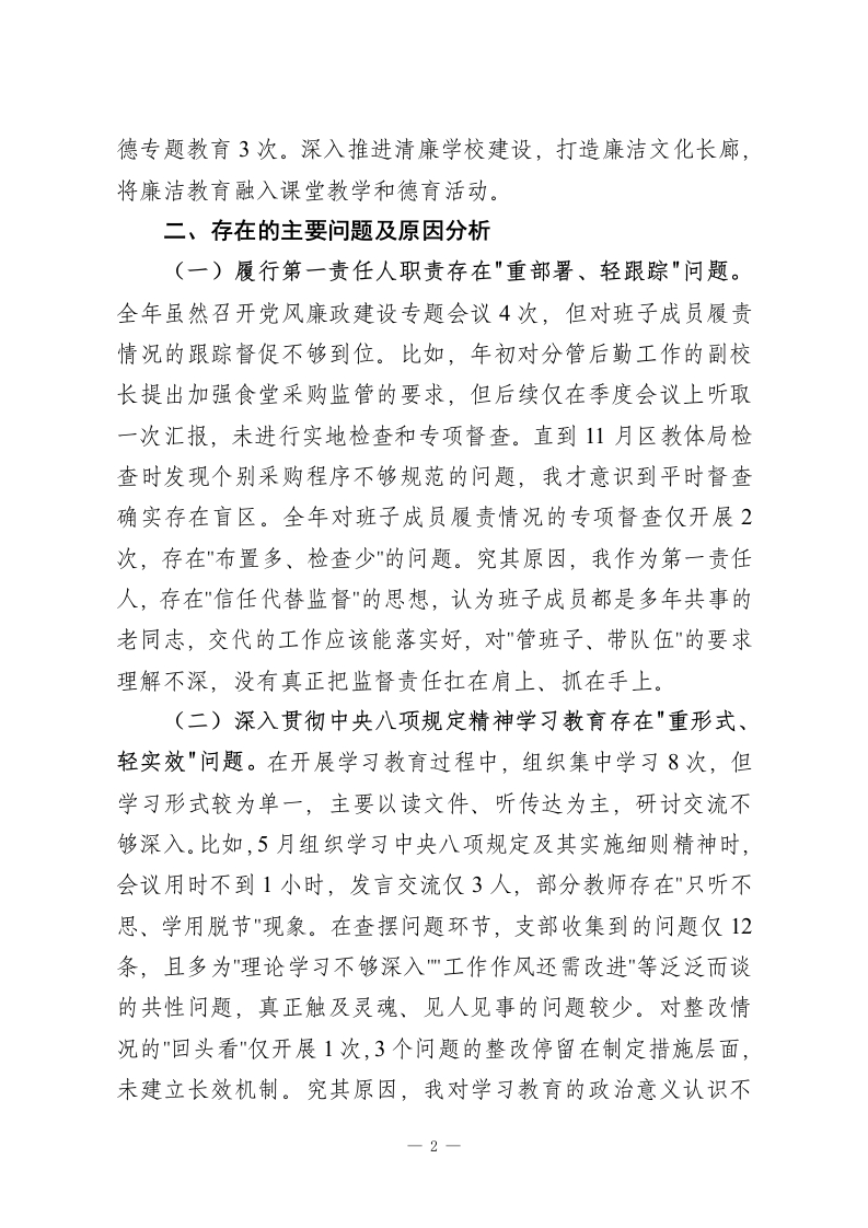 学校党委书记2025年落实全面从严治党主体责任述职报告2025年,我认真履行全面从严治党第一责任人职责,坚持以习近平新时代中国特色社会主义思想为指导,深入学习贯彻党的二十大和二十届二中、三中、四中全会精神,贯彻落实习近平总书记视察山东重要讲话和视察枣庄重要指示精神,落实区委十一届七次、八次、九次全会部署和区纪委五次全会精神,扎实开展深入贯彻中央八项规定精神学习教育,推动清廉学校建设。现将履责情况报告如下:一、主要做法及成效一是抓政治建设强引领。坚持把政治建设摆在首位,组织班子成员和全体党员学习党的二十届四中全会精神及习近平总书记视察山东重要讲话精神12次,开展"第一议题"学习18次。严格执行民主集中制,全年召开党支部委员会16次,"三重一大"事项全部集体研究决定。扎实开展深入贯彻中央八项规定精神学习教育,一体推进学查改,全体党员签订廉洁承诺书,组织观看警示教育片3部。二是抓责任落实促担当。对重要工作亲自部署、重大问题亲自过问,全年听取班子成员分管领域工作汇报8次,与班子成员开展谈心谈话26人次。制定党风廉政建设责任清单,逐项分解任务到人,每季度听取落实情况汇报。积极配合上级巡视巡察,对反馈的3个问题已全部整改到位。三是抓队伍建设固根本。严格落实新时代好干部标准,发展党员2名,培养入党积极分子4名。加强师德师风建设,开展师1