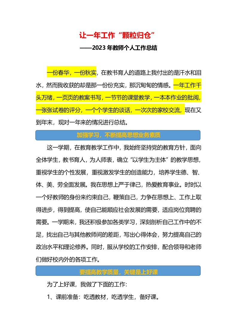让一年工作“颗粒归仓”—2023年教师个人工作总结份春华,一份秋实,在教书育人的道路上我付出的是汗水和泪水,然而我收获的却是那一份份充实,那沉甸甸的情感。一年工作干头万绪,一页页的教案书写,一节节的课堂教学,一本本作业的批阅,一张张试卷的评分,一个个学生的谈话,一次次的家校交流,现在又到年末,现对一年来的情况进行总结。加强学习,不断提高思想业务素质这一学期,在教育教学工作中,我始终坚持党的教育方针,面向全体学生,教书育人,为人师表,确立“"以学生为主体”的教学思想,重视学生的个性发展,重视激发学生的创造能力,培养学生德、智、体、美、劳全面发展。我在思想上严于律己,热爱教育事业。时时以一个好教师的身份来约束自己,鞭策自己,力争在思想上、工作上取得进步,得到提高,使自己能顺应社会发展的需要,适应岗位竞聘的需要。一学期来,我还积极参加各类学习,深刻剖析自己工作中的不足,找出自己与其他教师间的差距,写出心得体会,努力提高自己的政治水平和理论修养。同时,服从学校的工作安排,配合领导和老师们做好校内外的各项工作。要提高教学质量,关键是上好课为了上好课,我做了下面的工作:1、课前准备:吃透教材,吃透学生,备好课。