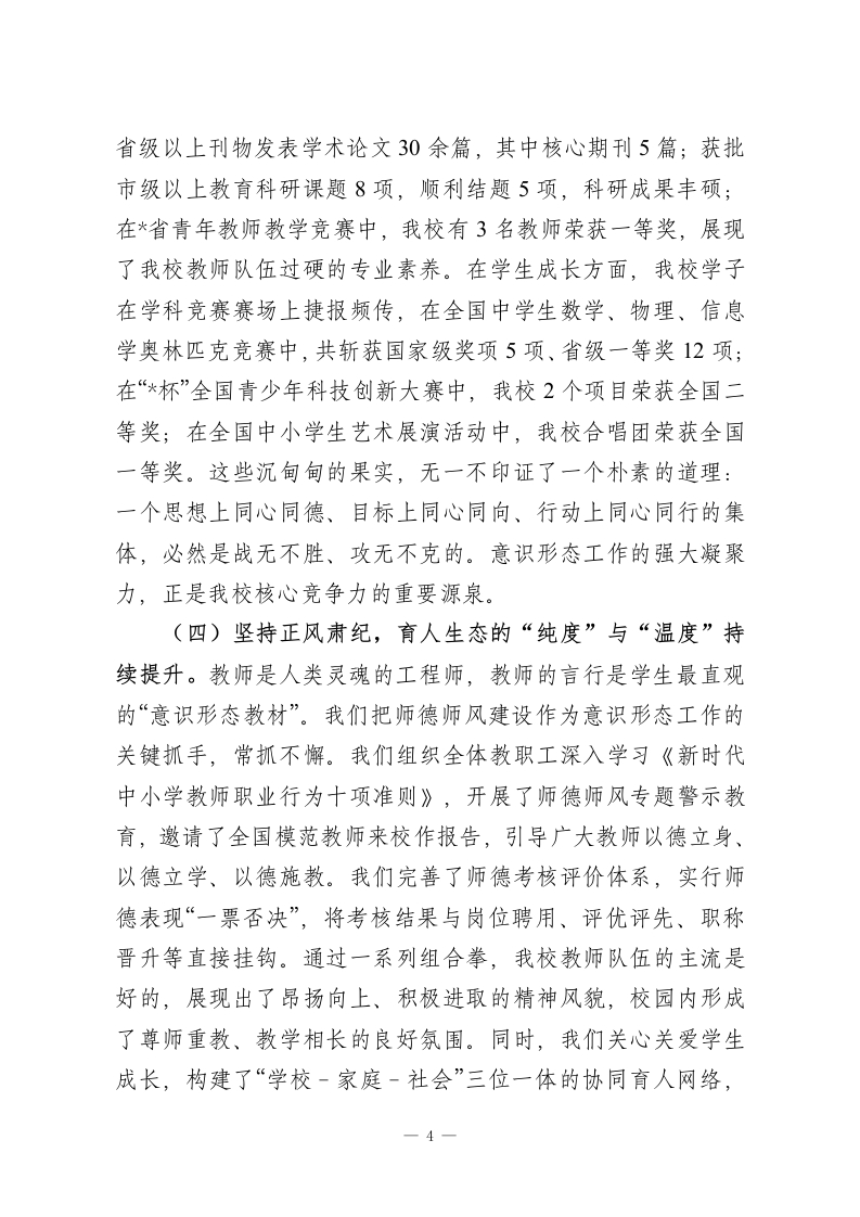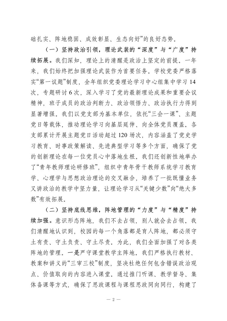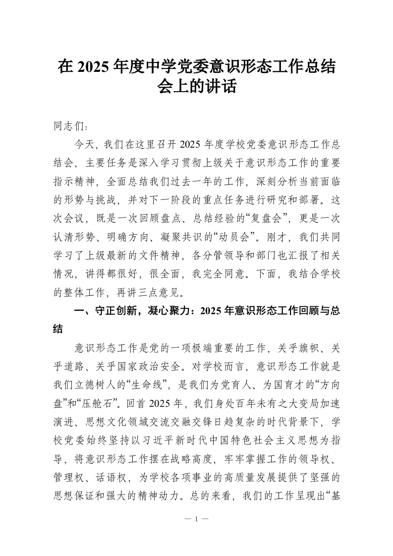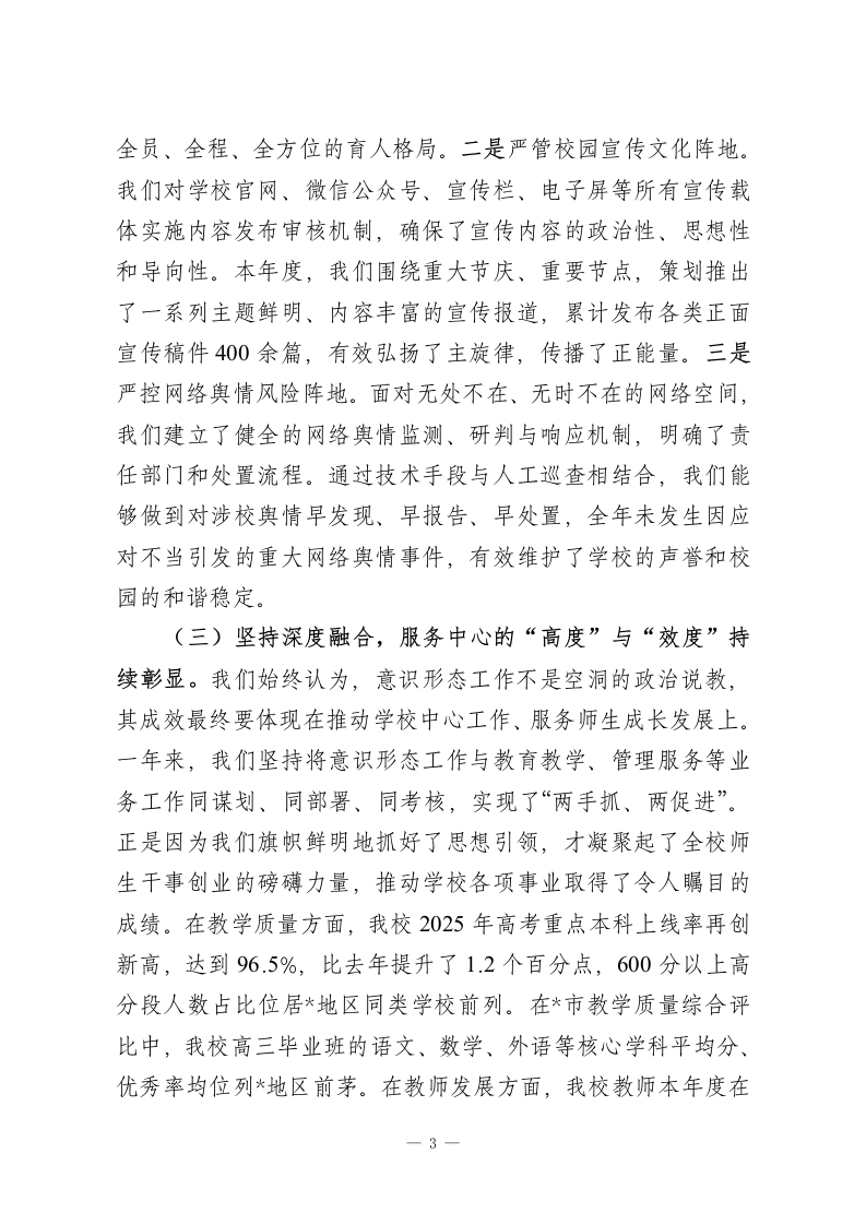 在2025年度中学党委意识形态工作总结会上的讲话同志们:今天,我们在这里召开2025年度学校党委意识形态工作总结会,主要任务是深入学习贯彻上级关于意识形态工作的重要指示精神,全面总结我们过去一年的工作,深刻分析当前面临的形势与挑战,并对下一阶段的重点任务进行研究和部署。这次会议,既是一次回顾盘点、总结经验的“复盘会”,更是一次认清形势、明确方向、凝聚共识的“动员会”。刚才,我们共同学习了上级最新的文件精神,各分管领导和部门也汇报了相关情况,讲得都很好,很全面,我完全同意。下面,我结合学校的整体工作,再讲三点意见。一、守正创新,凝心聚力:2025年意识形态工作回顾与总结意识形态工作是党的一项极端重要的工作,关乎旗帜、关乎道路、关乎国家政治安全。对学校而言,意识形态工作就是我们立德树人的“生命线”,是我们为党育人、为国育才的“方向盘”和“压舱石”。回首2025年,我们身处百年未有之大变局加速演进、思想文化领域交流交融交锋日趋复杂的时代背景下,学校党委始终坚持以习近平新时代中国特色社会主义思想为指导,将意识形态工作摆在战略高度,牢牢掌握工作的领导权、管理权、话语权,为学校各项事业的高质量发展提供了坚强的思想保证和强大的精神动力。总的来看,我们的工作呈现出“基1