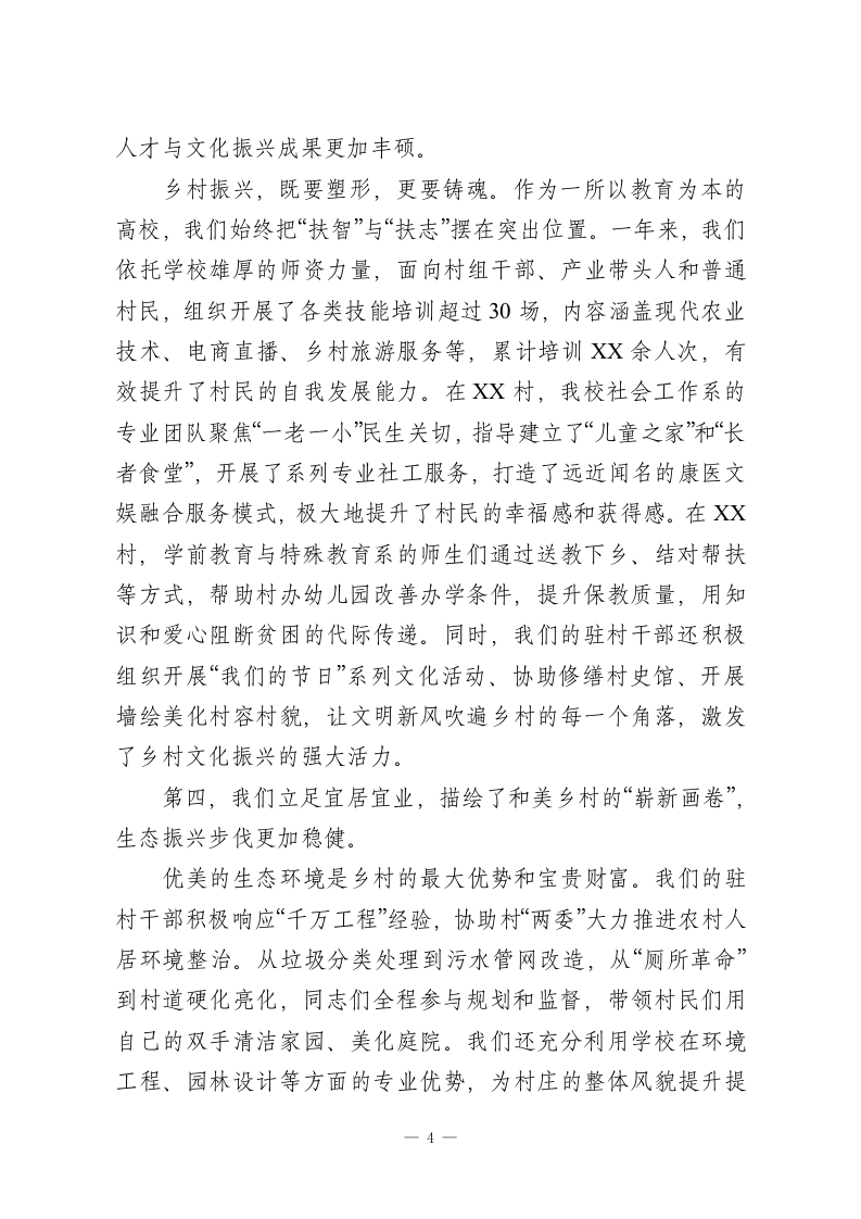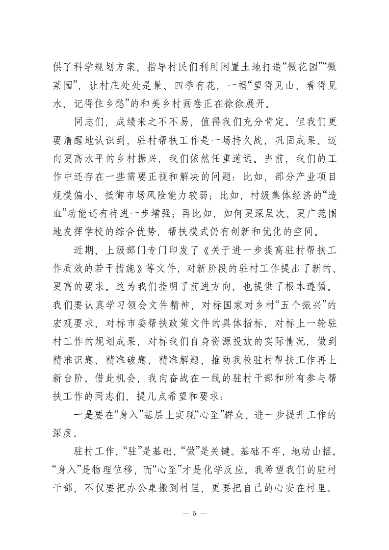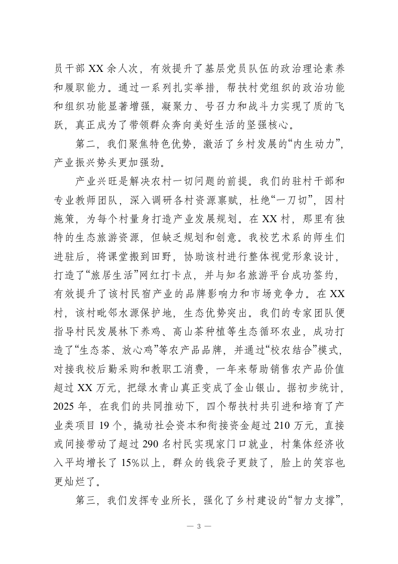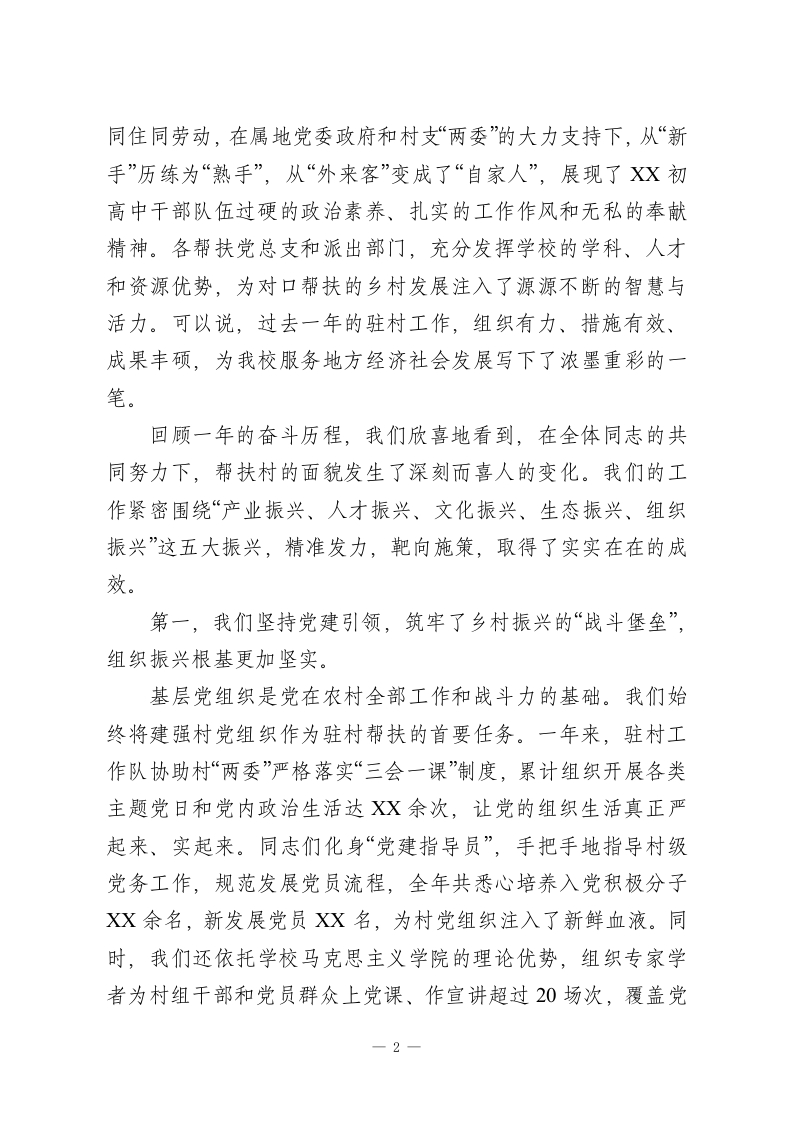 在XX初高中党委2025年驻村工作总结会议上的讲话同志们:今天,我们在这里召开2025年学校党委驻村工作总结会议,主要任务是全面回顾和总结过去一年我校驻村帮扶工作的成绩与经验,深入分析当前面临的形势与挑战,并对下一阶段的工作进行谋划和部署。刚才,我们听取了派驻XX市XX村、XX村、XX村、XX村的4位驻村干部的年度工作汇报,也听取了社会工作系、艺术系、学前教育与特殊教育系、教务处等4个帮扶单位负责同志的交流发言。大家的汇报内容详实、情感真挚,既有对实践成果的系统梳理,也有对未来发展的深刻思考,充分展现了我校驻村干部扎根基层、担当作为的良好风貌,也体现了各派出单位倾情投入、倾力支持的责任担当。在此,我代表学校党委,向一年来辛勤奋战在乡村振兴第一线的全体驻村干部,以及在后方默默支持、积极参与的各级党组织和广大师生员工,表示衷心的感谢和崇高的敬意!2025年,是全面贯彻落实党的二十大精神的关键之年,也是巩固拓展脱贫攻坚成果同乡村振兴有效衔接的深化之年。一年来,学校党委坚决贯彻落实市委、市政府的决策部署,以高度的政治责任感和历史使命感,扎实推进驻村帮扶工作。我们顺利完成了新老驻村干部的轮换交接,新一批选派的同志们不负重托,迅速转换角色,以饱满的热情和昂扬的斗志投身到波澜壮阔的乡村振兴实践中。你们扎根在田间地头,与群众同吃1