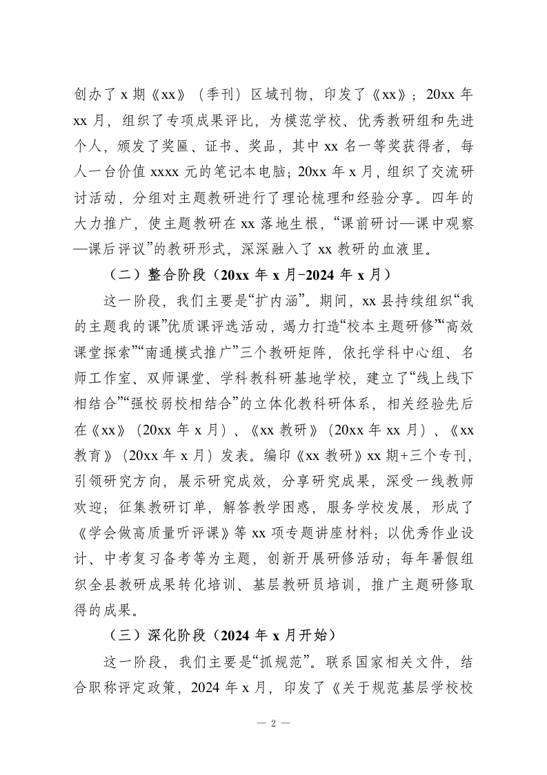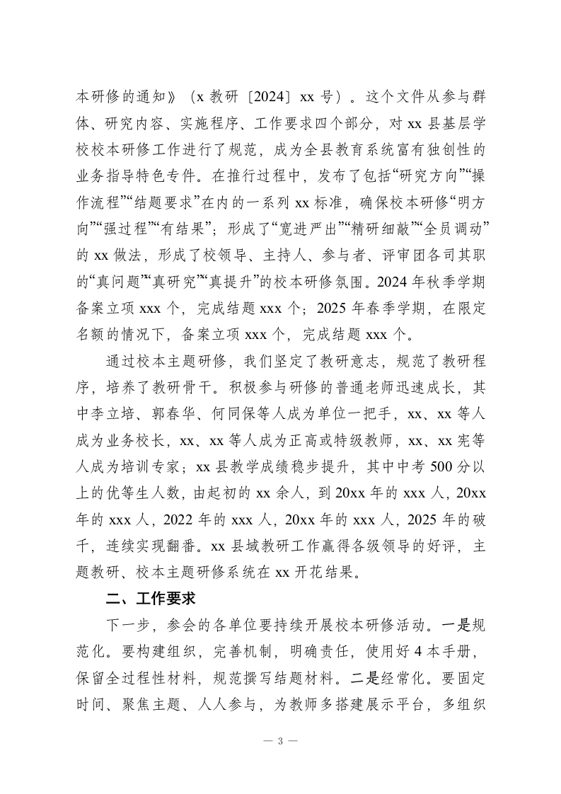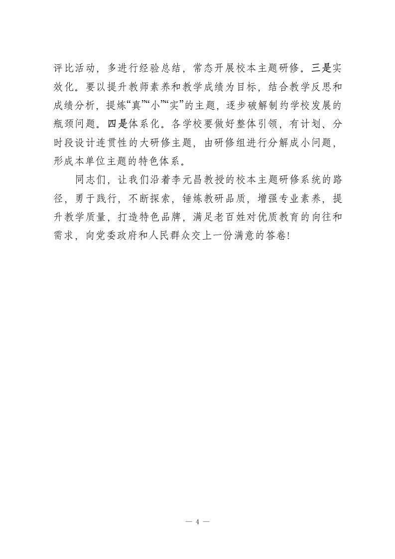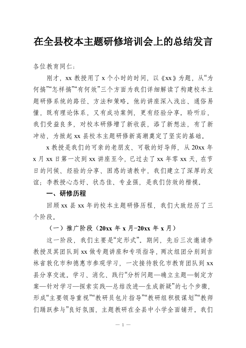 在全县校本主题研修培训会上的总结发言各位教育同仁:刚才,Xx教授用了x个小时的时间,以《xx》为题,从“为何搞”“怎样搞”“有何效”三个方面为我们详细解读了构建校本主题研修系统的路径、方法和策略。他的讲座深入浅出、通俗易懂,既有理论体系,又有成功案例,更有经验分享。聆听后,我们受益良多,对校本研修增了新收获,添了新想法,有了新冲动,为掀起x县校本主题研修新高潮奠定了坚实的基础。x教授是我们的可亲的老朋友、可敬的好导师,从20xx年x月Xx日第一次到Xx讲座至今,已过去了Xx年零Xx天,在节日的问候、经验的分享、困惑的请教中,我们建立了深厚的友谊;李教授心态好、状态佳、专业强,是我们仿效的楷模。一、研修历程回顾x县x年的校本主题研修历程,我们大致经历了三个阶段。(一)推广阶段(20xx年x月-20xx年X月)这一阶段,我们主要是“定形式”。期间,先后三次邀请李教授及其团队到x做专题讲座和专项指导,两次组团分别到吉林省敦化市和德惠市参观学习,一次接待敦化市教育团队到Xx县分享交流。学习、消化、践行“分析问题一确立主题一制定方案一针对学习一探索实践一总结改进一生成新疑”的七个步骤,形成“主要领导重视”“教研员包片指导”“教研组积极谋划”“教师们踊跃参与”良好氛围,主题教研在全县中小学全面铺开。我们1