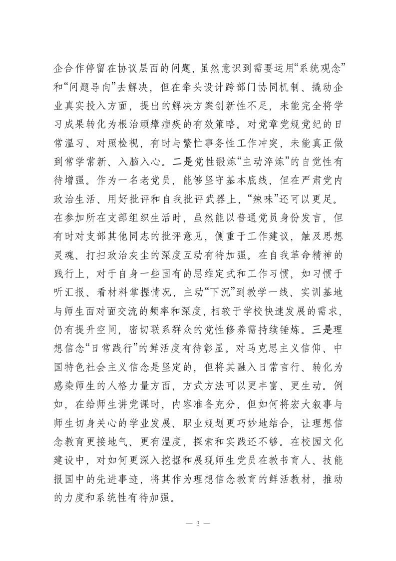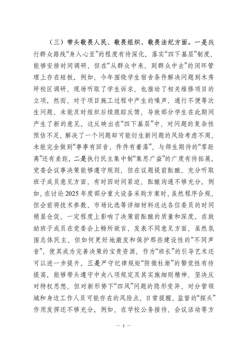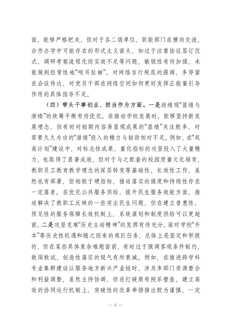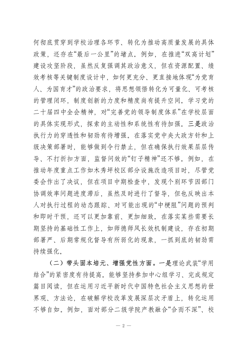 职业技术学院党委书记2025年度民主生活会个人对照检查材料(五个带头)根据本次民主生活会主题要求,本人紧扣深入学习贯彻习近平新时代中国特色社会主义思想,全面贯彻落实党的二十届三中、四中全会精神,以及锲而不舍落实推进作风建设常态化长效化的核心要义,在深入开展学习研讨、广泛征求意见建议、坦诚进行谈心谈话的基础上,严格对照“五个带头”要求,紧密联系个人思想、职责和工作实际,进行了深刻的自我剖析和反思。现将个人对照检查情况报告如下。一、存在的主要问题(一)带头强化政治忠诚、提高政治能力方面。一是政治判断力的前瞻性和敏锐性有待加强。面对职业教育领域深刻变革和区域发展新形势,有时对潜在的风险挑战和机遇辨识不够及时、精准。例如,在谋划学校“十五五”发展规划前期工作时,虽然组织了多轮研讨,但对国家关于职业技术大学设置政策的深层导向和可能带来的连锁反应,研判的深度和预见性尚有不足,更多侧重于对标既有指标,导致部分规划内容的前瞻布局不够大胆,与地方产业未来需求的超前对接思考可以更进一步。在贯彻“稳定、发展、生态、强边”四件大事结合职业教育落地时,对“稳定”与“发展”的内在统一性把握,有时在具体工作部署中未能完全做到同步谋划、一体推进,存在一定的时序差。二是政治领悟力的贯通性和转化度有待提升。对党的创新理论,特别是关于教育、科技、人才“三位一体”战略部署的理解,如一1