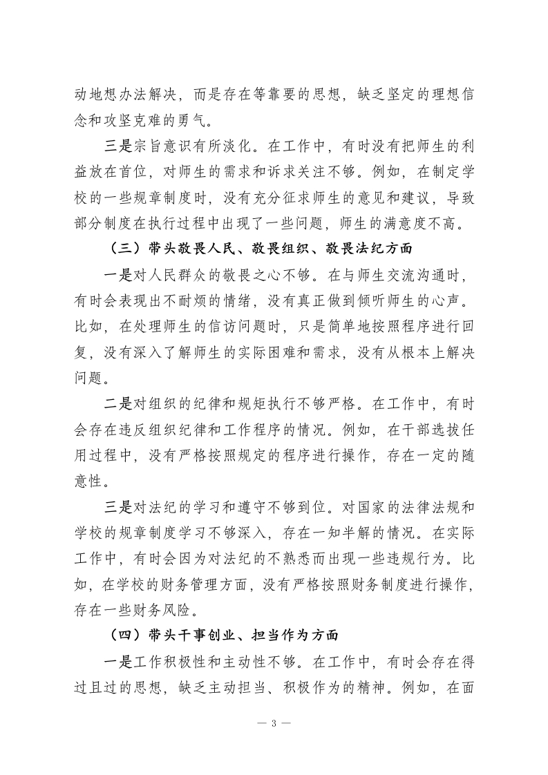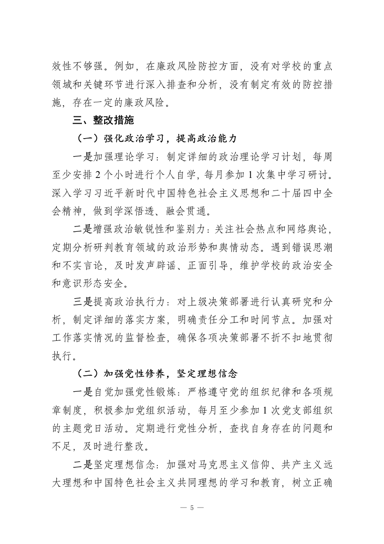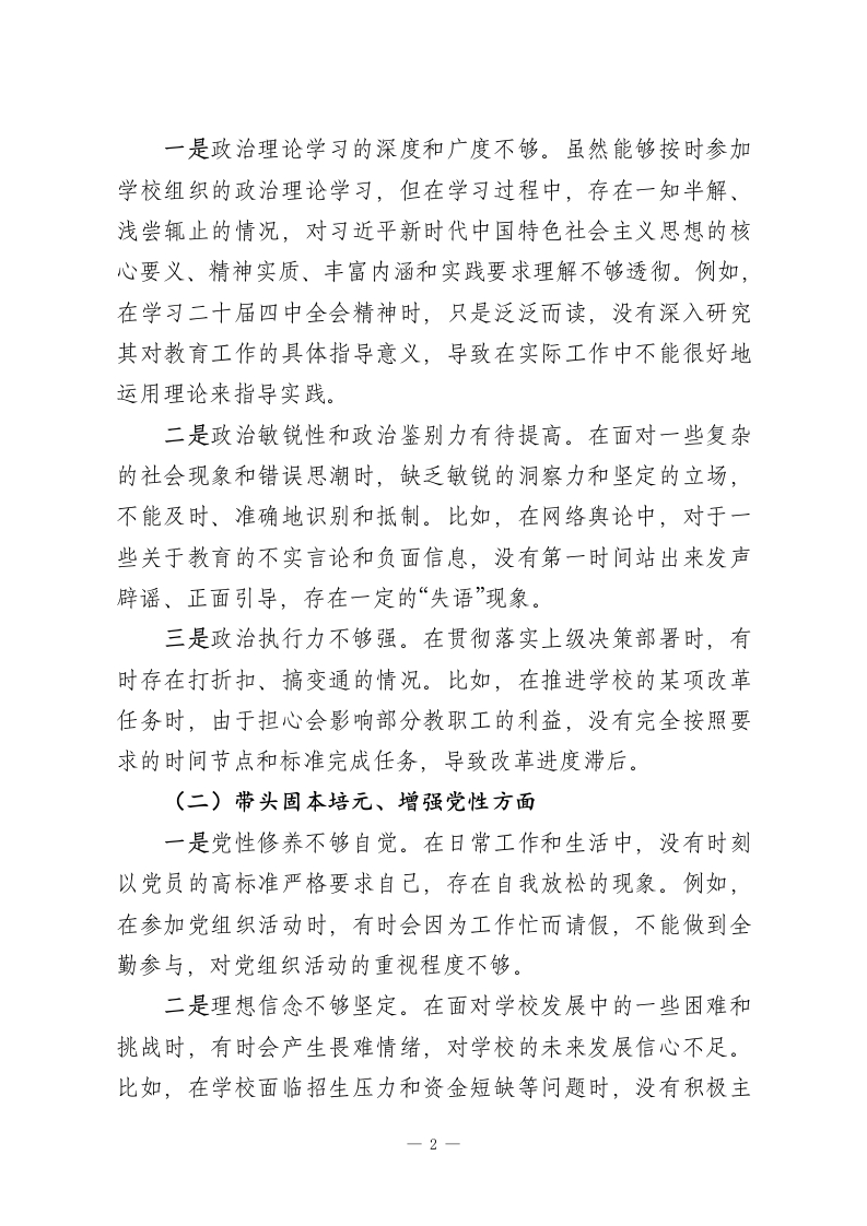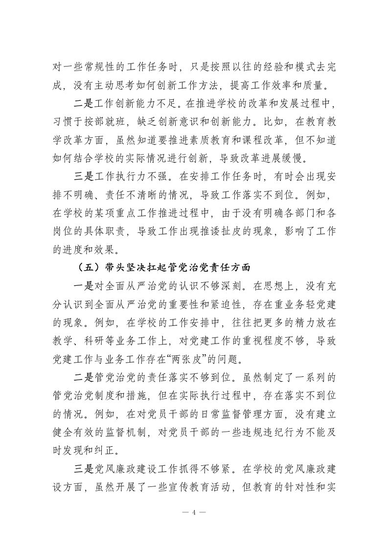 2025年学校领导干部民主生活会对照检查发言材料(五个带头)各位领导、同志们:按照本次民主生活会的要求,我聚焦“五个带头”,紧密结合2025年学习贯彻习近平新时代中国特色社会主义思想和二十届四中全会精神情况、贯彻落实中央八项规定精神、深化作风建设情况以及履行全面从严治党责任情况,深入查摆问题,深刻剖析原因,明确整改方向。现将对照检查情况汇报如下:一、会前学习的思想认识和学习体会会前,我通过参加集中学习、个人自学等方式,深入学习了习近平新时代中国特色社会主义思想和二十届四中全会精神。通过学习,我进一步认识到,习近平新时代中国特色社会主义思想是当代中国马克思主义、二十一世纪马克思主义,是中华文化和中国精神的时代精华,实现了马克思主义中国化时代化新的飞跃。二十届四中全会为我们在新时代新征程上推进各项事业发展指明了前进方向、提供了根本遵循。在学习过程中,我深刻体会到,作为学校领导干部,必须旗帜鲜明讲政治,不断提高政治判断力、政治领悟力、政治执行力,始终在思想上、政治上、行动上同以习近平同志为核心的党中央保持高度一致。同时,要将学习成果转化为推动学校事业高质量发展的实际行动,努力办好人民满意的教育。二、存在问题(一)带头强化政治忠诚、提高政治能力方面-1