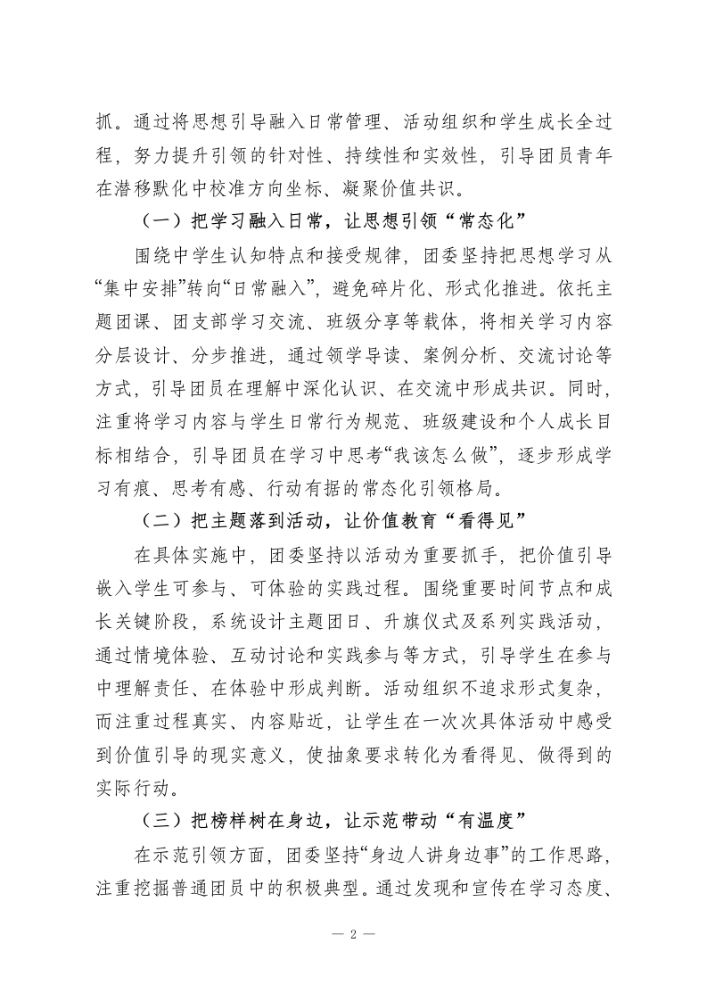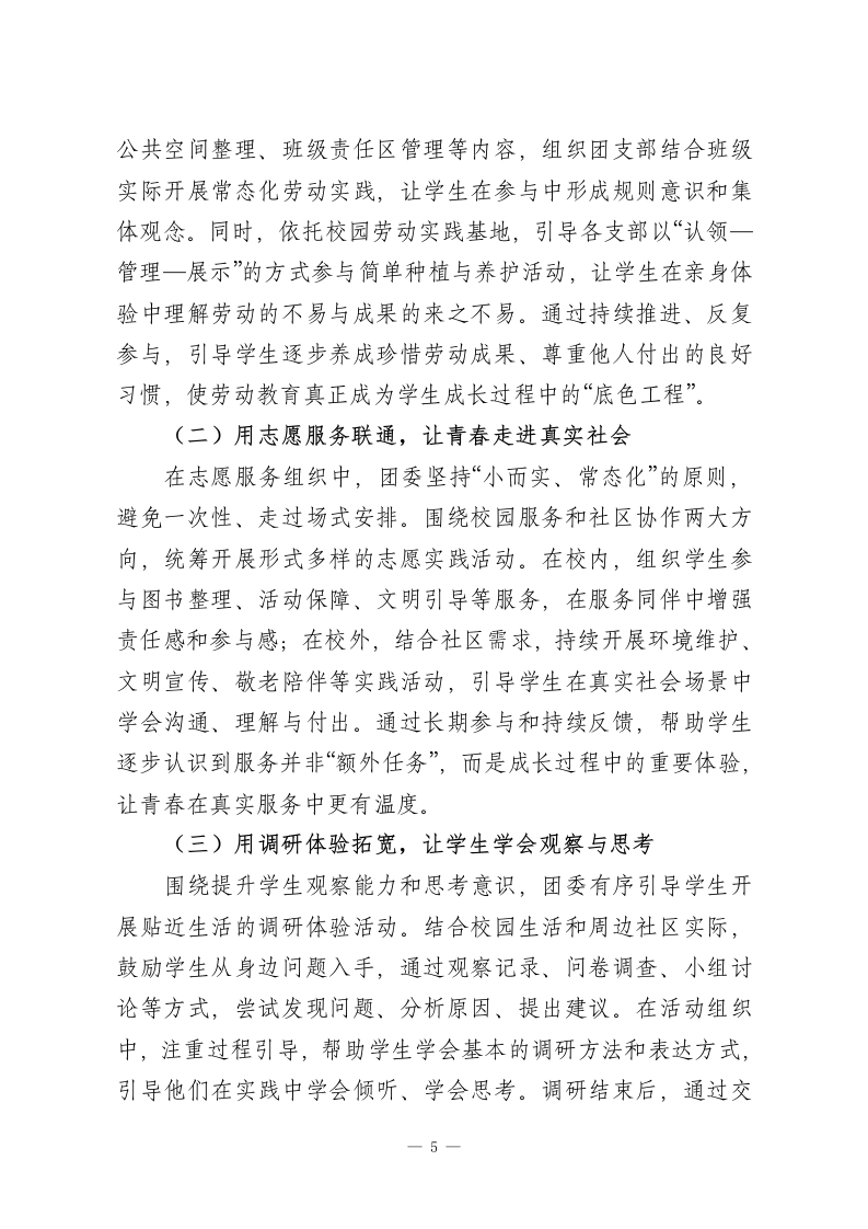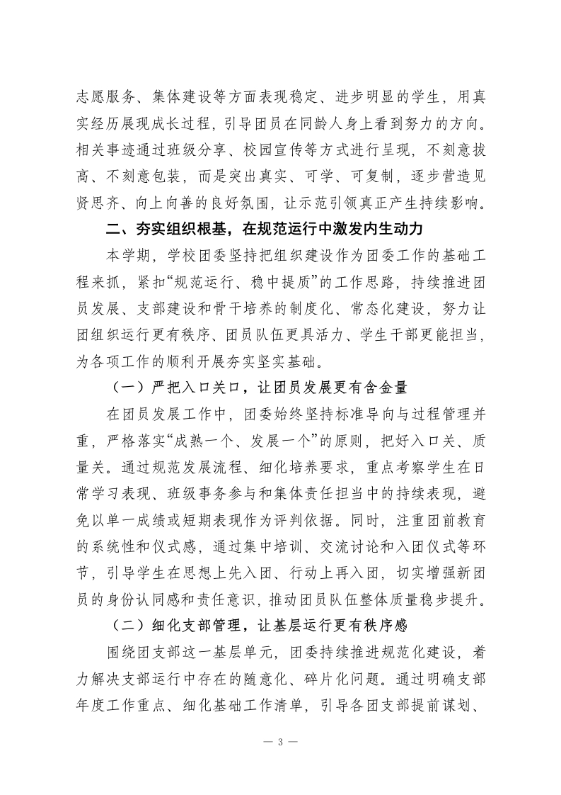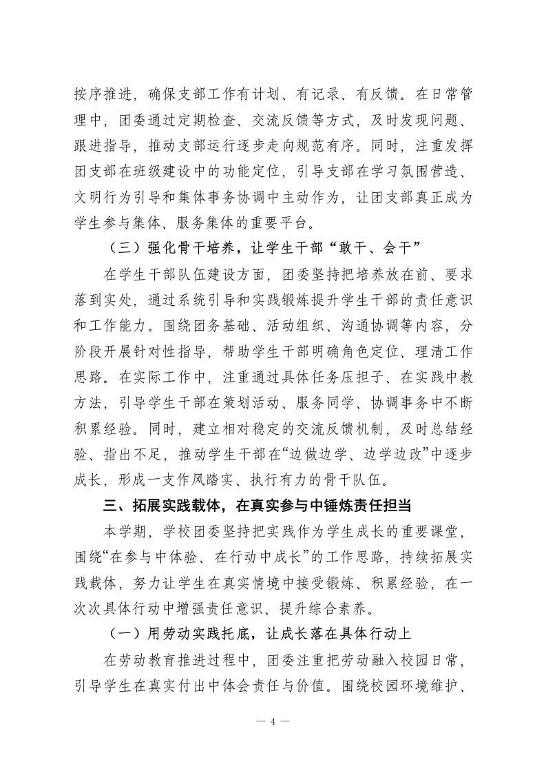 2025-2026第一学期团委书记工作总结一一不是往前站,而是往下扎这几年在团委岗位上的工作经历,让我对“岗位”这两个字有了更成熟的理解。起初,更关注的是任务是否完成、安排是否落实;而在一次次具体工作的推进中,我慢慢意识到,真正重要的并不是“做了多少事”,而是在这个位置上,能不能把事情接住、把节奏稳住,让工作持续向前。团委工作的推进,从来不是依靠某一个人完成的。整体方向来自学校的统筹安排,具体落实依托清晰的工作流程,执行过程依靠团队协作,最终效果也往往是在不断磨合中逐步显现。团委所承担的角色,是在这些环节之间做好衔接:把任务理清、把路径走通、把资源用在更需要的地方,让工作推进更顺畅、成效更稳定。基于这样的认识,2025年秋季学期,学校团委始终围绕学生成长实际,坚持贴近校园生活、贴近学生需求的工作取向,在思想引导、组织建设、实践活动、校园文化和成长服务等方面持续推进、稳步落实,努力把团委工作真正融入学生的日常学习与校园生活之中。现将本学期相关工作情况总结如下。一、把牢方向坐标,在持续引领中凝聚青春共识本学期,学校团委始终锚定立德树人根本任务,紧密围绕学校中心工作和中学生成长实际,坚持以贴近实际、贴近生活、贴近学生为基本原则,把方向引领作为团委工作的首要工程来