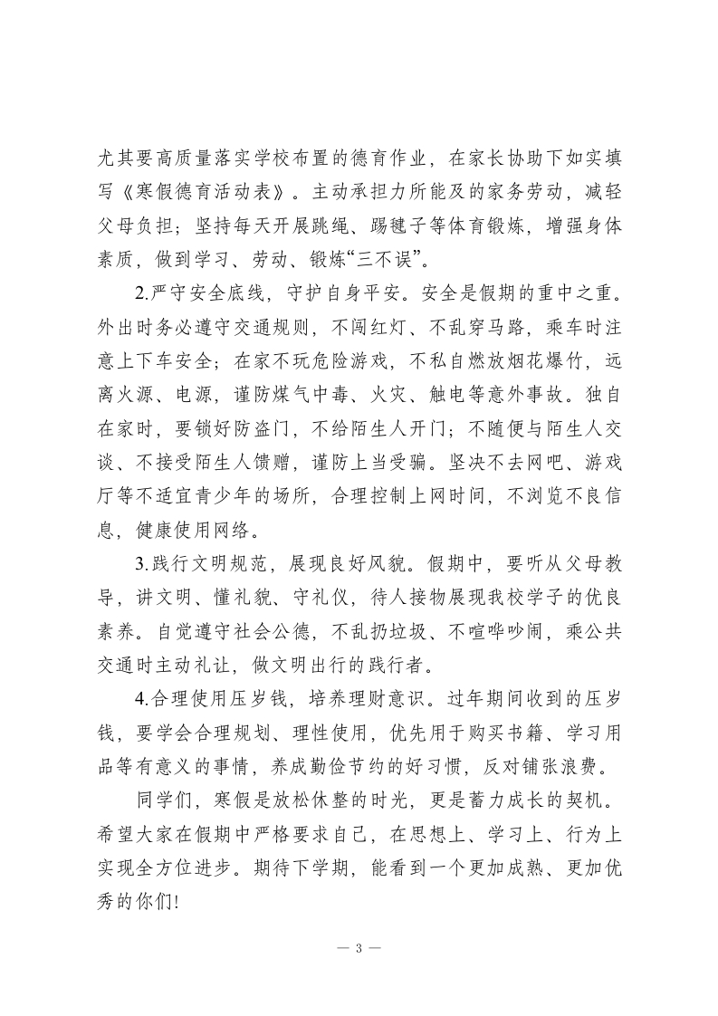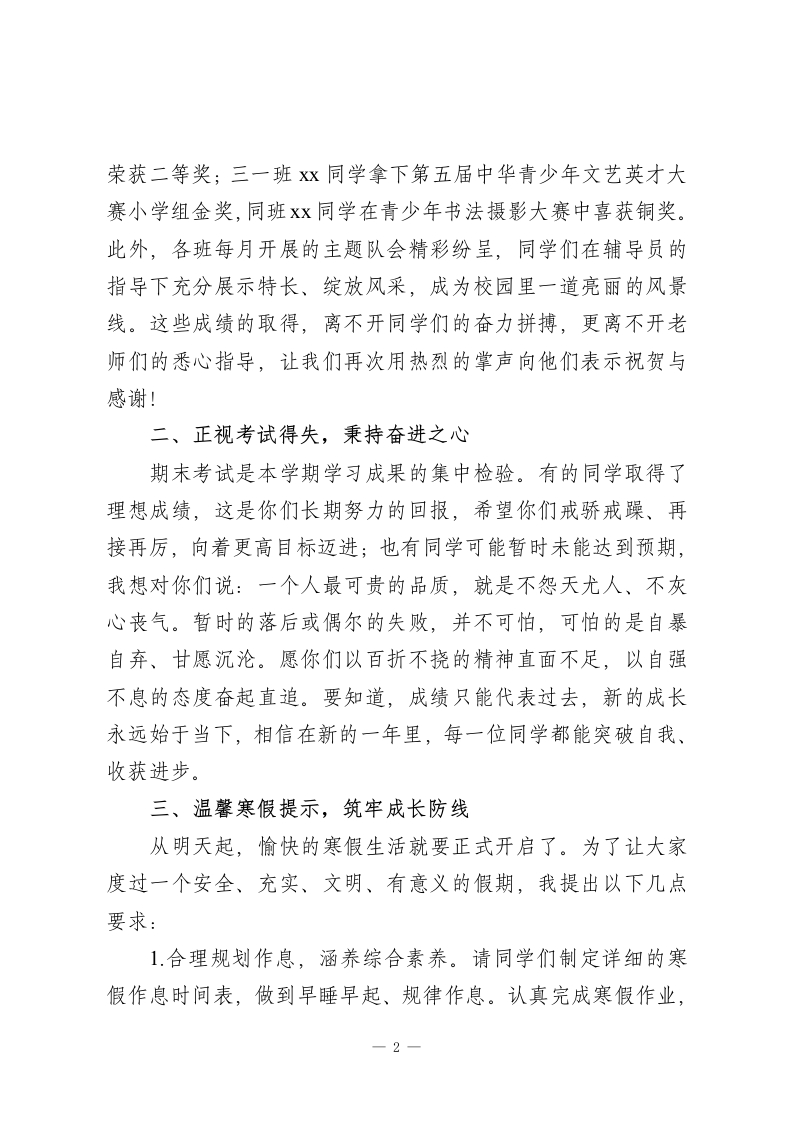 2025-2026学年秋季学期寒假休业式德育副校长讲话:蓄力成长,平安度寒假各位老师、同学们:大家好!时光匆匆,本学期已圆满落幕。回望这一学期,每一天都镌刻着大家的努力与思索,每一刻都见证着成长与收获。我们不仅在课堂上汲取了知识养分,更在实践中收获了自信与喜悦,涵养了高尚品德与文明言行。在此,我代表学校,向一学期来辛勤耕耘、无私奉献的全体班主任和学科教师,致以最衷心的感谢!也向勤奋好学、不断进步,在各方面取得优异成绩的全体同学,送上最真诚的祝贺!一、回顾学期亮点,见证成长足迹本学期,学校以养成教育为核心,深入推进文明礼仪、爱校爱班主题教育,校园文明风尚持续向好。在纪律卫生评比中,一批班级脱颖而出:纪律流动红旗前三名分别是一一班、二一班、三一三二班(并列第三);卫生流动红旗前三名是五一班、四一班、三一班。从结果来看,低年级同学在纪律养成上表现突出,高年级同学则在卫生维护上更为扎实,希望下学期大家能取长补短,实现全面提升。在特长培养与赛事比拼中,同学们大放异彩。我校学子在区级各类比赛中屡获佳绩:田径队同学刻苦训练,Xx同学在区级运动会100米项目中斩获第三名;xx同学在xx杯作文竞赛中1