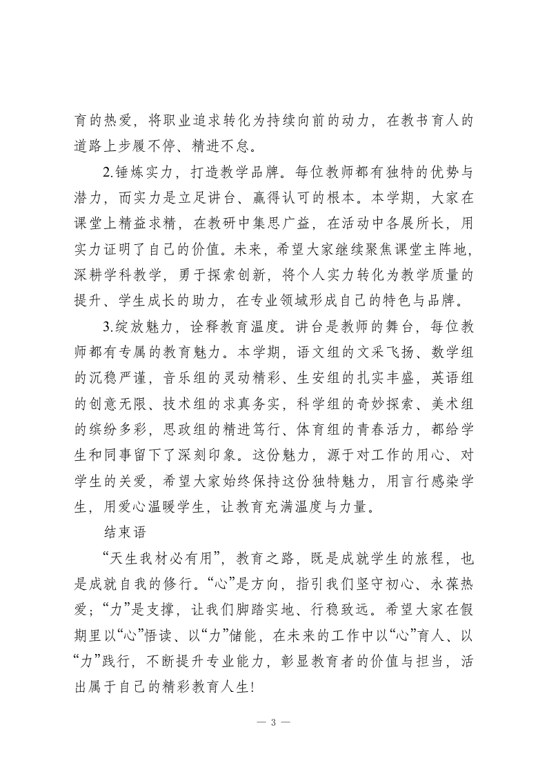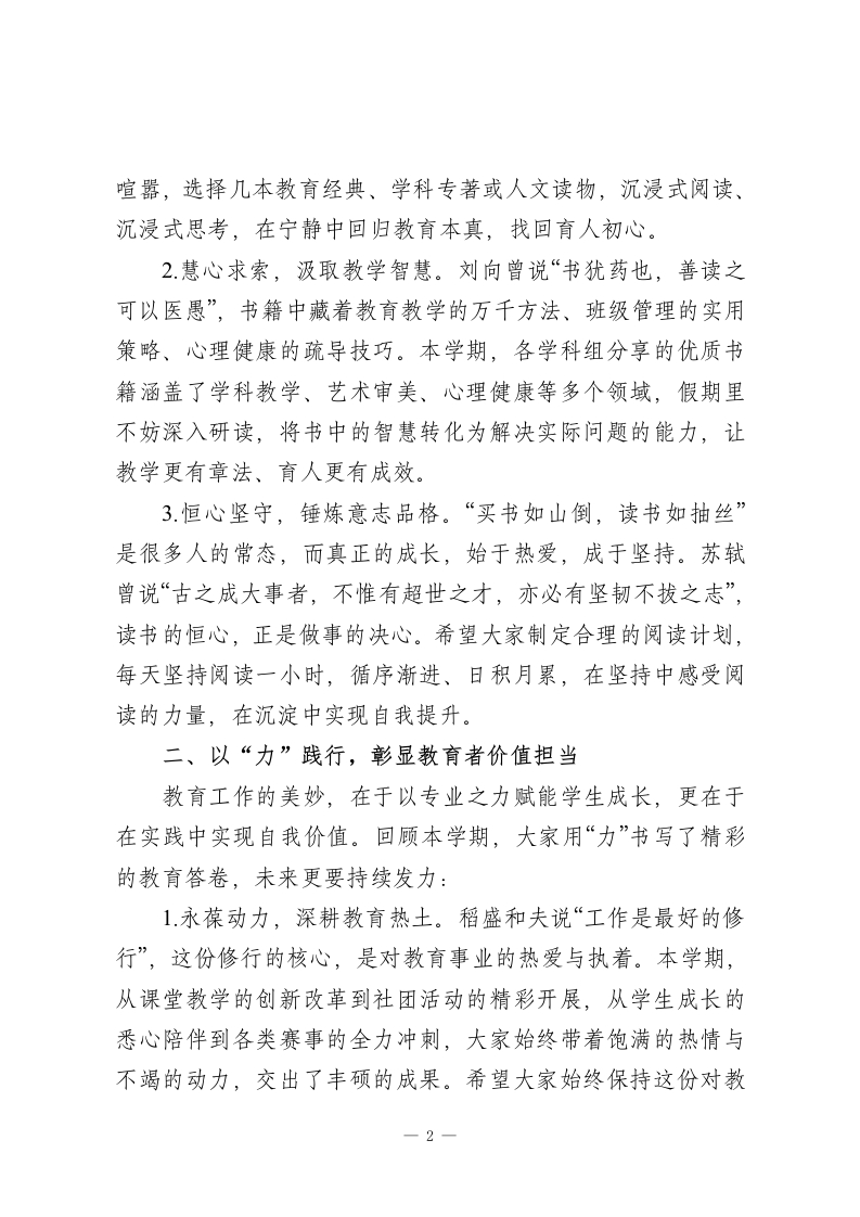 2025-2026学年秋季学期期末全校教师大会,校长讲话:以心为基,以力为翼,精进专业行致远各位老师:大家下午好!苏东坡有首《琴诗》写道:“若言琴上有琴声,放入匣中何不鸣。若言声在指头上,何不于君指上听。”这首诗蕴含着深刻哲理:琴声的产生,既离不开琴的底蕴,也少不了指尖的灵动,二者相辅相成、缺一不可。这恰如我们的教育事业:读书,需书籍与思维碰撞方能收获真知;工作,需教师与学生共鸣才可成就实效。今天,我想围绕“心”与“力”两个字,与大家总结本学期工作,更探讨假期与未来的专业成长之路一一而这两个字的灵感,源自毛主席青年时代的雄文《心之力》,文中“宇宙即我心,我心即宇宙”的磅礴气魄,正契合教育者应有的格局与追求。一、以“心”悟读,筑牢专业成长根基读书是教师的精神修行,更是专业提升的源头活水。假期正是沉心阅读的黄金时期,希望大家带着三颗“心”,在书海中汲取养分:1.静心沉潜,沉淀教育初心。诸葛亮在《诫子书》中言“静以修身”,在浮躁的当下,唯有静下心来,才能与书籍深度对话,与灵魂坦诚交流。希望大家暂时卸下工作的忙碌,远离外界的1