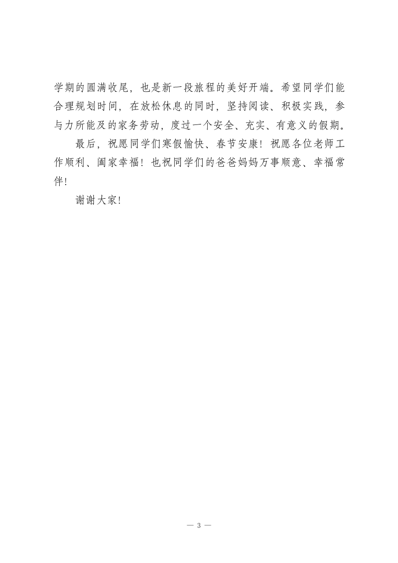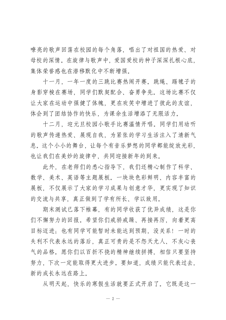 2025-2026学期寒假休业式校长讲话:回望精彩,奔赴美好寒假敬爱的老师、亲爱的同学们:大家上午好!冬日暖阳洒满校园,愉快的秋季学期已近尾声,期待已久的寒假正向我们走来。回望这一学期,每一天都镌刻着我们的奋斗足迹,每一刻都见证着我们的成长蜕变。早读课上,琅琅书声唤醒校园活力;课堂之上,大家专注倾听、踊跃发言,在思维碰撞中汲取知识养分;课间时光,文明问候、有序活动,彰显着良好风貌。还有每日午间的十分钟习字、每周的读书日、每月更新的主题板报,以及上午第一节课后的全员晨跑,这些点滴细节,不仅丰富了校园生活,更让我们在潜移默化中提升了综合素质,让校园焕发出蓬勃生机。这一学期,学校精心策划了一系列丰富多彩的活动,为大家搭建了展示自我、收获成长的广阔平台,让我们一同重温那些难忘的精彩瞬间:九月,校园广播操比赛如期举行。12个班级的同学们精神抖擞、动作整齐,用规范的姿态、饱满的热情展现着青春风采。这场比赛不仅让全校广播操质量显著提升,更培养了大家挺拔的身姿与团队协作精神,增强了班级凝聚力和集体荣誉感,是对我们精神风貌的一次精彩检阅。十月,国歌校歌比赛激情唱响。同学们与老师并肩排练,1