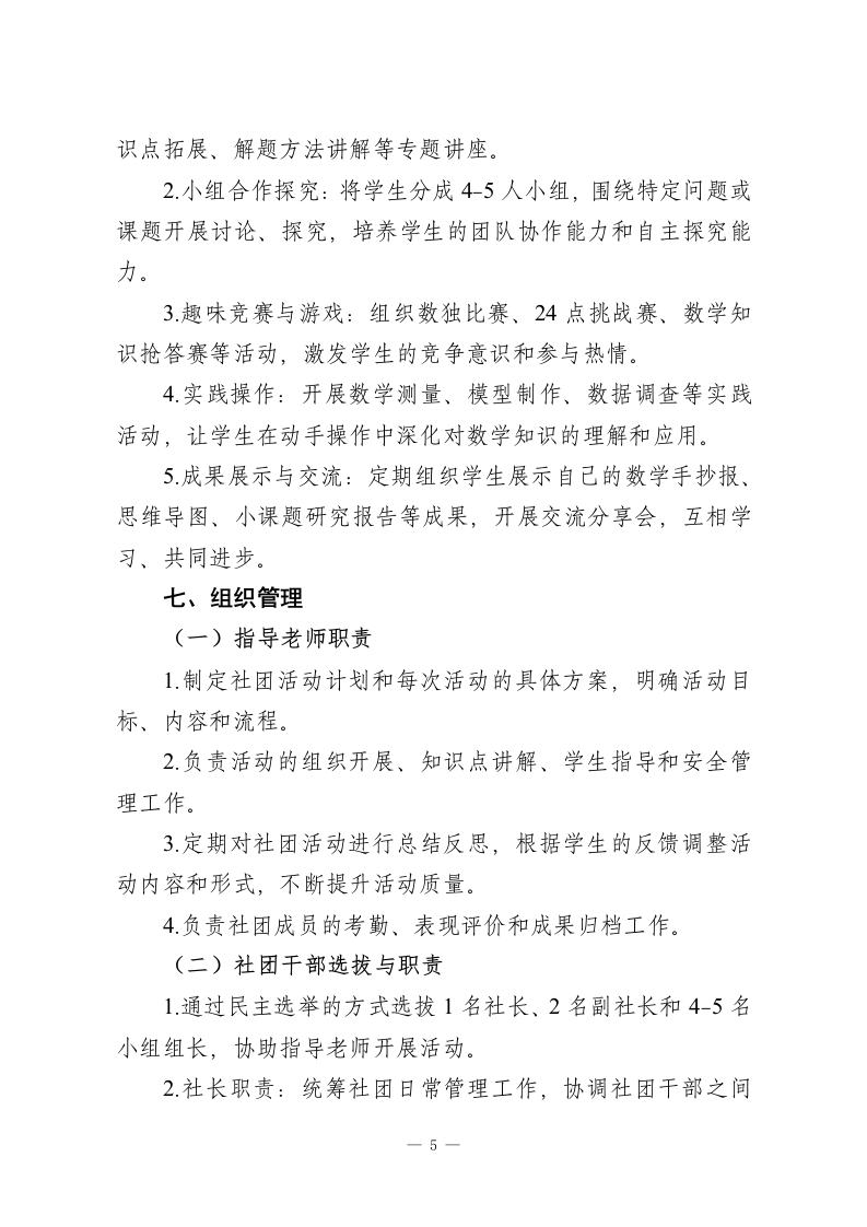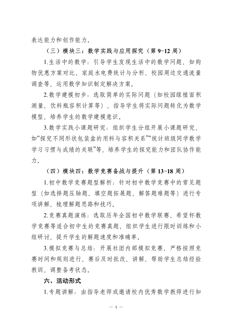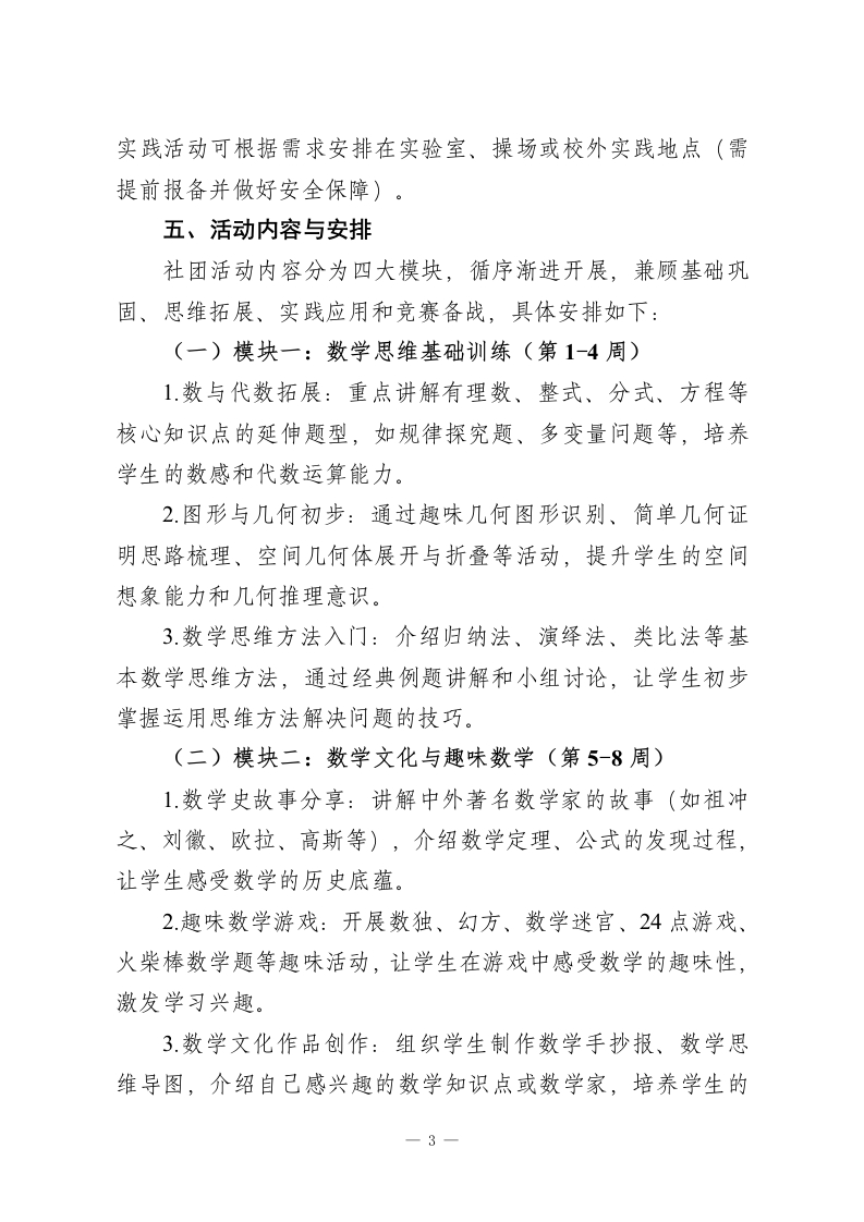 2025年度初中数学社团活动计划一、指导思想本社团以《义务教育数学课程标准(2022年版)》为指导,立足初中数学学科特点,秉持“激发兴趣、拓展思维、提升素养、培养能力”的宗旨。通过开展丰富多彩的数学实践活动、思维训练课程和学科竞赛,打破传统课堂的界限,让学生在轻松愉快的氛围中感受数学的魅力,培养学生的逻辑推理能力、抽象思维能力、创新实践能力和团队协作精神,助力学生树立学好数学的信心,为学有余力的学生提供更高层次的数学学习平台,促进学生数学核心素养的全面发展。二、活动目标(一)知识与技能目标1.帮助学生巩固初中数学课本核心知识,拓展数学知识面,了解数学在生活、科技、文化等领域的广泛应用。2培养学生的数学思维能力,包括逻辑推理、归纳总结、类比迁移、空间想象等,提升学生解决复杂数学问题的能力。3.引导学生掌握基本的数学探究方法,学会运用数学知识分析和解决实际问题,初步形成数学建模意识。(二)过程与方法目标1.通过小组合作、自主探究、竞赛比拼等多种活动形式,让学生主动参与数学学习过程,体验数学发现和创造的乐趣。2培养学生良好的学习习惯,如勤于思考、乐于钻研、善于总结、勇于质疑的习惯,提升学生的自主学习能力。1