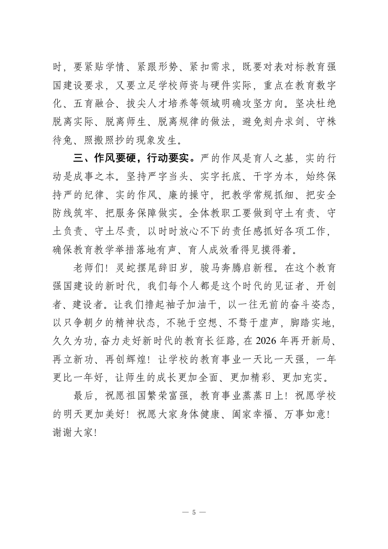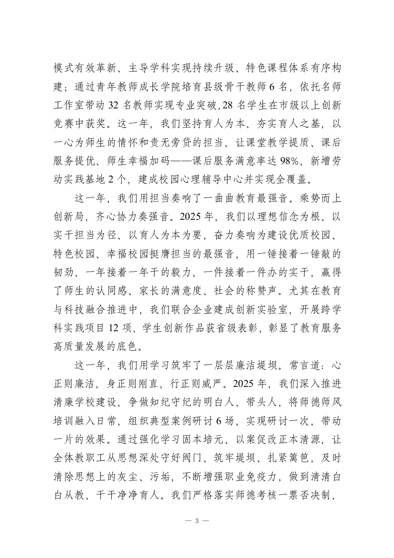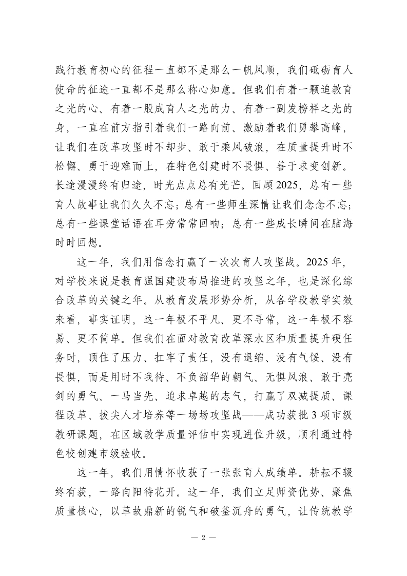 2025年度学校期末工作总结大会上,校长讲话:以匠心育新人,以同心赴新途老师们:寒来暑往,薪火相传。值此冬去春来、辞旧迎新的特殊时刻,首先我要向全校每一位辛勤耕耘的老师致以最诚挚的问候和最衷心的感谢!过去一年,大家扎根讲台、潜心育人,在晨曦中迎接学生,在星光下批改作业,用爱心守护成长,用智慧启迪心灵,在备课教研中精益求精,在课后服务中无私奉献。正是你们的默默坚守与辛勤付出,才有了学校的稳步发展和孩子们的全面进步。你们辛苦了!岁月不居,时栉如流。又是一季梅花开,又是一年春绿来。在这个冬去春来的关键时期,在这个辞旧迎新的特殊时刻,我们又迎来一年一度的收官战,一年一次的开局篇。古人云:思者进,不思则退;思者新,不思则旧。唯善思者胜,唯善思者新。对于我们教育人来说,既要思好往年育人事,又要思好来年办学事;既要干好当下教学事,又要谋好今后发展事。因此,我们不能放松、不能停歇、不能止步,要继续团结一致向前看、披荆斩棘向前冲、脚踏实地向前干,一步步推进、一点点积累、一项项落实,用我们的担当作为为学校的发展之车助力,用我们的辛苦汗水为师生的成长之花浇灌,让校园变得越来越美好,让师生过得越来越幸福。老师们!星光不问赶路人,时光不负有心人。时光记载着我们深耕教育的步伐,岁月见证着我们立德树人的奋斗。我们1