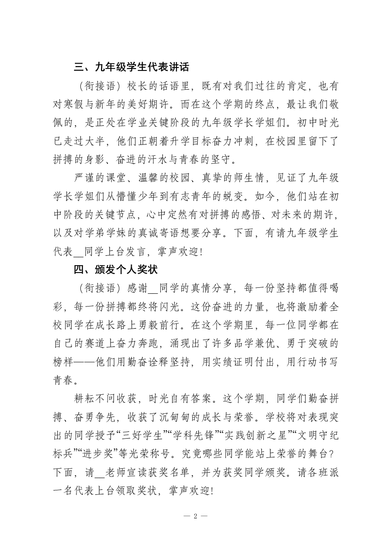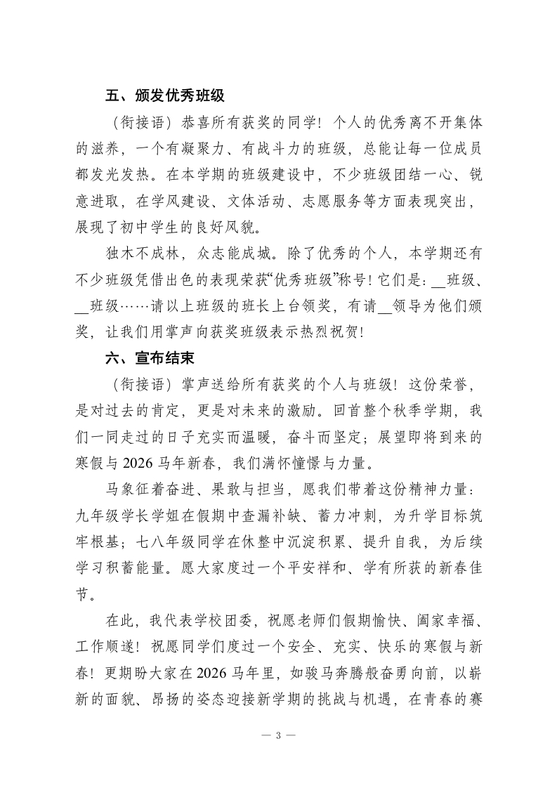 2025年秋季学期初中学校散学典礼主持词一、宣布开始敬爱的老师们,亲爱的同学们:大家早上好!“时光荏苒,岁月如歌。”转眼间,2025年秋季学期的学习征程即将圆满落幕。在这一段紧张有序、笃行不怠的时光里,我们一同探索知识、砥砺品格,在成长的道路上又镌刻下坚实的足迹。本学期,在老师们的悉心引领与无私奉献下,我们收获了学识的成长、友谊的温暖与责任的担当。此刻,让我们用最热烈的掌声,向辛勤耕耘的老师们致以最诚挚的敬意与感谢!下面,我宣布:中学2025年秋季学期散学典礼,现在开始!二、校长讲话(衔接语)一份耕耘一份收获,一个学期的成长离不开学校的悉心培育与方向指引。在寒假与2026马年新春即将到来的特殊时刻,我们更需聆听校领导的殷切嘱托,为假期生活筑牢安全防线,为新一年的逐梦之路凝聚奋进力量。挥手作别秋学期,满怀期待迎寒假。相信同学们早已对假期充满憧憬,如何让这个寒假过得安全、充实、有意义?如何带着马年的昂扬斗志,在假期中沉淀自我、蓄力成长?接下来,让我们用热烈的掌声,有请黄校长为我们送上假期寄语与殷切期望!感谢黄校长的谆谆教诲,让我们牢记嘱托,不负韶华!-1
