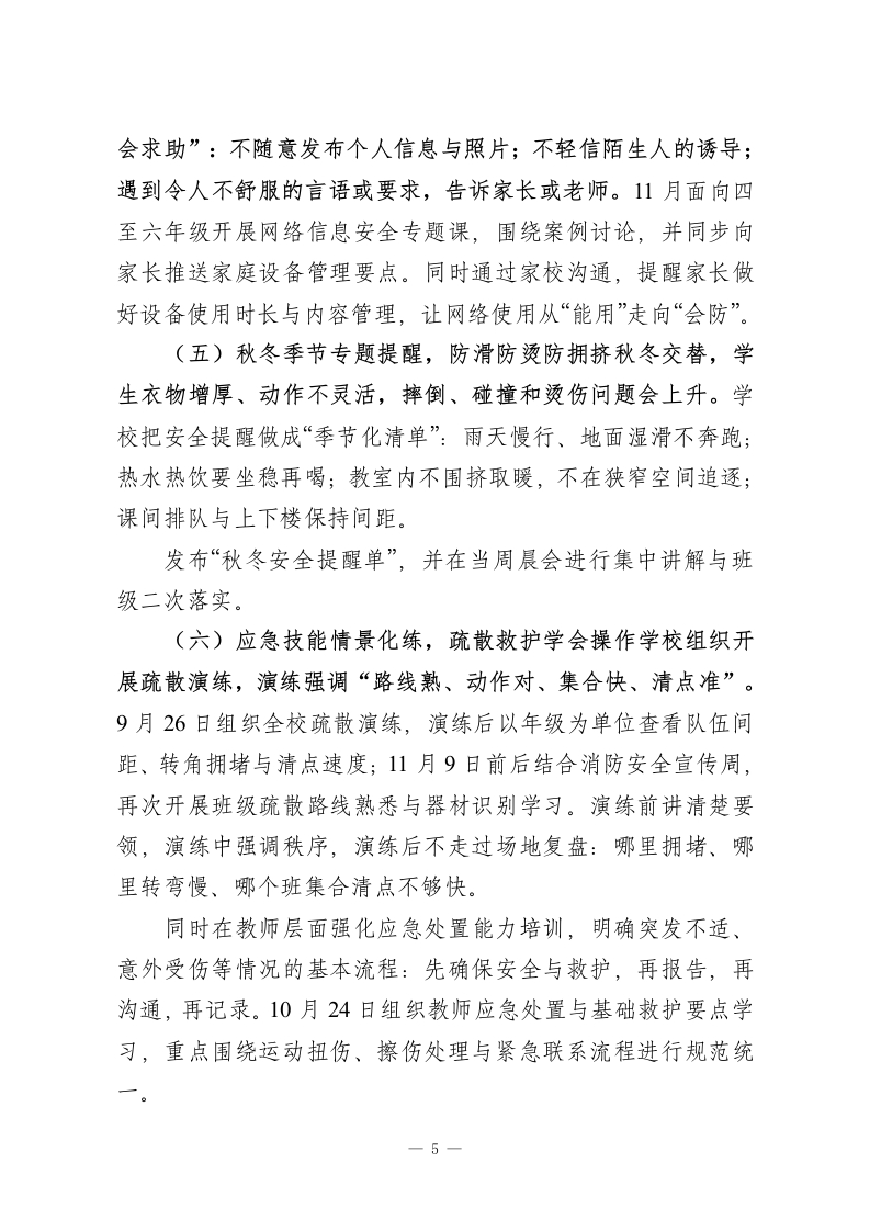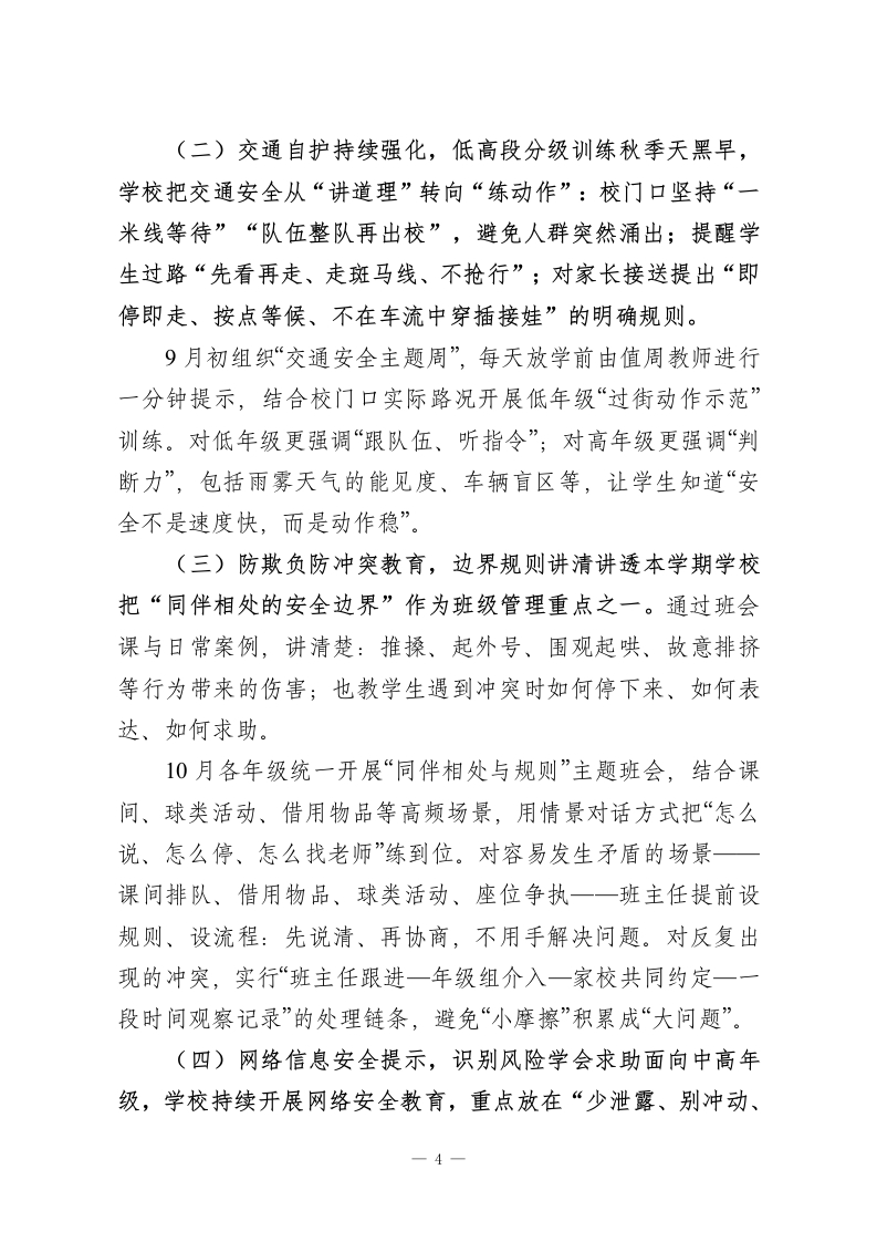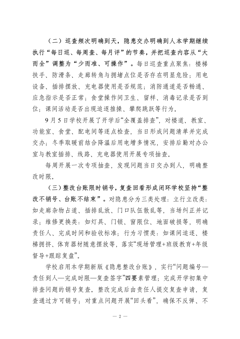 2025年秋季学校安全工作总结我们一直强调把安全抓在“时间点”和“现场里”,让校园的安全不是靠运气,而是靠日复一日的落实。以岗位责任为骨架,以巡查整改为闭环,以规则训练为抓手,以场景管控为重点,以卫生健康为保障。更重视“天天可执行、处处有人管、问题能清零”。回看一个学期,许多看似平常的动作一门口一米线的坚持、课间转角的站位、食堂留样是否到点、演练后是否复盘,这些共同构成了校园稳定的底盘。一、责任体系“压实到岗”,运行机制“闭环到位”(一)岗位清单逐项落地,带班值守不断档位学校坚持“事到人、岗到点、时到段”的原则,把安全工作从“谁都管一点”变为“每个点位都有人必须管”。本学期进一步细化了校级带班、值周教师、年级组值守、班主任跟班、科任教师课堂管理、后勤与食堂岗位规范、门卫保安操作流程等职责,形成可对照、可检查的岗位清单。9月1日开学前,学校对原有安全管理制度与岗位职责进行了集中修订,并组织全体教职工进行要点学习与落实。日常管理中,学校重点盯住“容易出问题的三段”:早晨入校、课间走廊楼梯、放学离校。带班人员每天按固定路线巡查,发现问题现场提醒、现场纠偏;能当场解决的立即处理,不能当场解决的进入台账。对学生密集的时段,坚持“有人在场、有人开口、有人负责”,让安全管理不是“写在纸上”,而是“站在现场”。