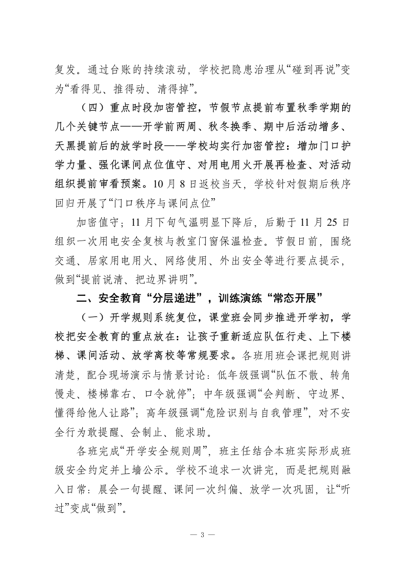 2025年秋季学校安全工作总结我们一直强调把安全抓在“时间点”和“现场里”,让校园的安全不是靠运气,而是靠日复一日的落实。以岗位责任为骨架,以巡查整改为闭环,以规则训练为抓手,以场景管控为重点,以卫生健康为保障。更重视“天天可执行、处处有人管、问题能清零”。回看一个学期,许多看似平常的动作一门口一米线的坚持、课间转角的站位、食堂留样是否到点、演练后是否复盘,这些共同构成了校园稳定的底盘。一、责任体系“压实到岗”,运行机制“闭环到位”(一)岗位清单逐项落地,带班值守不断档位学校坚持“事到人、岗到点、时到段”的原则,把安全工作从“谁都管一点”变为“每个点位都有人必须管”。本学期进一步细化了校级带班、值周教师、年级组值守、班主任跟班、科任教师课堂管理、后勤与食堂岗位规范、门卫保安操作流程等职责,形成可对照、可检查的岗位清单。9月1日开学前,学校对原有安全管理制度与岗位职责进行了集中修订,并组织全体教职工进行要点学习与落实。日常管理中,学校重点盯住“容易出问题的三段”:早晨入校、课间走廊楼梯、放学离校。带班人员每天按固定路线巡查,发现问题现场提醒、现场纠偏;能当场解决的立即处理,不能当场解决的进入台账。对学生密集的时段,坚持“有人在场、有人开口、有人负责”,让安全管理不是“写在纸上”,而是“站在现场”。