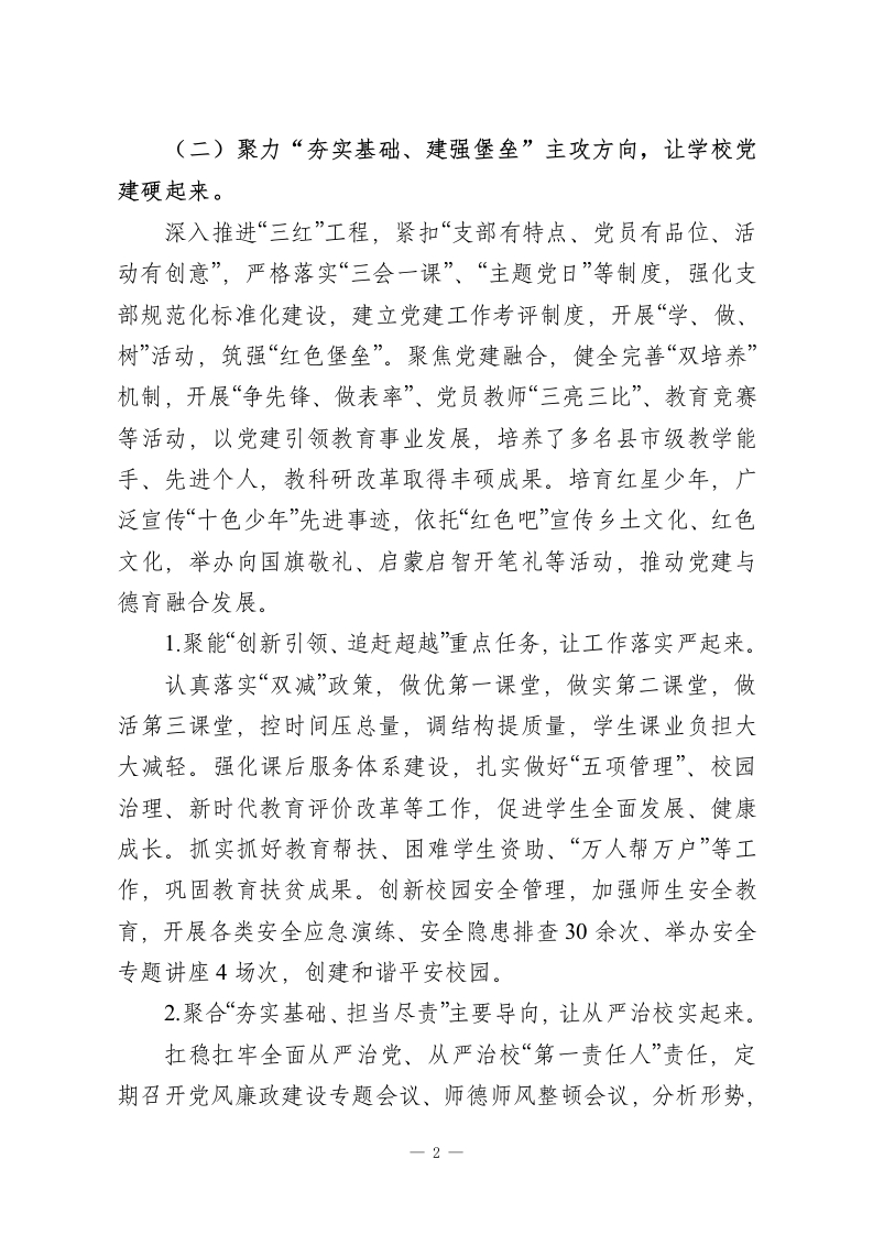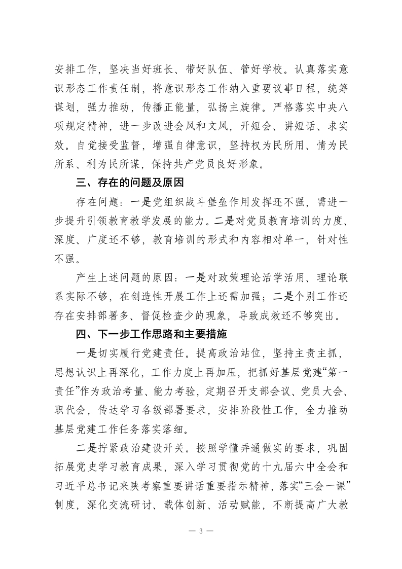 2025年学校党支部书记抓基层党建工作述职报告(四)按照局党委要求,现将我履行抓支部党建暨党风廉政建设工作情况报告如下:一、2025年度述职通报问题整改落实情况针对“缺乏抓强党建的意识”的问题,加强党的创新理论学习领会,定期召开会议研究党建工作、部署重点任务,建立党建工作清单,制定工作计划,积极推动党建工作任务落细落实。针对“党建带教师队伍建设的作用发挥不突出”的问题,充分发挥党员教师示范引领作用,扎实开展教育教学研究、青蓝工程、名师引领等作用,抓实抓牢师德师风整顿、教师行为规范,营造了积极向上、真抓实干的浓厚氛围。二、履职尽责情况(一)聚焦“立根铸魂、涵养初心”政治目标,让党员党性强起来。持续深化党史学习教育,围绕“学党史、悟思想、办实事、开新局”目标,专题学习、交流研讨等20余次,举办“学党史、听党话、感恩党、跟党走”主题演讲比赛等各类活动15次。以“我为群众办实事”实践活动为抓手,结合落实“双减”政策、课后服务改革,扎实做好困难学生帮扶,切实为学生办实事、为家长解难题。传承弘扬马栏红色基因,组织党员教师深入马栏革命纪念馆等地参观学习、现场体现,常态化开展党性政治体检,淬炼了初心、洗礼了灵魂、坚定了信念。1